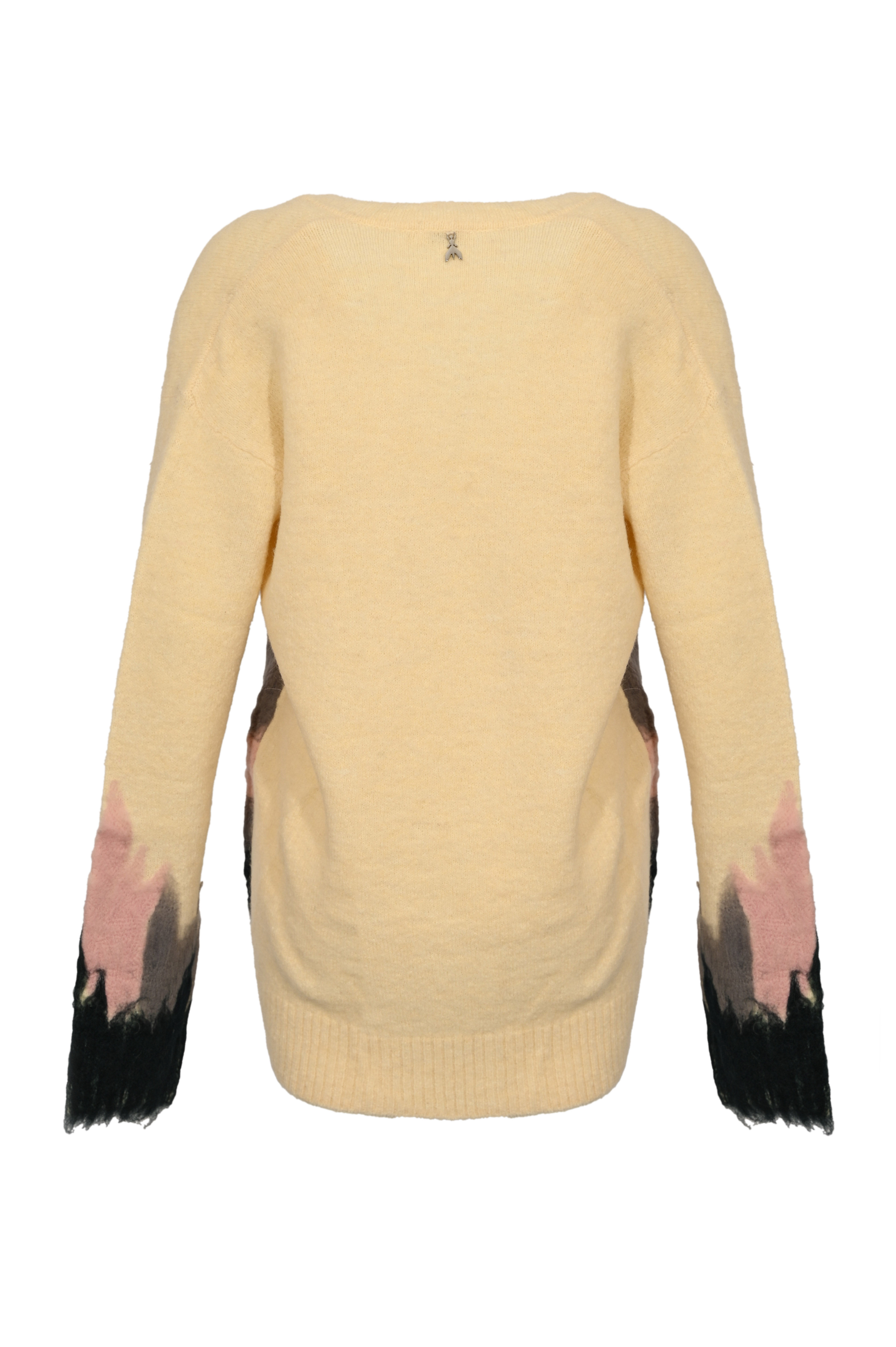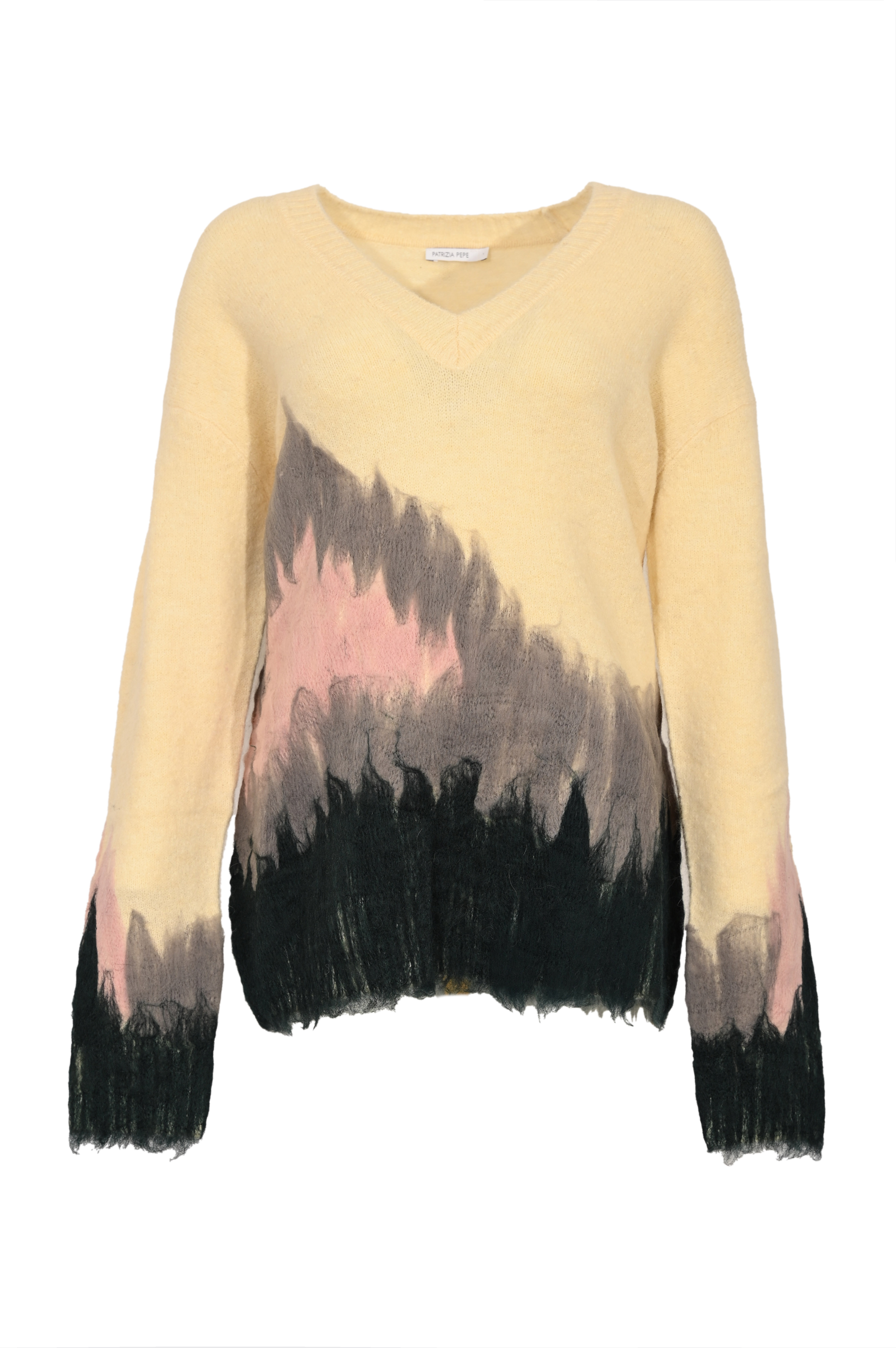 - Dettagli: lavorazione a maglia soffice, finiture sfrangiate sullorlo e sui polsini, effetto dipinto a mano