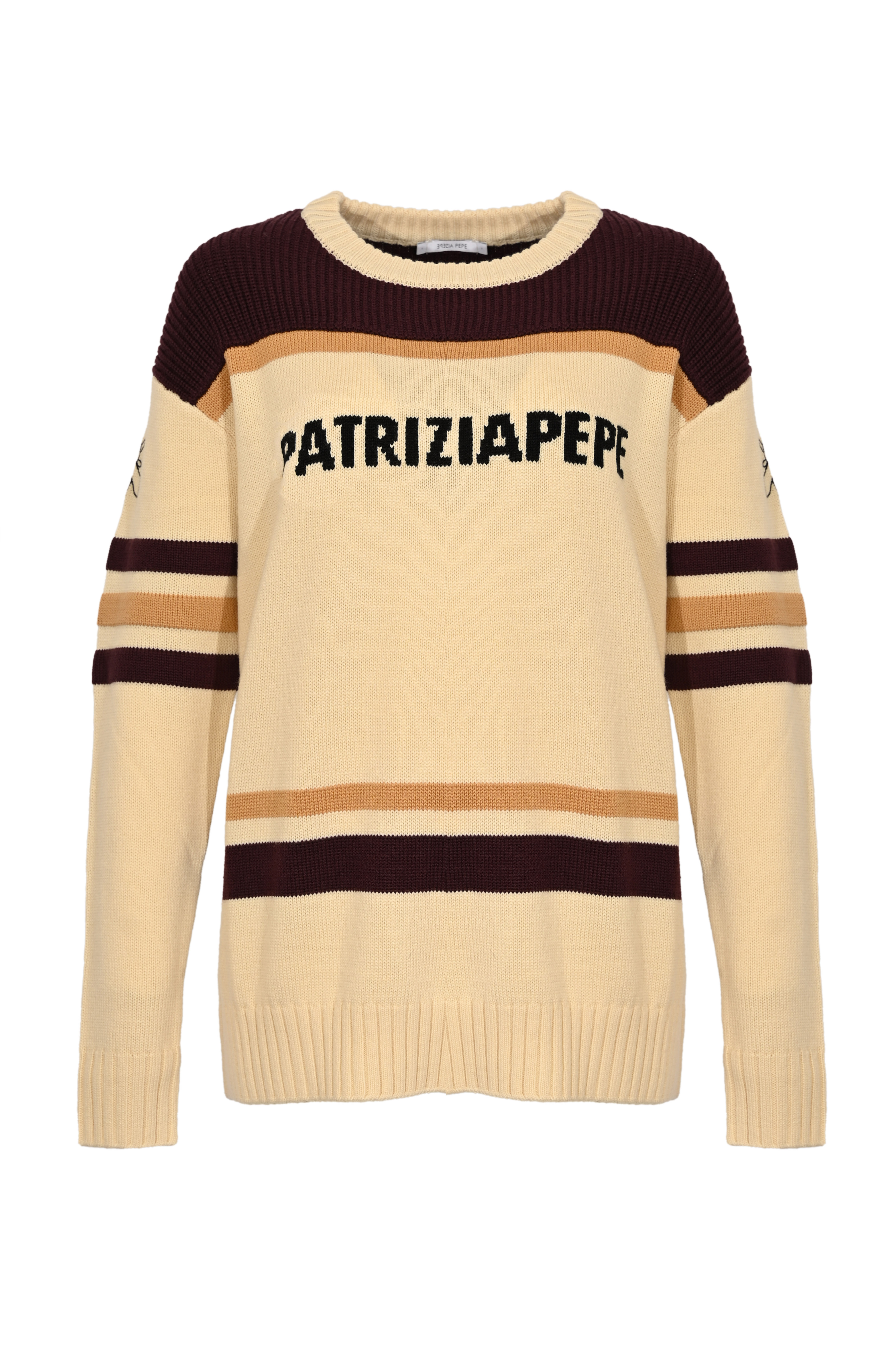 - Fantasia: righe orizzontali nei toni panna, cammello e bordeaux con logo frontale Patrizia Pepe a contrasto