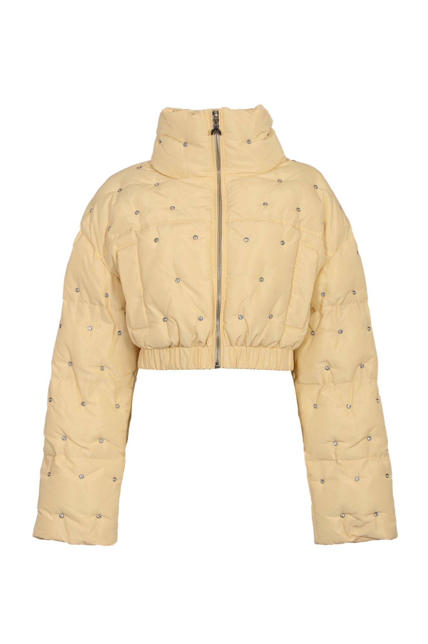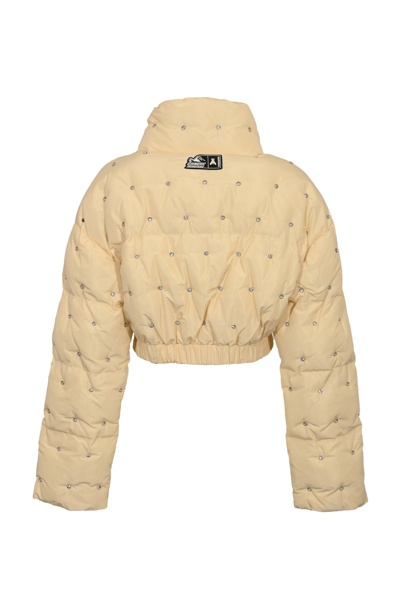 - Dettagli: Applicazioni di micro strass su tutta la superficie, elastico sul fondo e sui polsi, label logata sul retro, imbottitura calda e leggera; design cropped dal taglio moderno e femminile