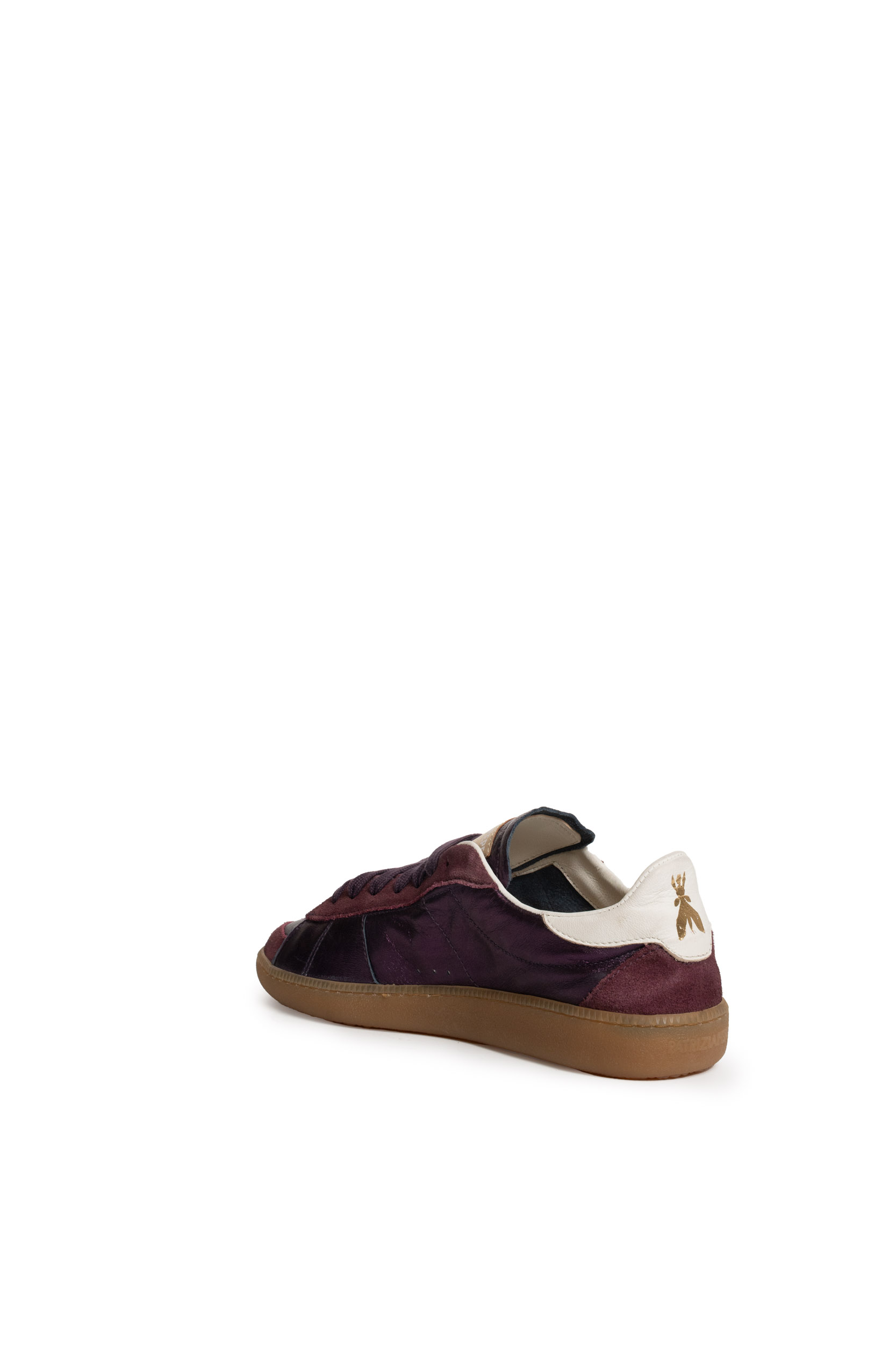 - Tomaia: In pelle laminata con inserti in suede bordeaux e dettaglio posteriore in pelle bianca con logo dorato Patrizia Pepe.
