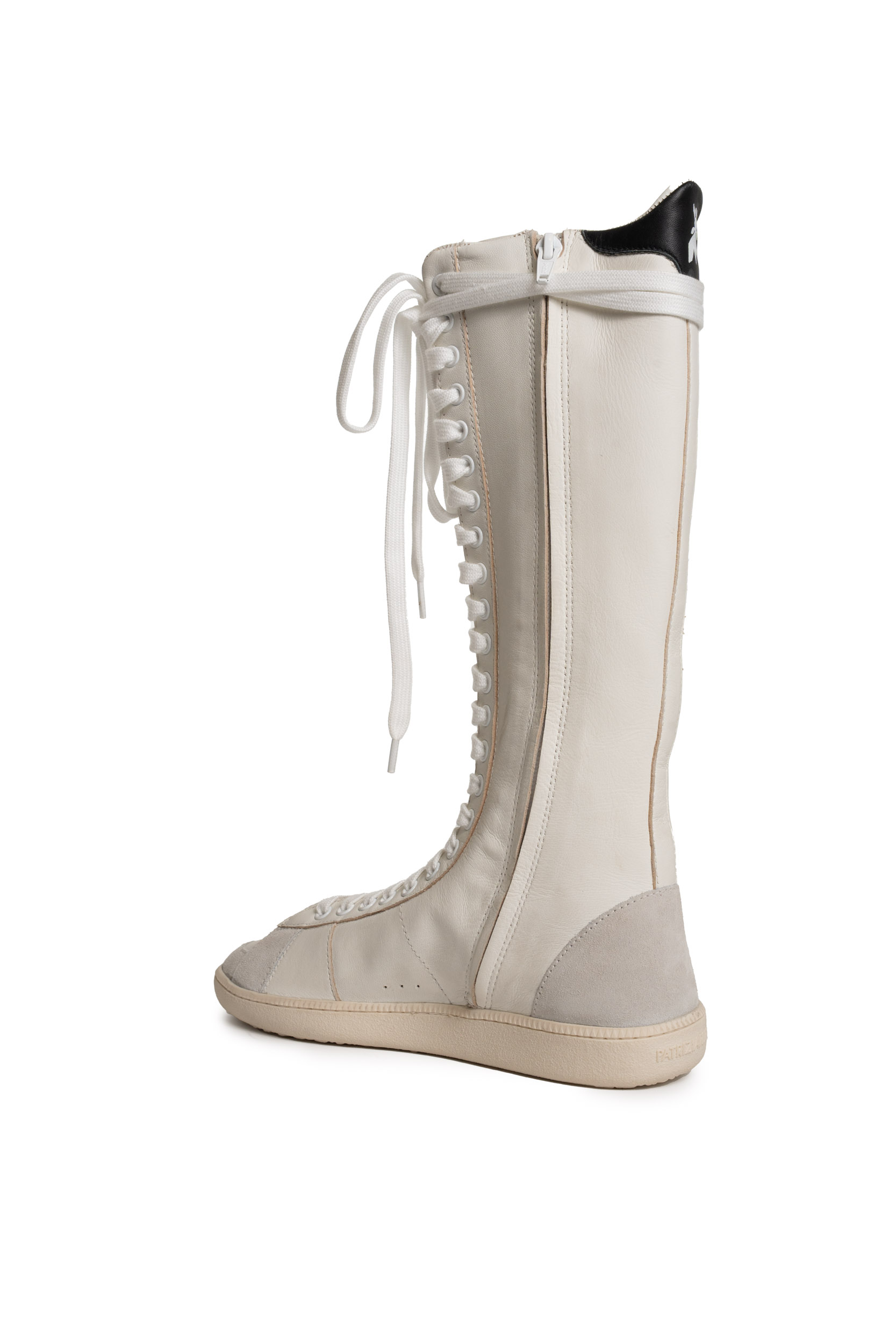 - Tomaia: In pelle liscia con inserti in suede tono su tono e dettaglio posteriore in pelle a contrasto colore con logo Patrizia Pepe. Design alto con allacciatura frontale integrale e linea sportiva.
