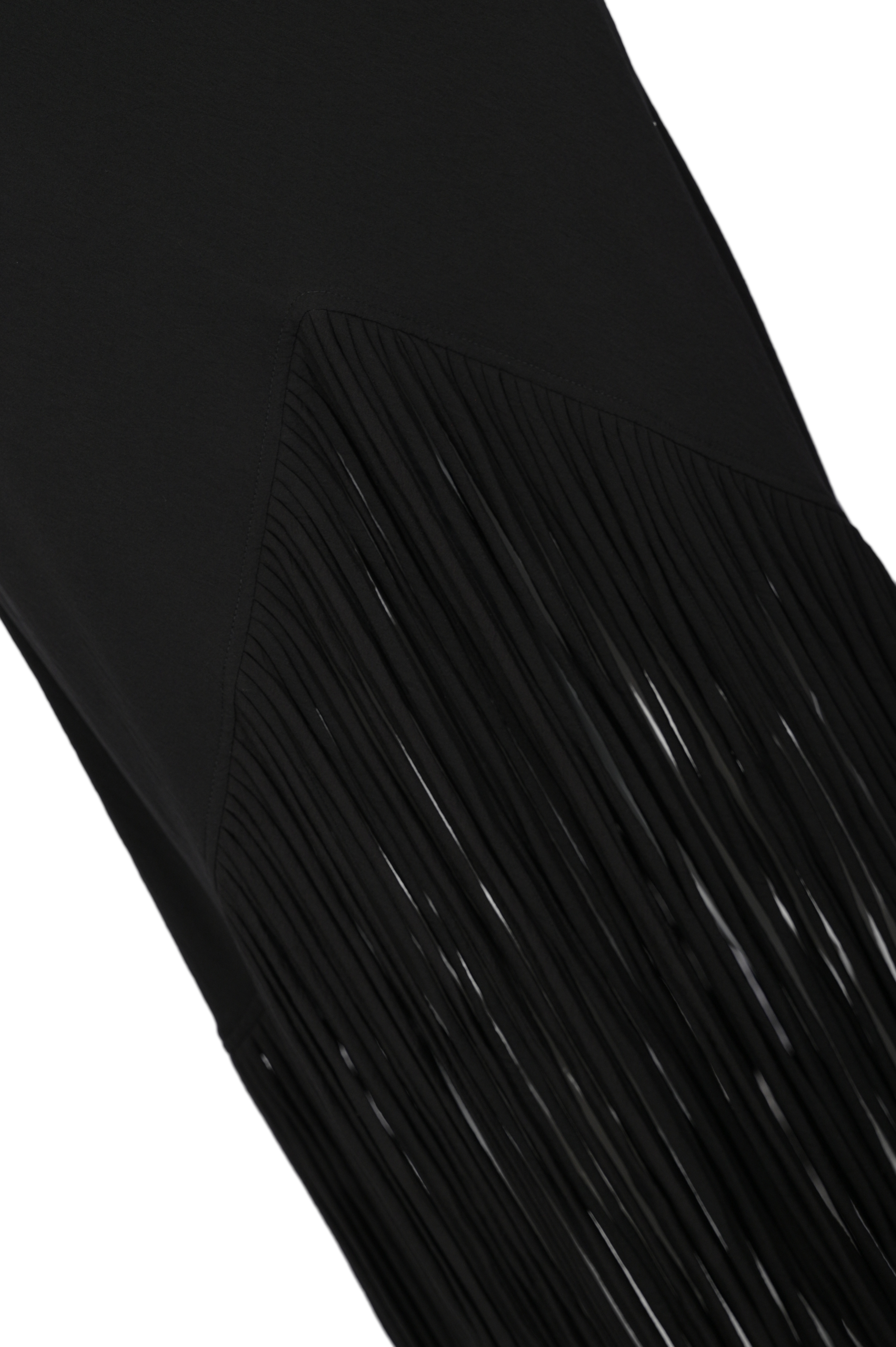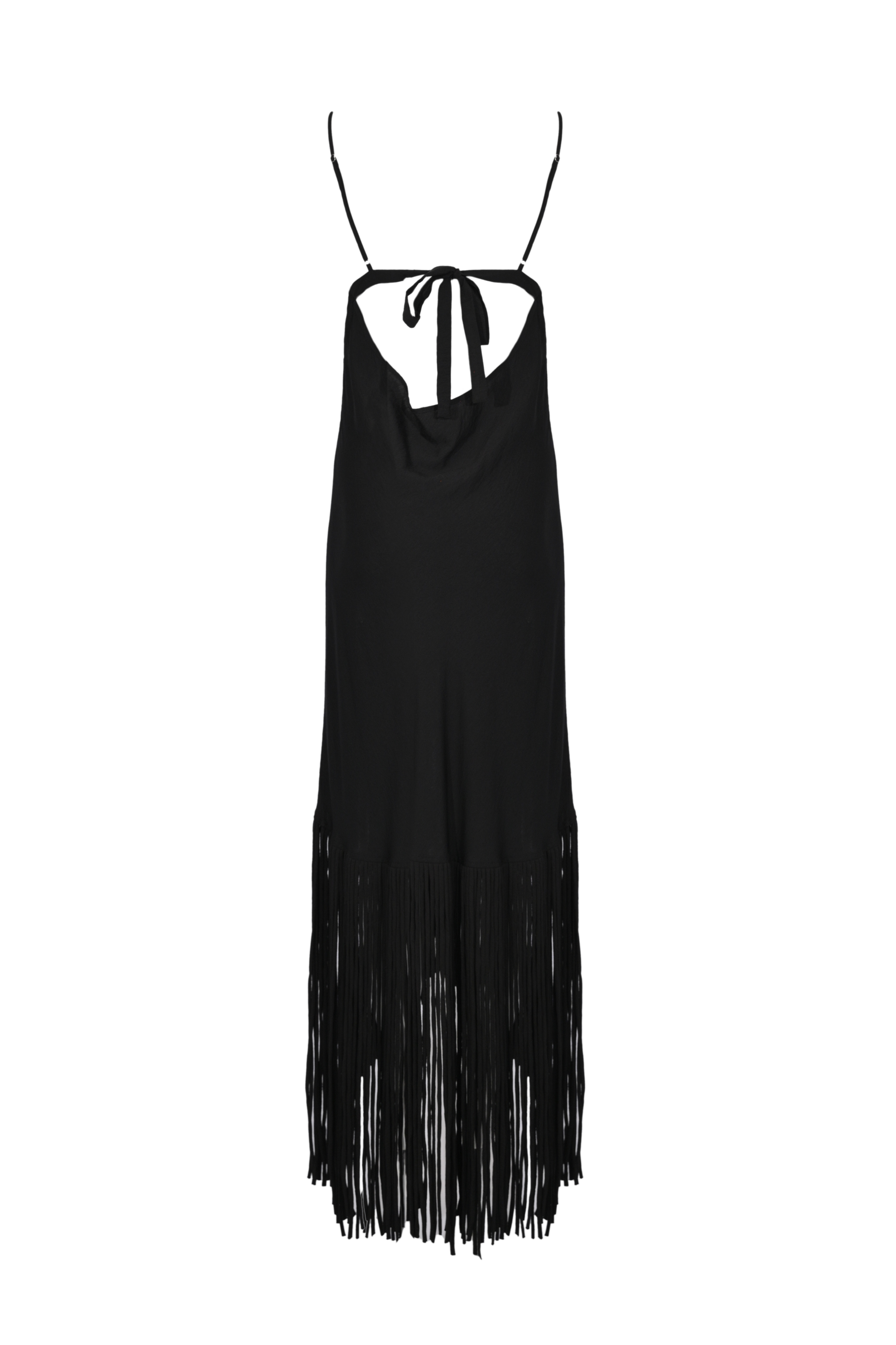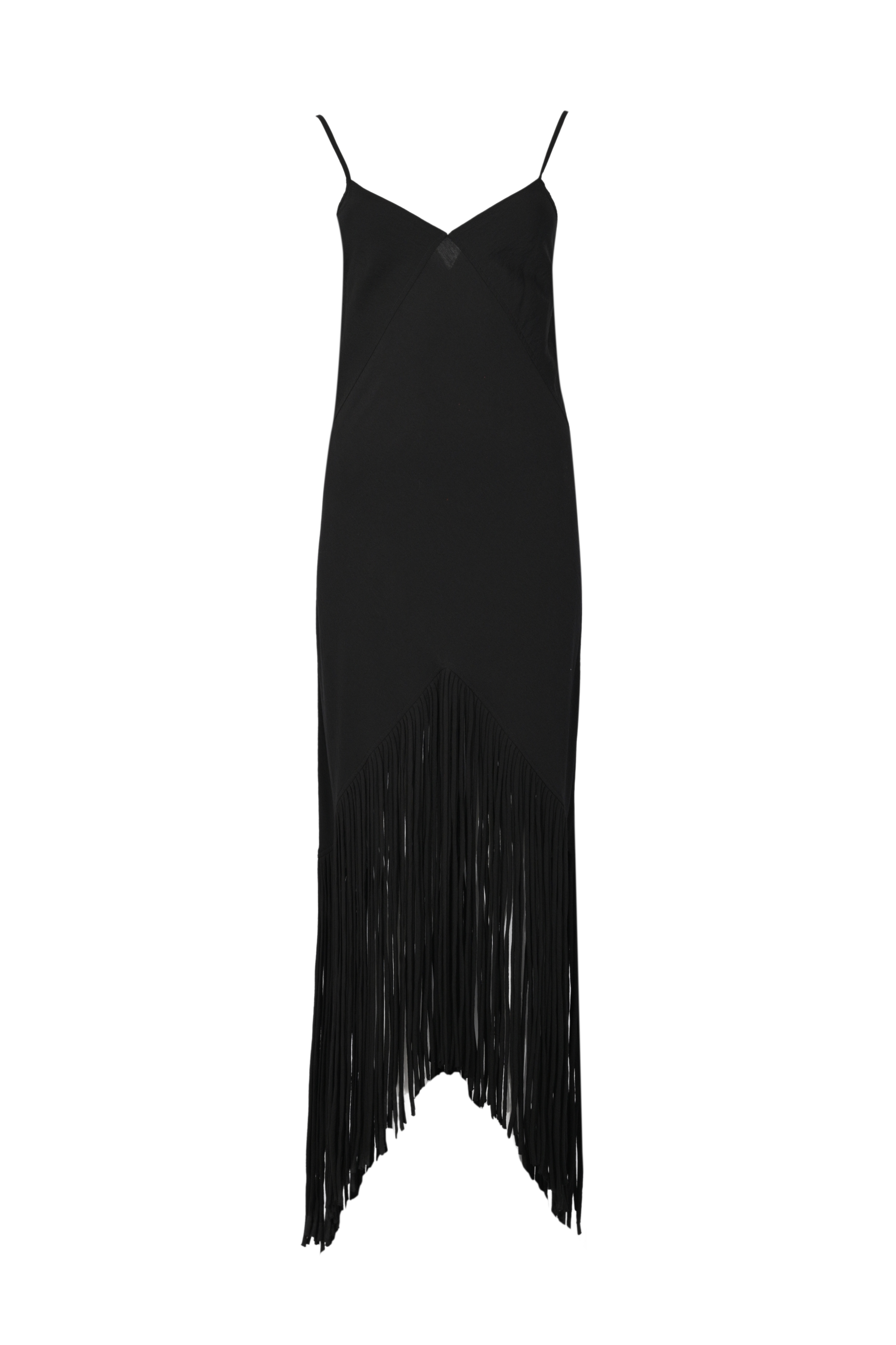 - Dettagli: design sottoveste essenziale con linea morbida e scivolata, retro con schiena scoperta e drappeggio leggero, inserto con frange lunghe applicate sullorlo che creano movimento e effetto dinamico, taglio asimmetrico sul fondo, finiture minimal per un look elegante e contemporaneo