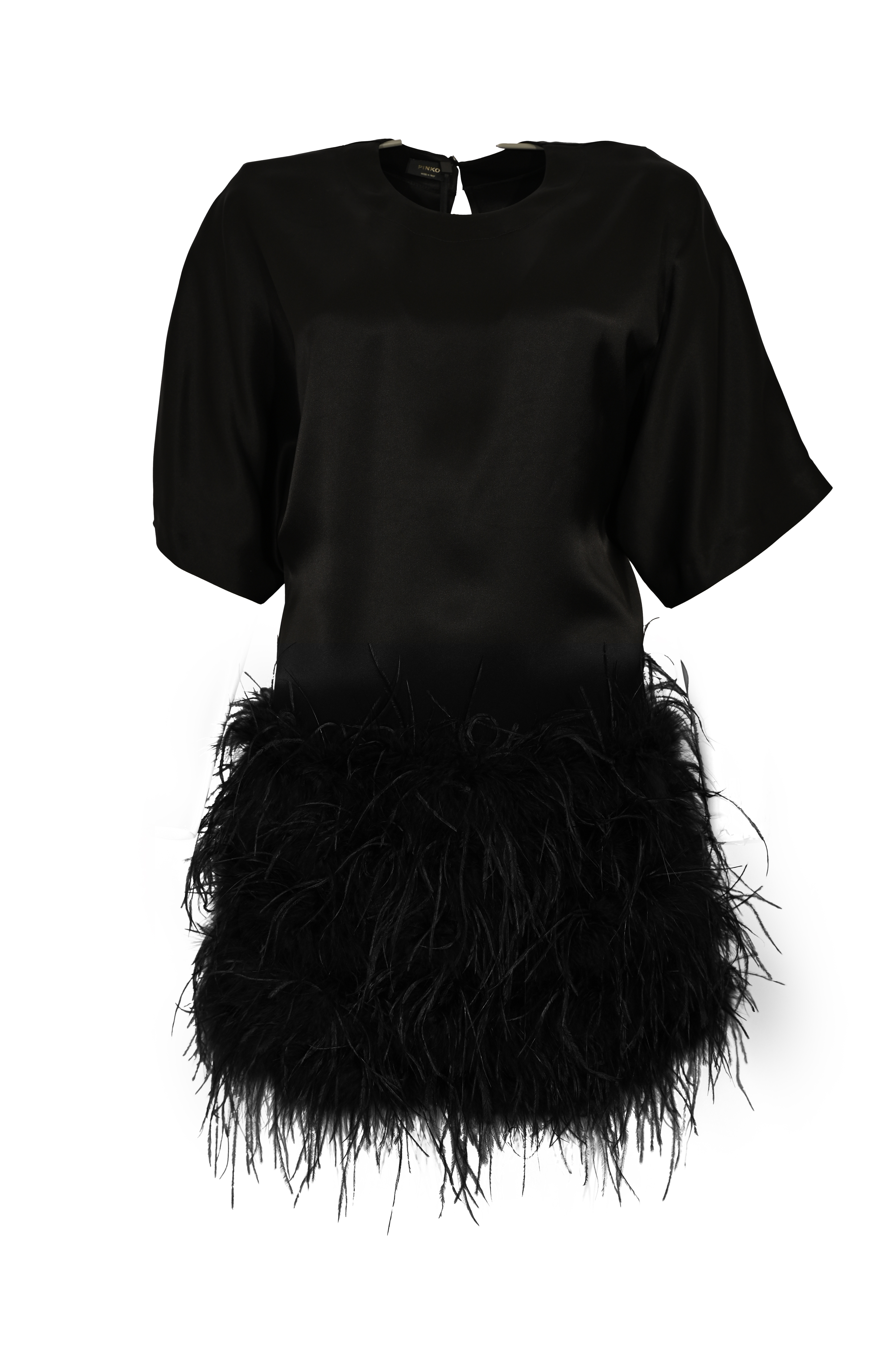 Abito da donna in raso lucido con piume, Pinko, Modello Sapientino
