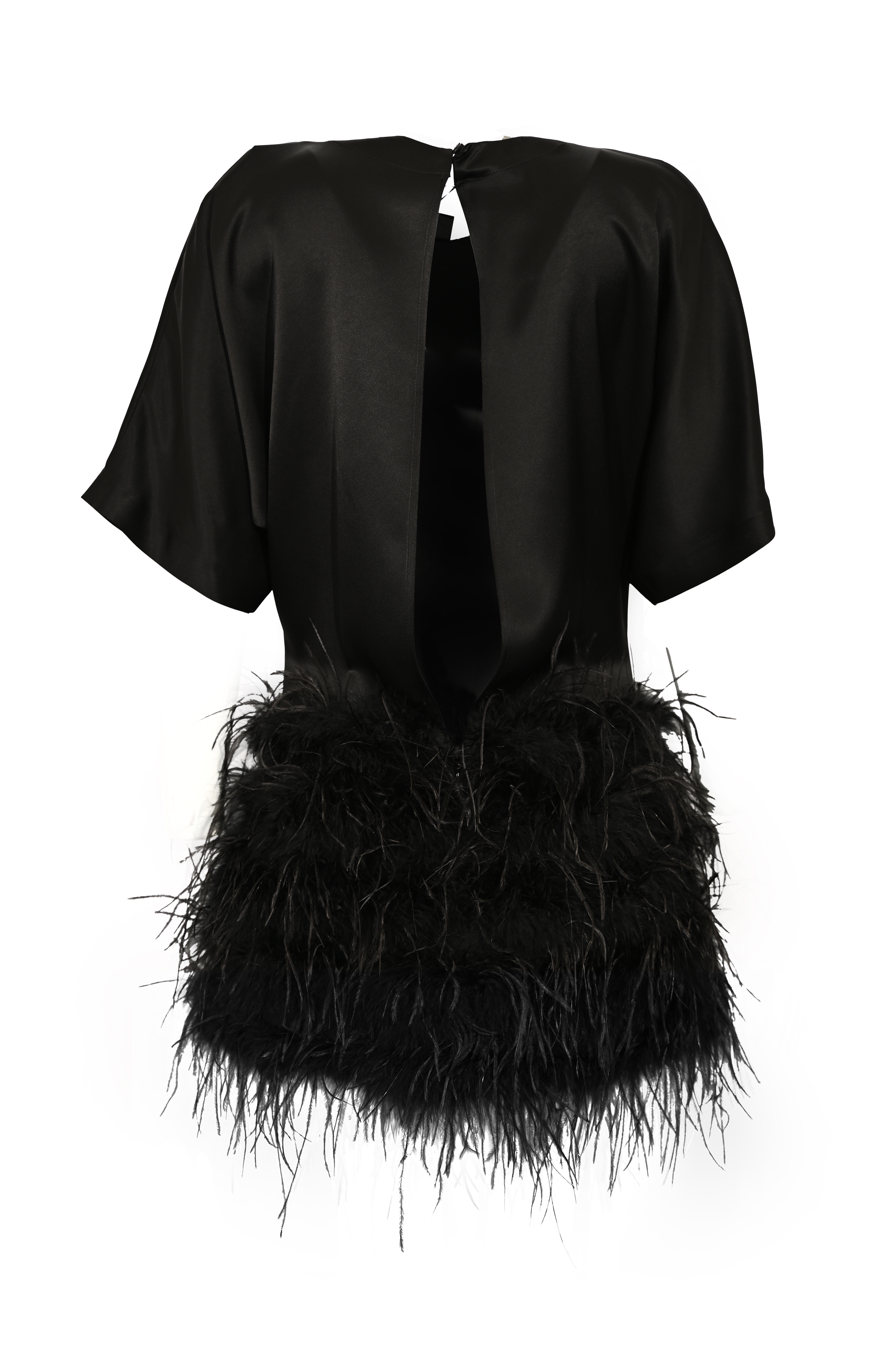 - Dettagli: applicazioni di piume sul fondo e apertura a goccia sul retro