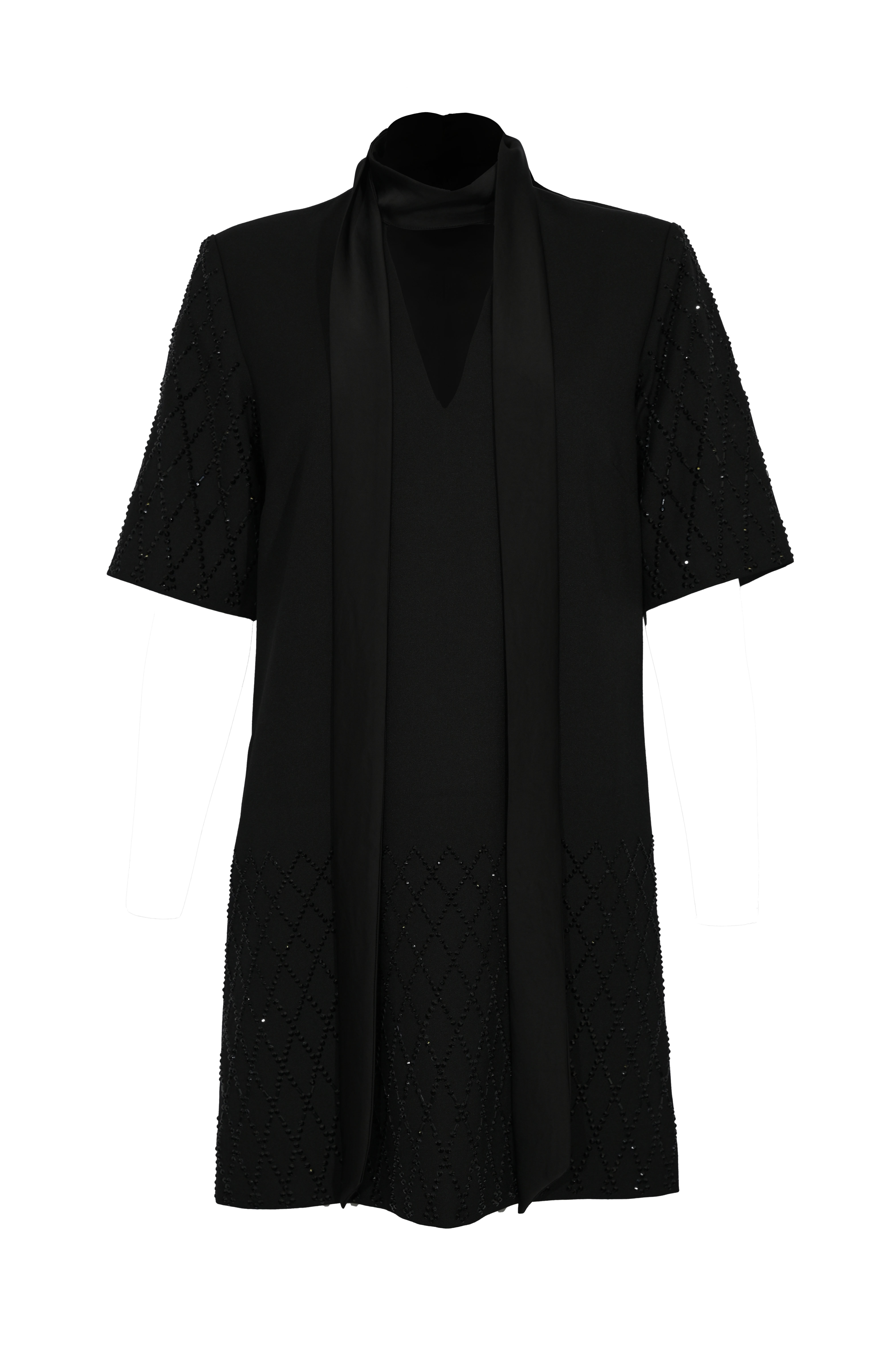 - Dettagli: applicazioni di strass a motivo geometrico su maniche e fondo, taglio dritto, effetto luminoso discreto