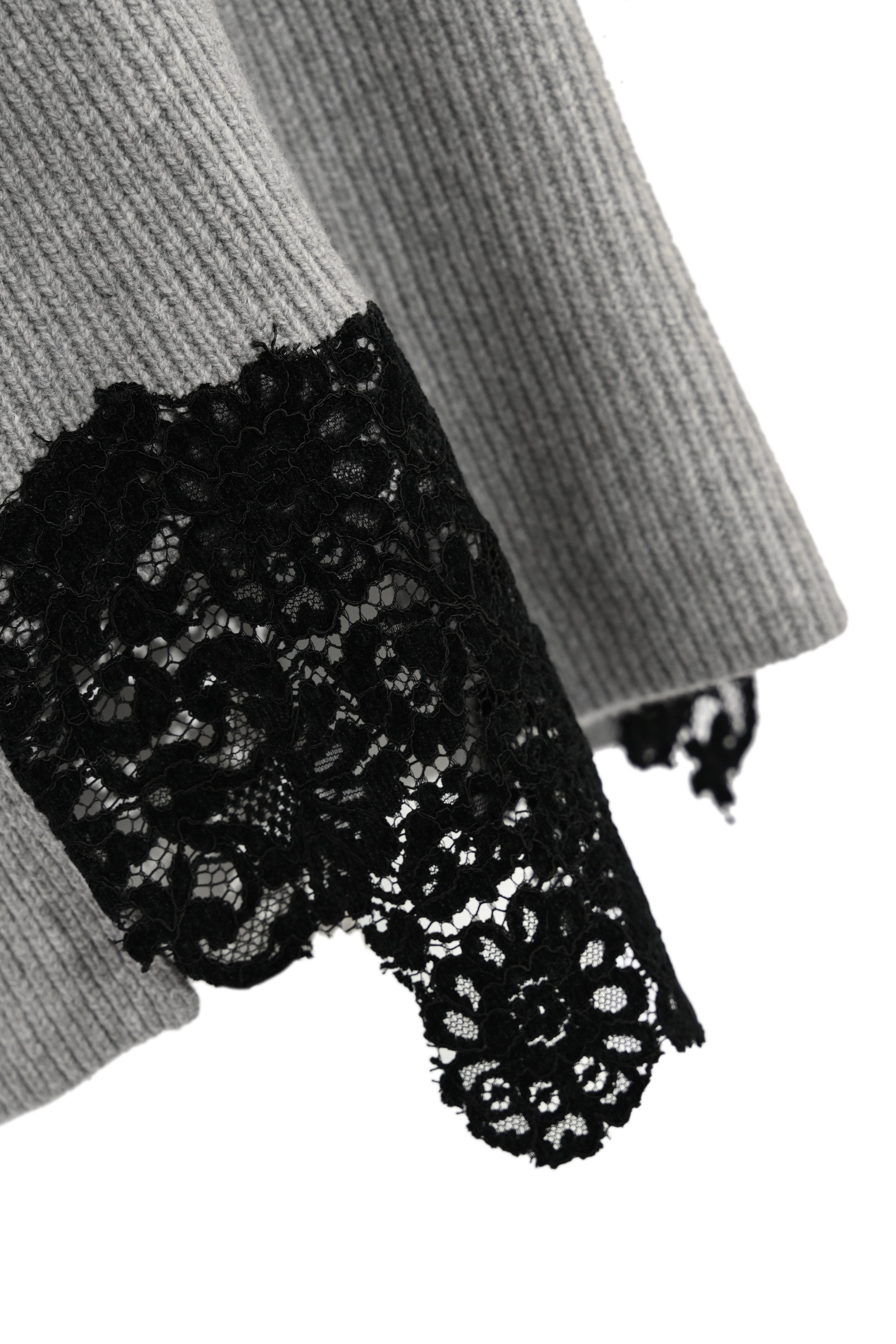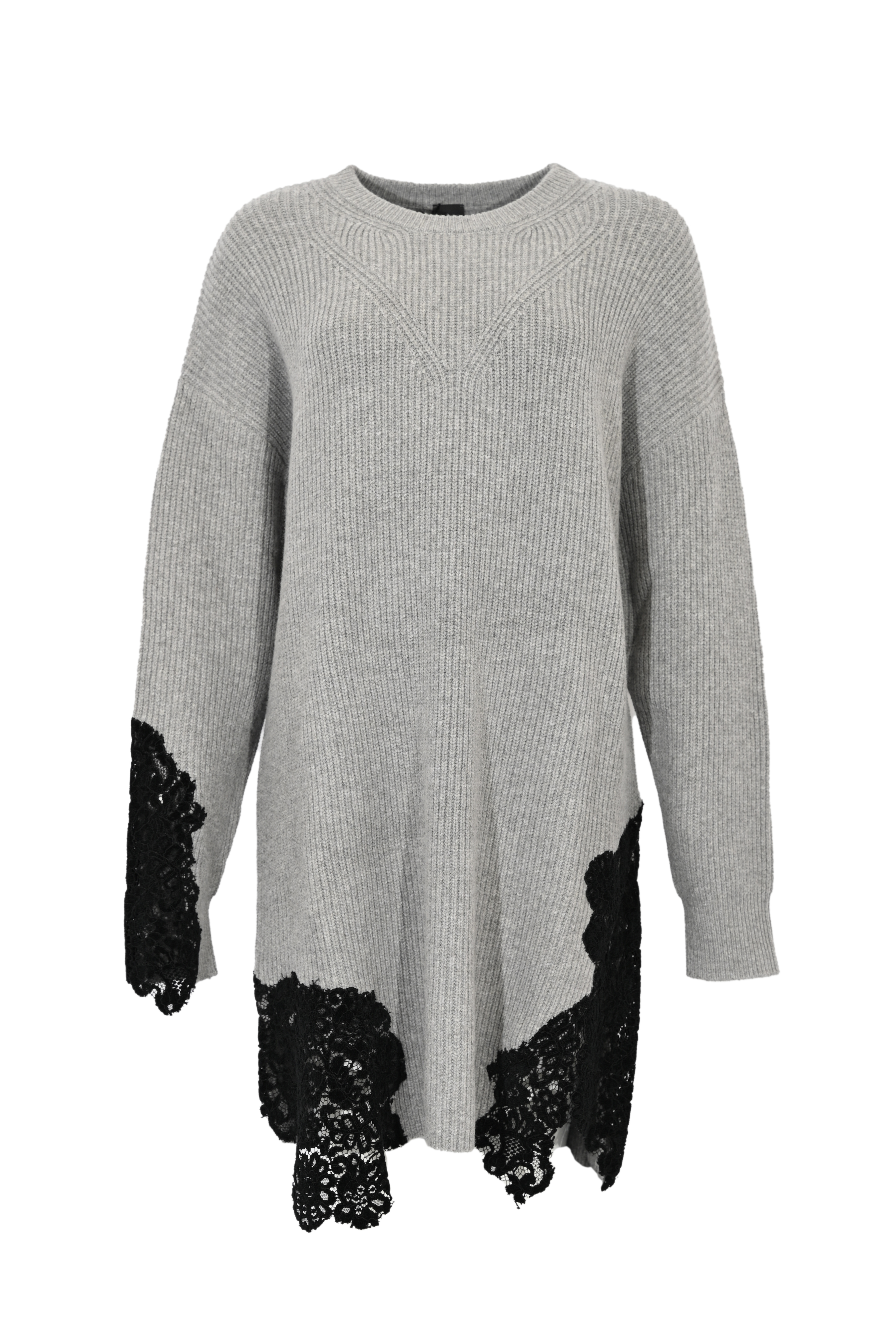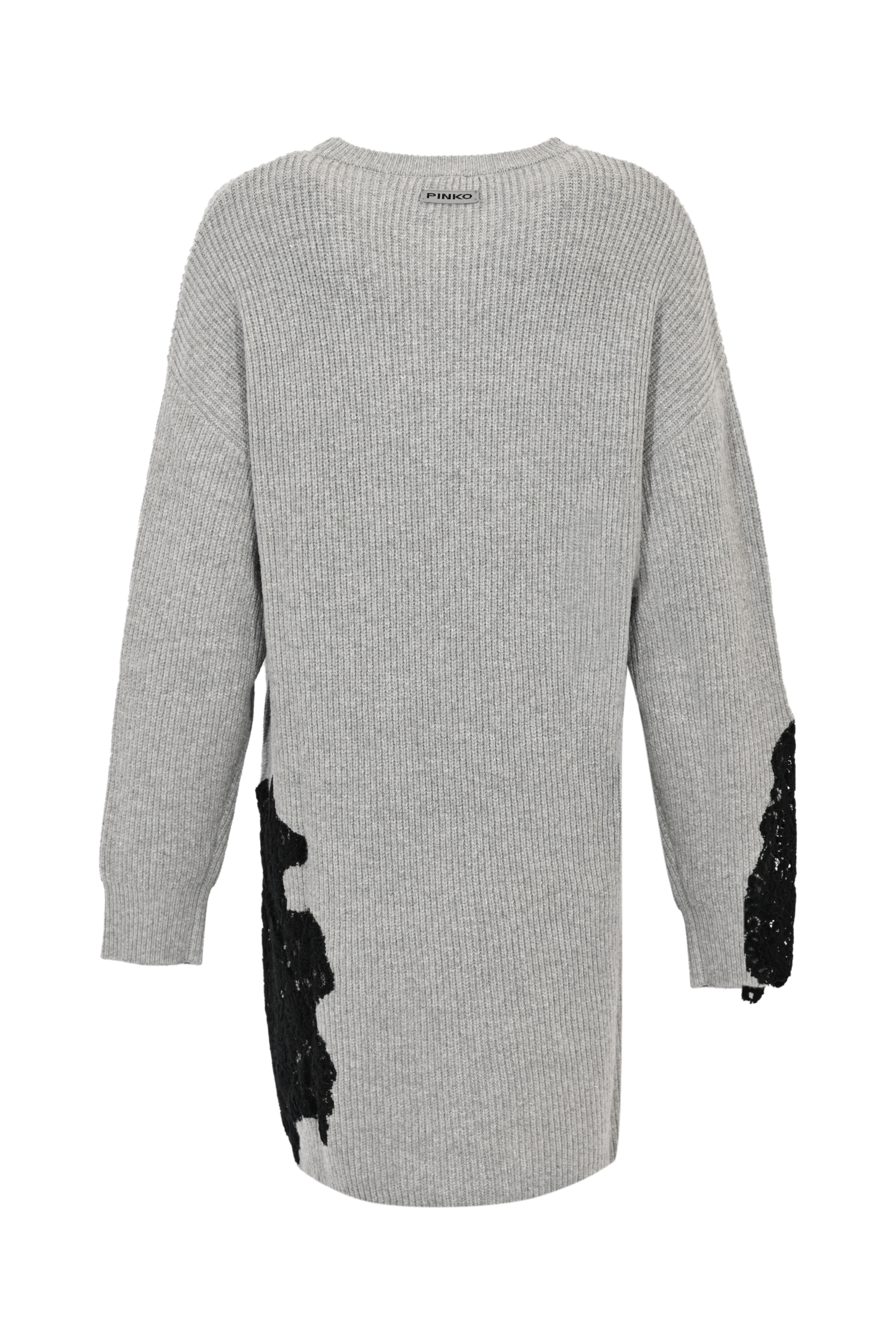 - Dettagli: Inserti in pizzo nero applicato sul fondo e sulle maniche; lavorazione a coste; spalla scesa; linea morbida e allungata