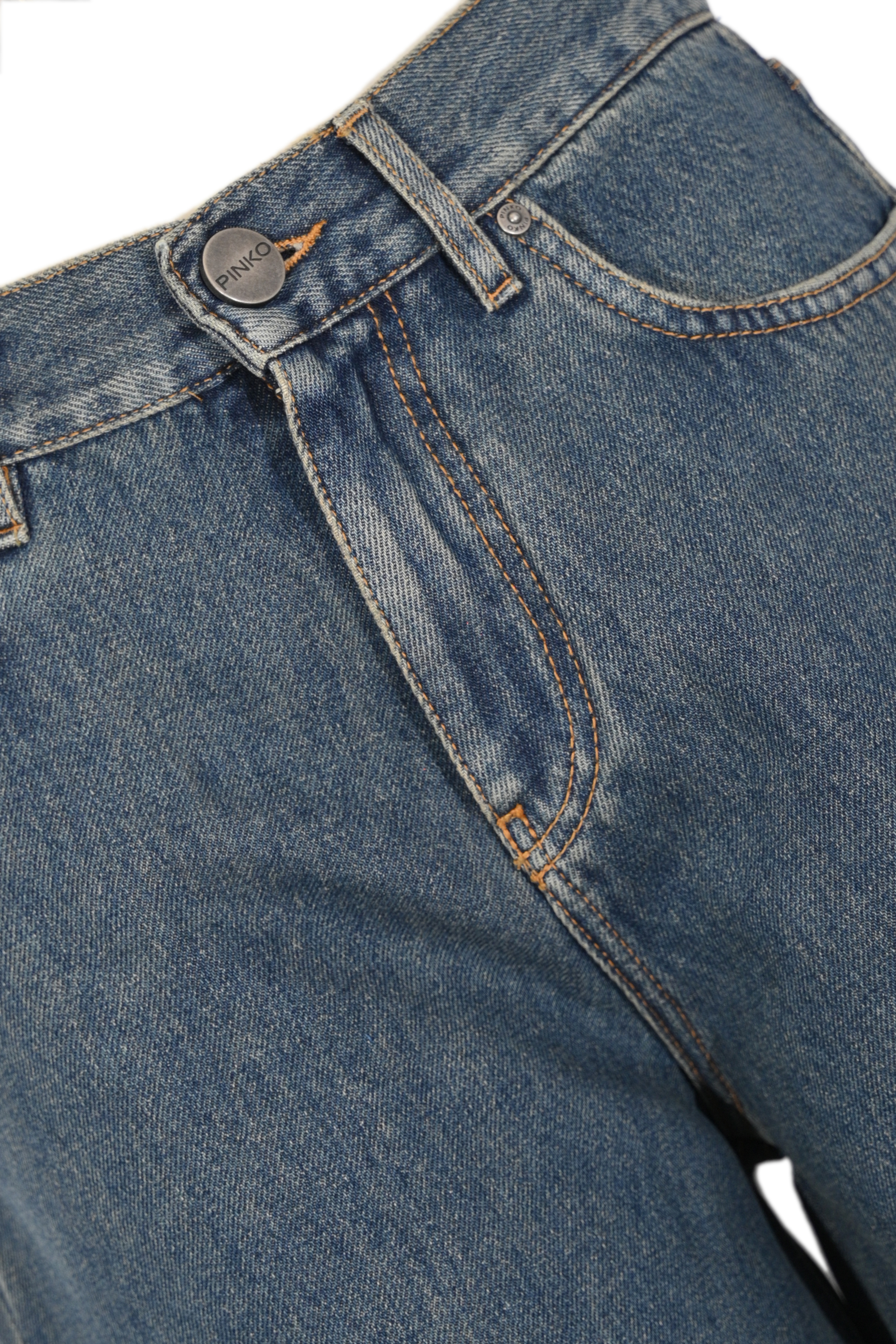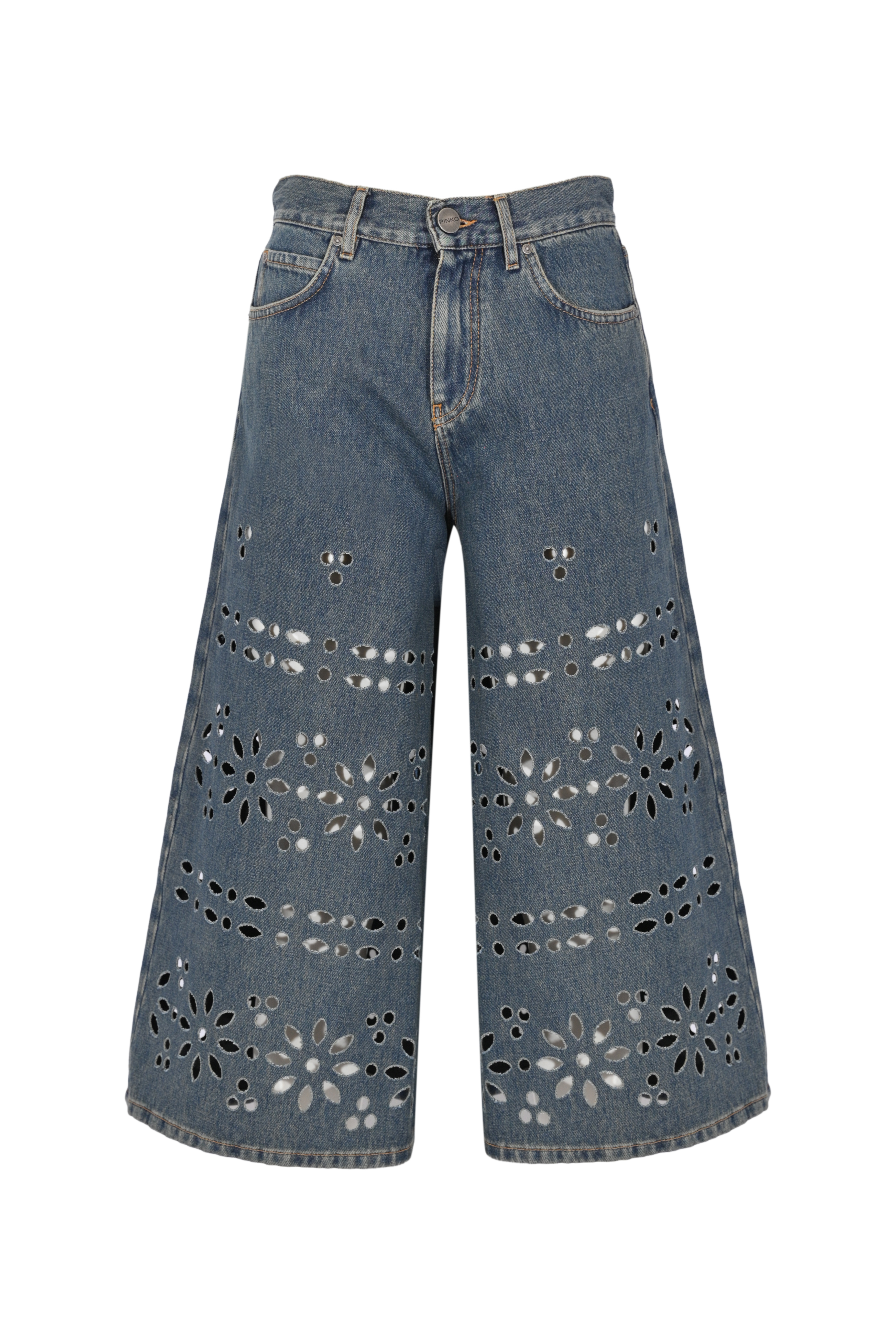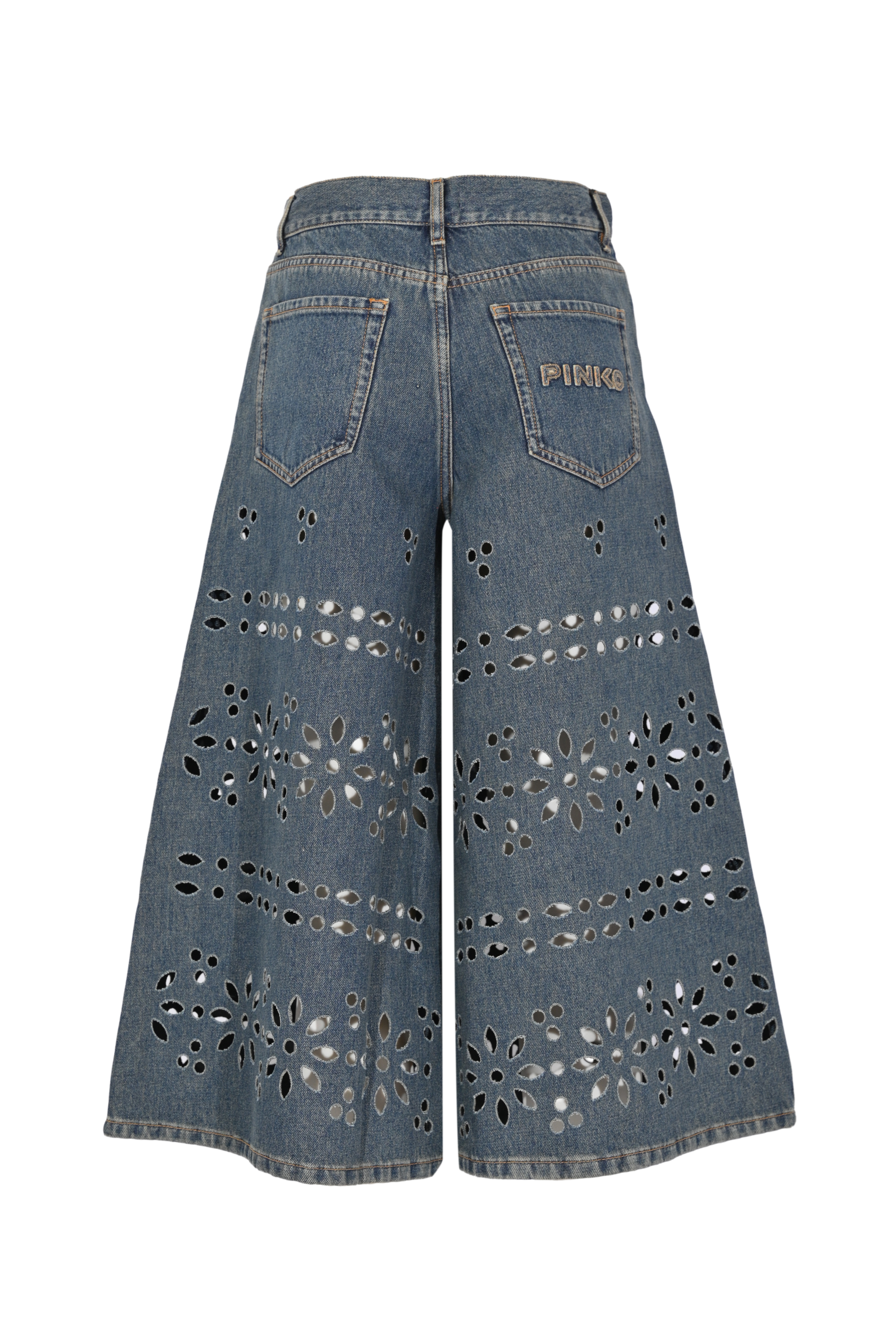 - Dettagli: lavorazione laser all over con motivi floreali effetto Sangallo, trafori decorativi su tutta la superficie, cuciture a contrasto, rivetti metallici, logo Pinko ricamato sulla tasca posteriore, denim leggermente slavato