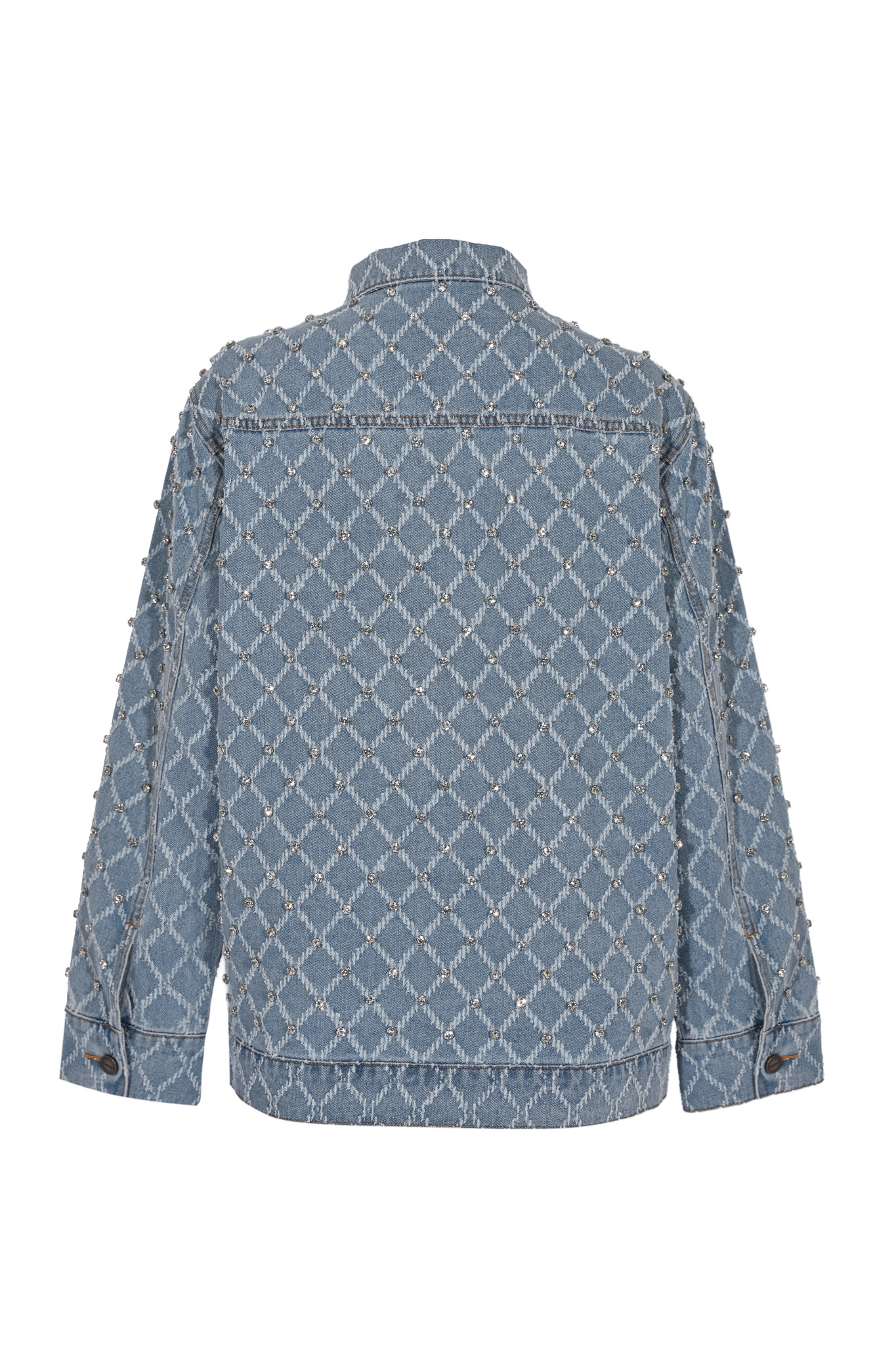 - Tessuto: Denim di cotone lavato con applicazioni di strass