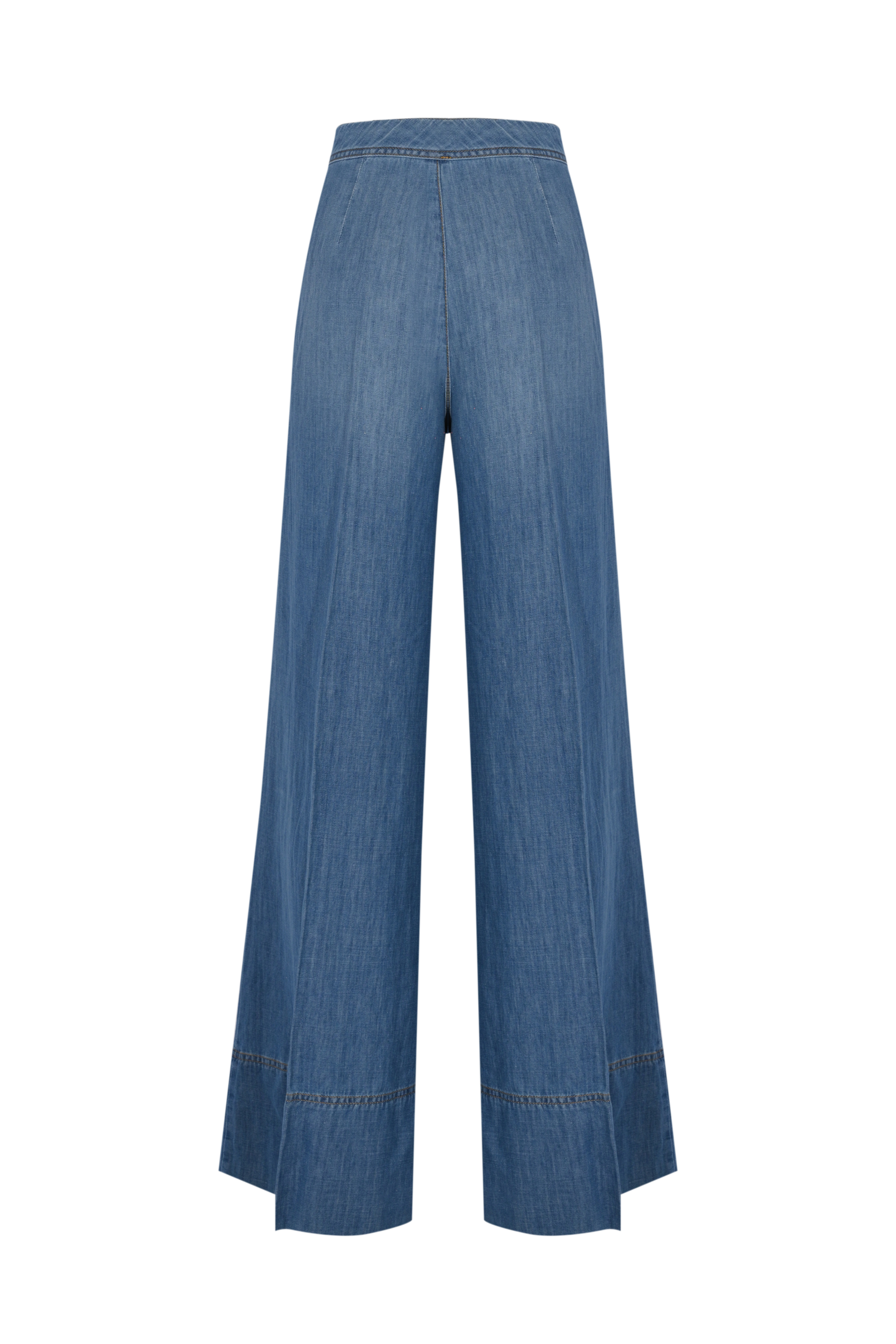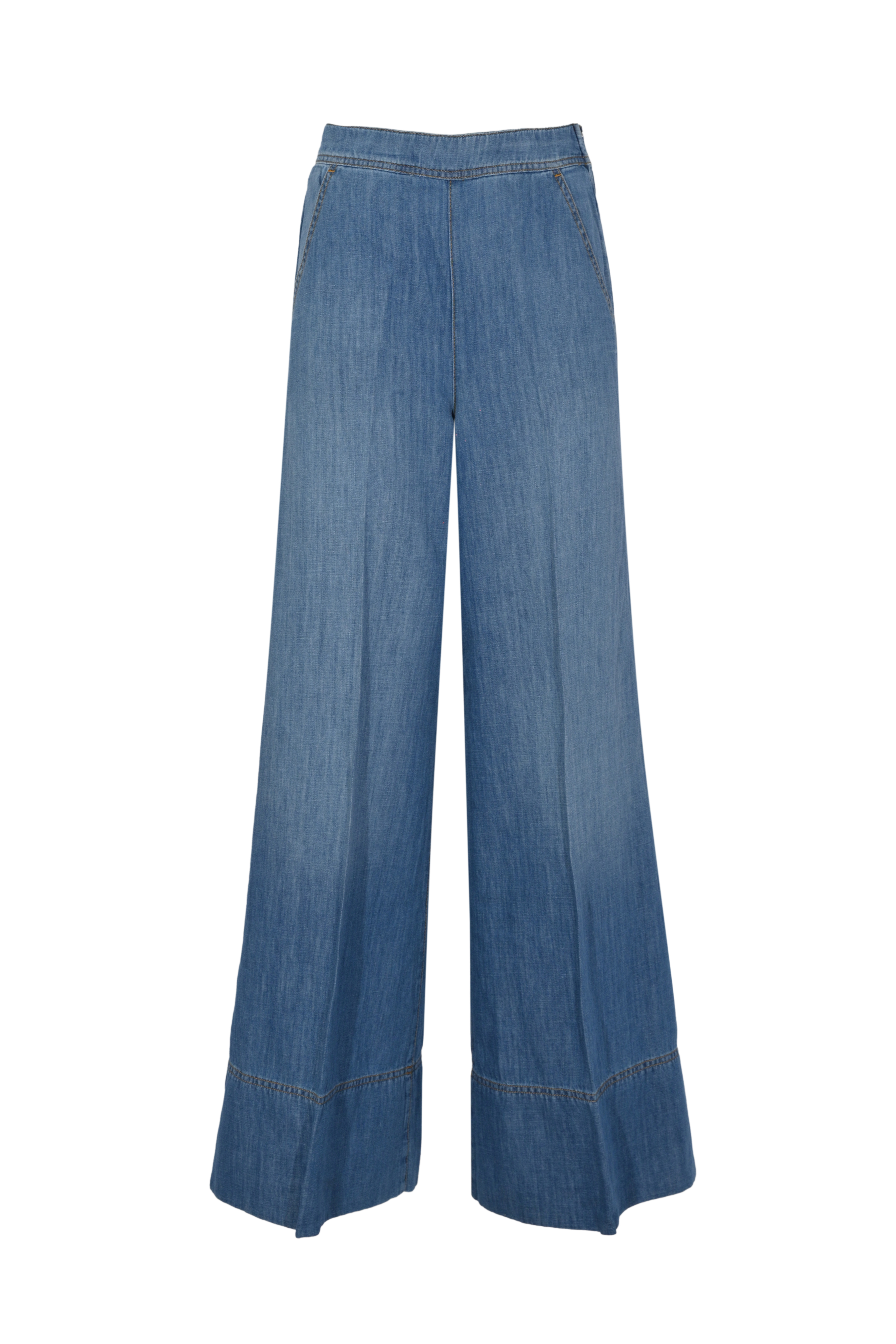 - Dettagli: gamba ampia e fluida con linea svasata, cuciture verticali che slanciano la silhouette, fondo ampio con impunture a vista, costruzione leggera e traspirante ideale per la stagione estiva, finitura morbida e naturale al tatto