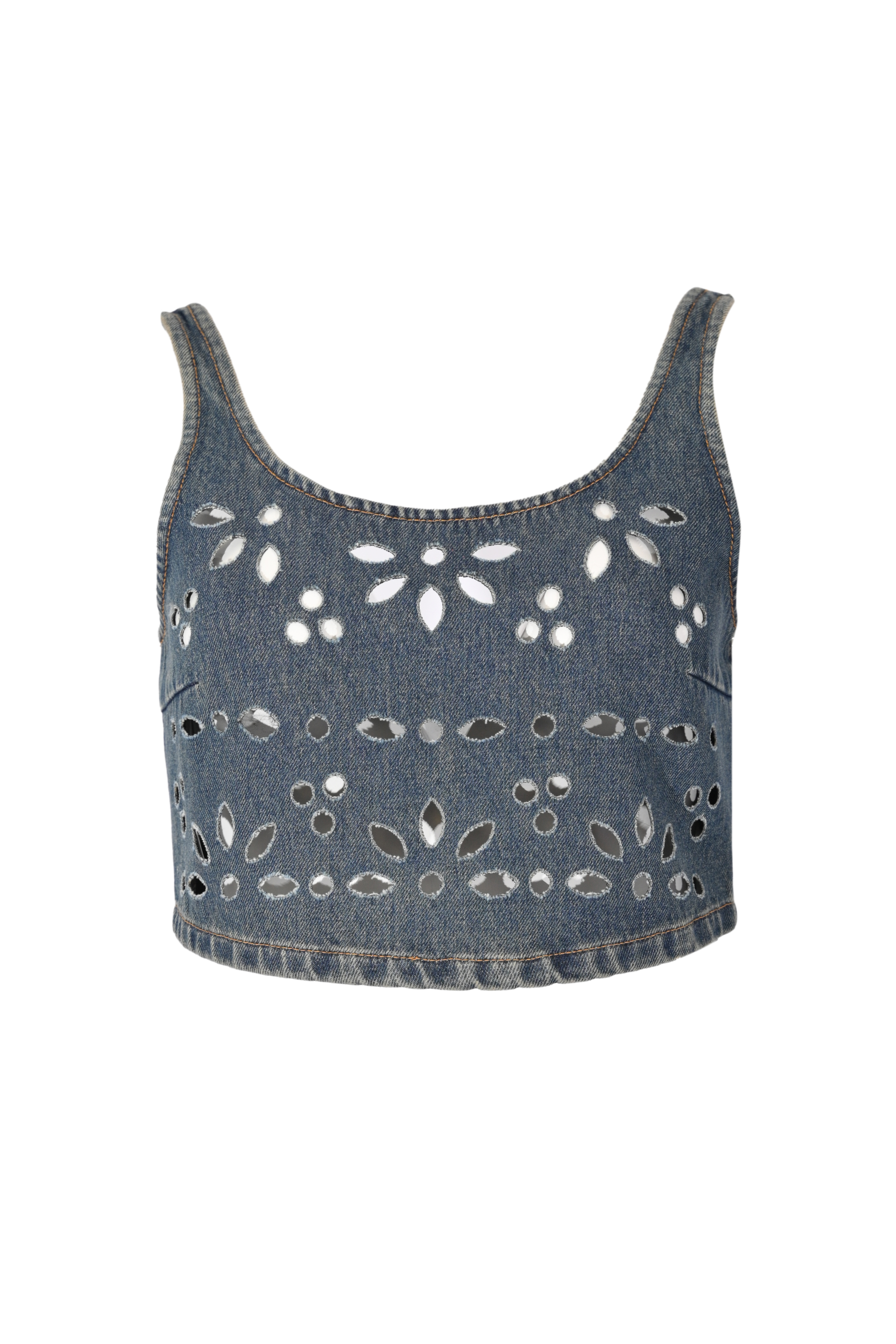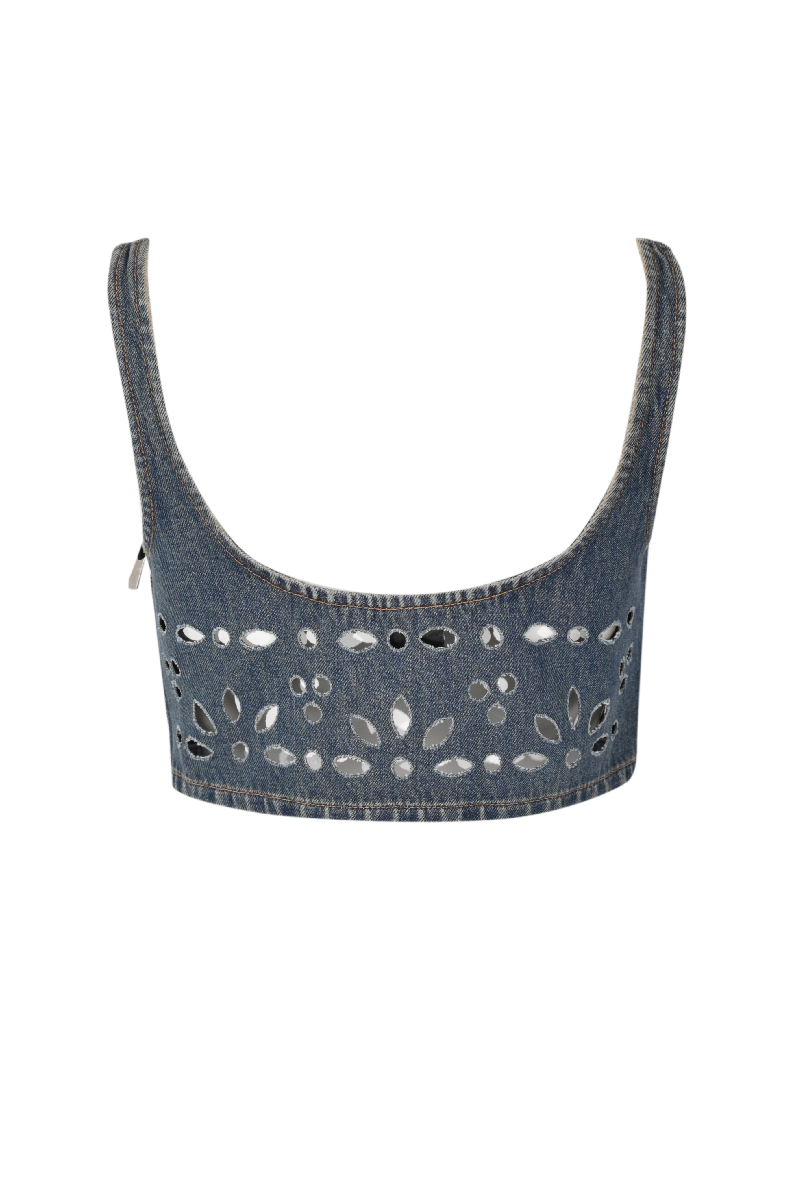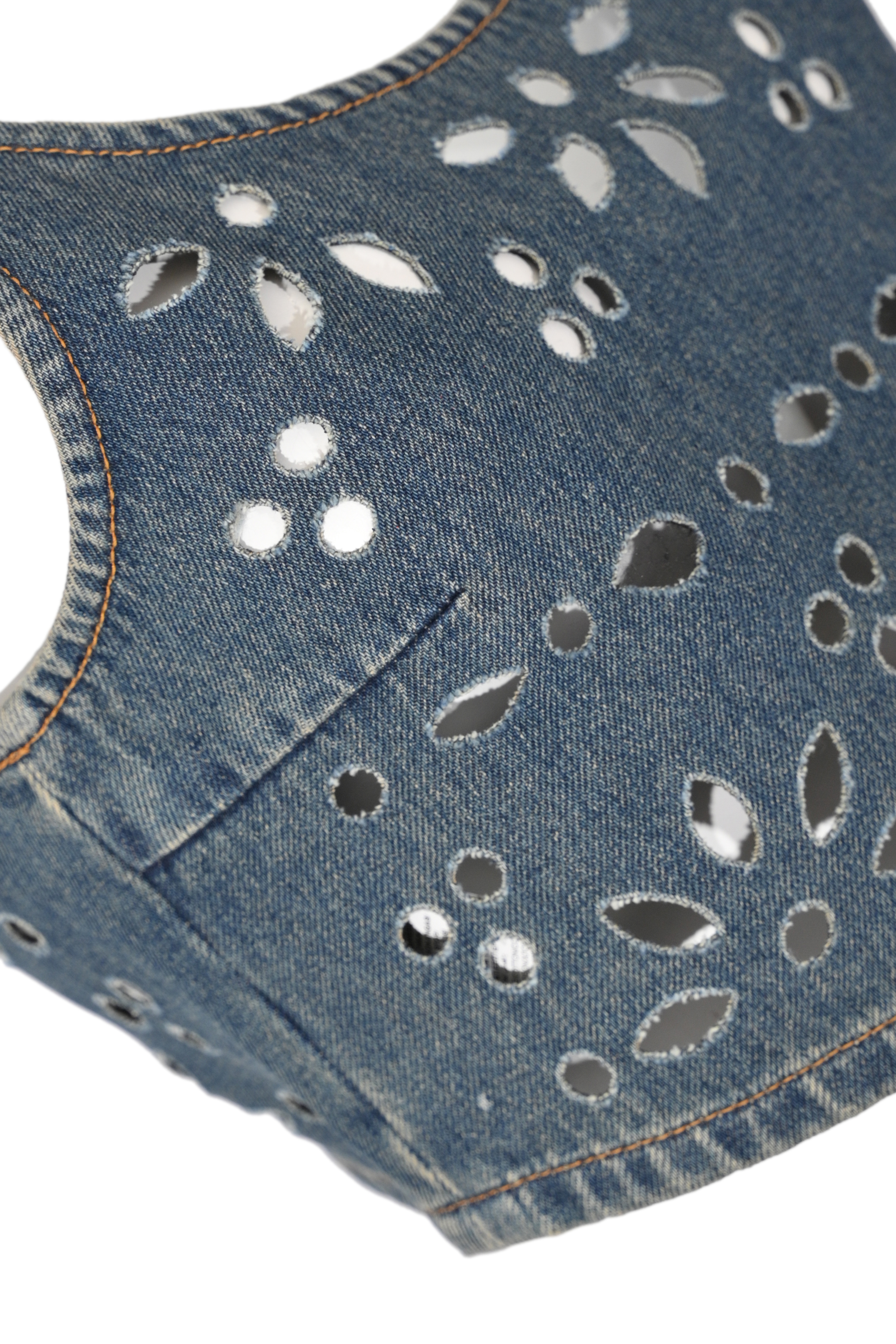 - Dettagli: lavorazione traforata all over con disegni floreali che richiamano il sangallo, effetto vedo non vedo elegante e contemporaneo, impunture a contrasto tipiche del denim, taglio cropped che valorizza il punto vita, struttura aderente che segue la silhouette