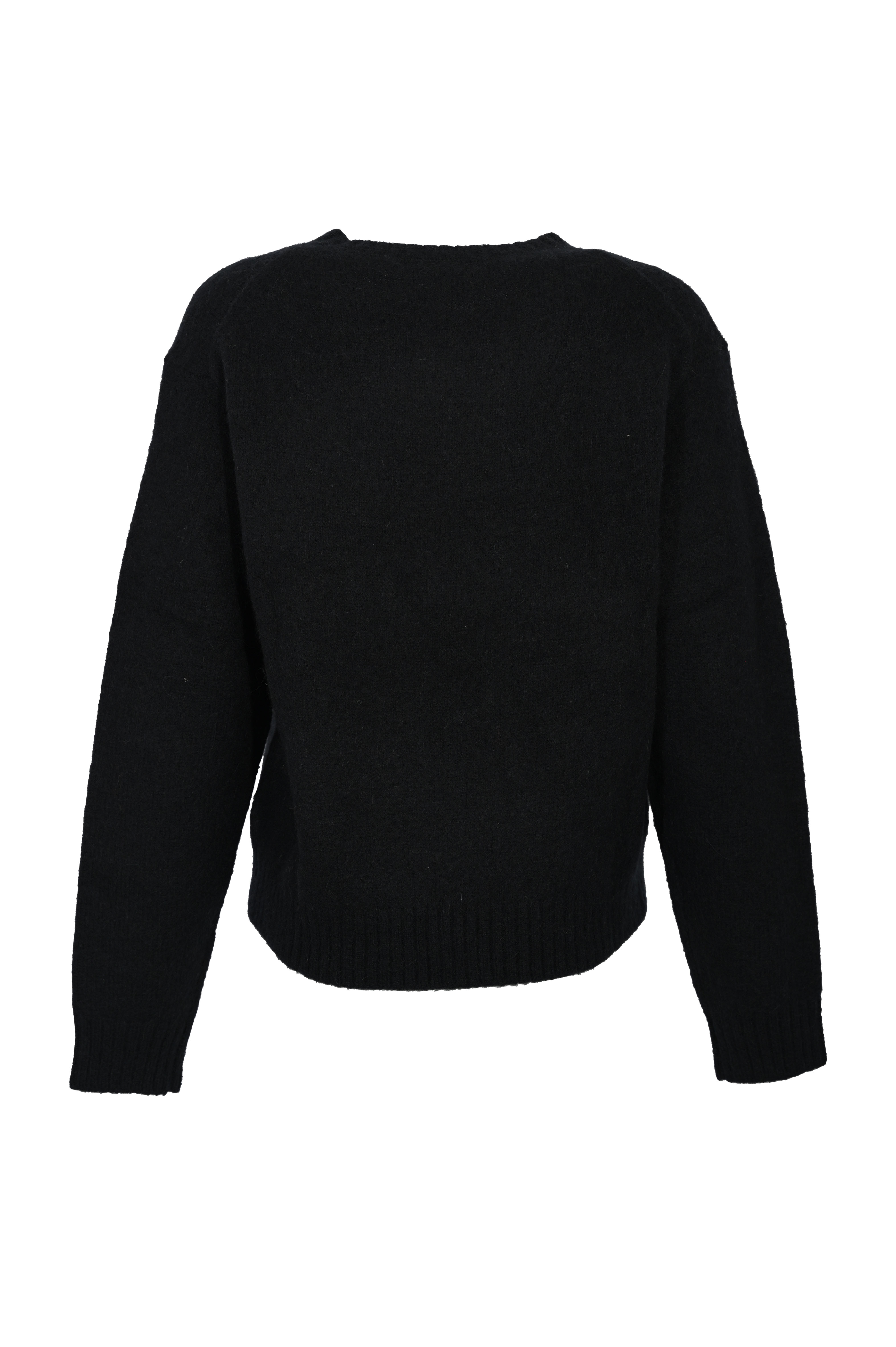 - Dettagli: lavorazione a maglia fine, bordi a costine su fondo, polsini e collo, intarsio multicolore a contrasto sul davanti