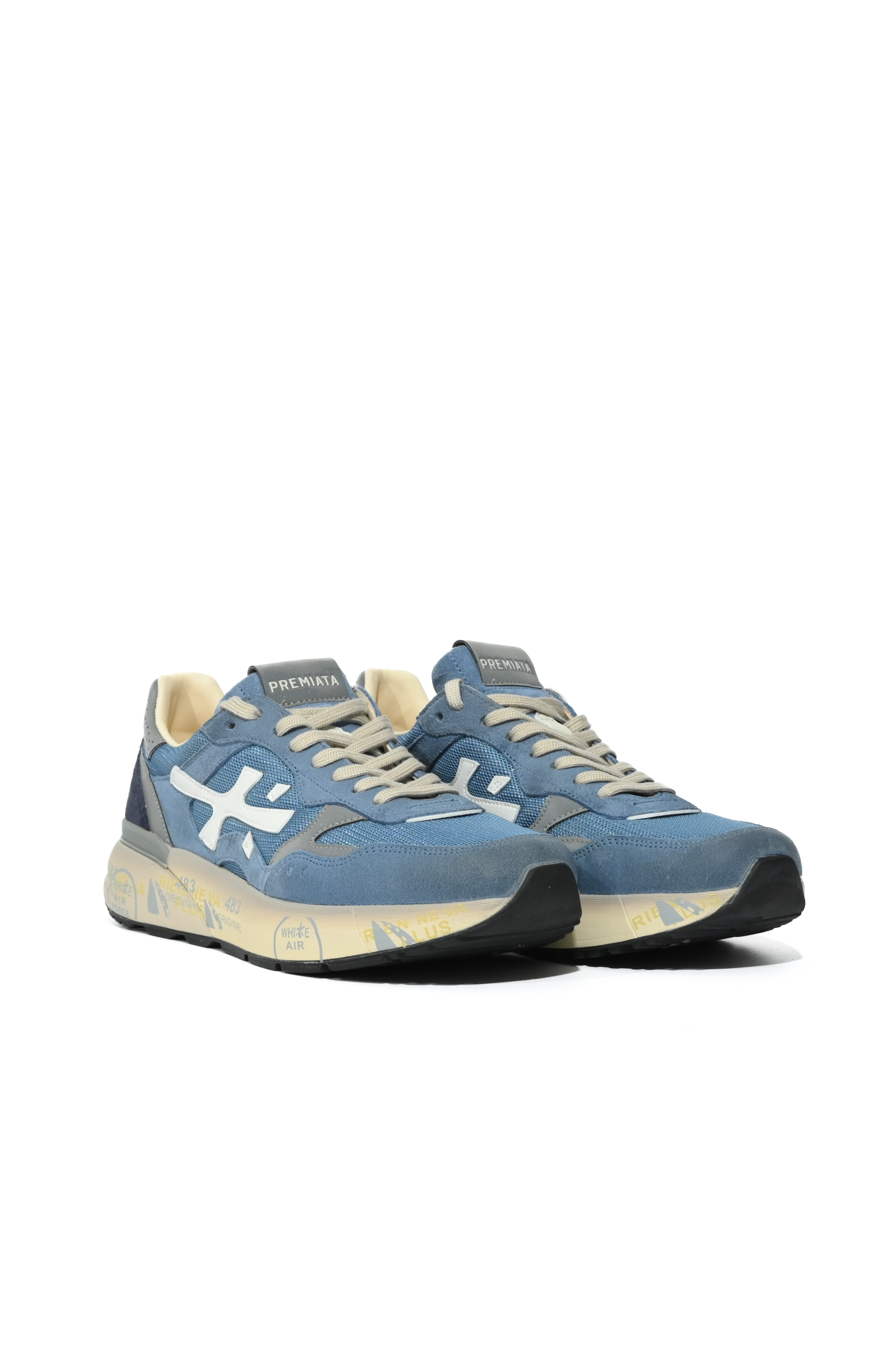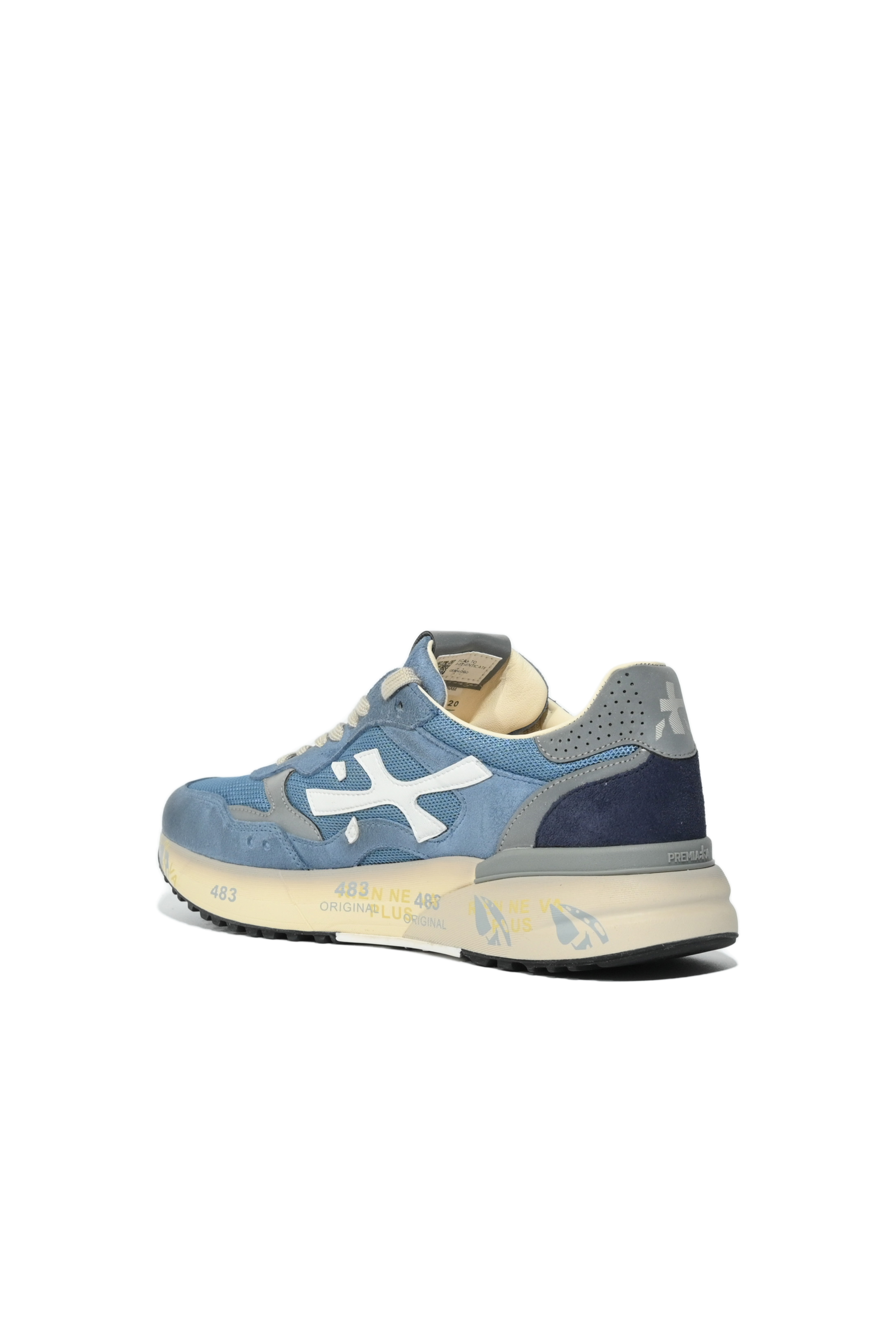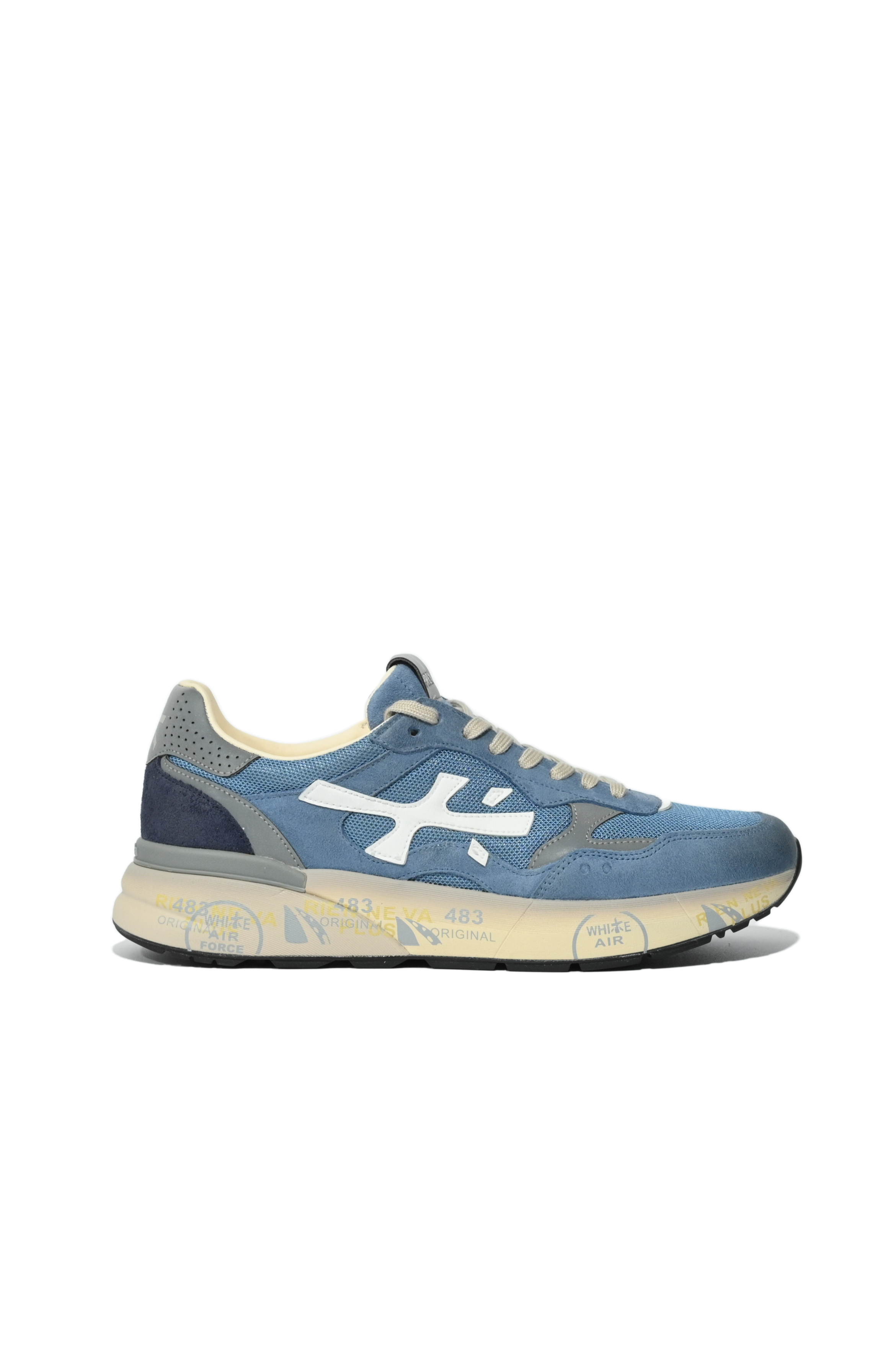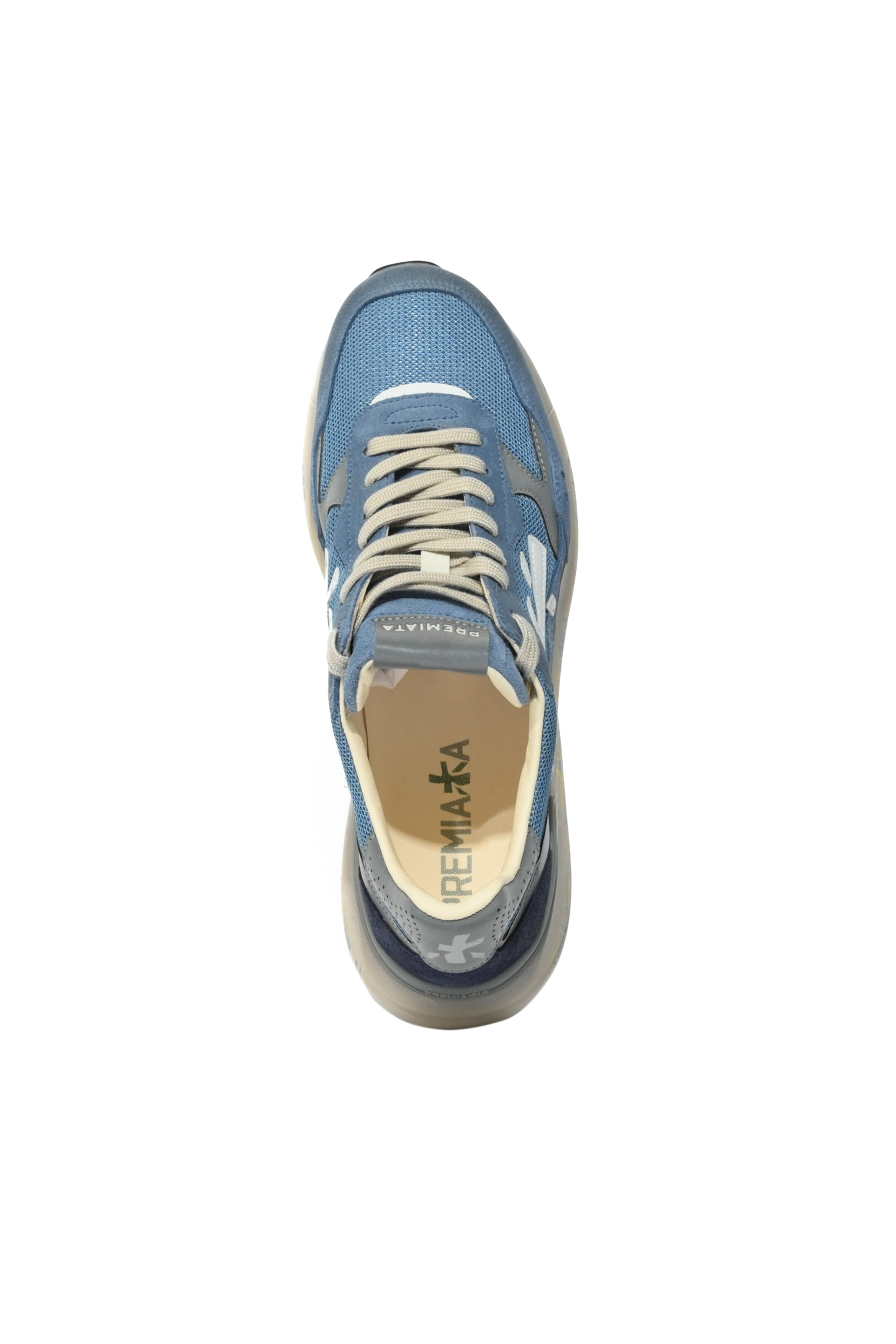 - Dettagli: logo laterale bianco a contrasto, combinazione cromatica sui toni del blu con inserti grigi, tallone rinforzato traforato, scritte Premiata distintive sulla suola