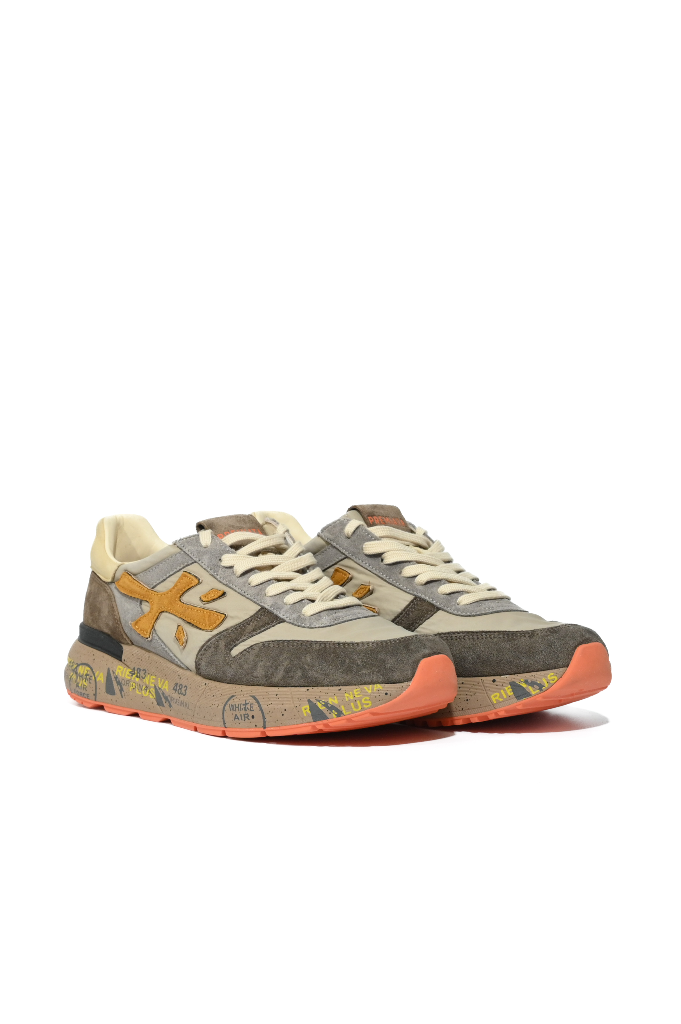 - Tomaia: combinazione di pelle scamosciata e tessuto tecnico con inserti multicolore