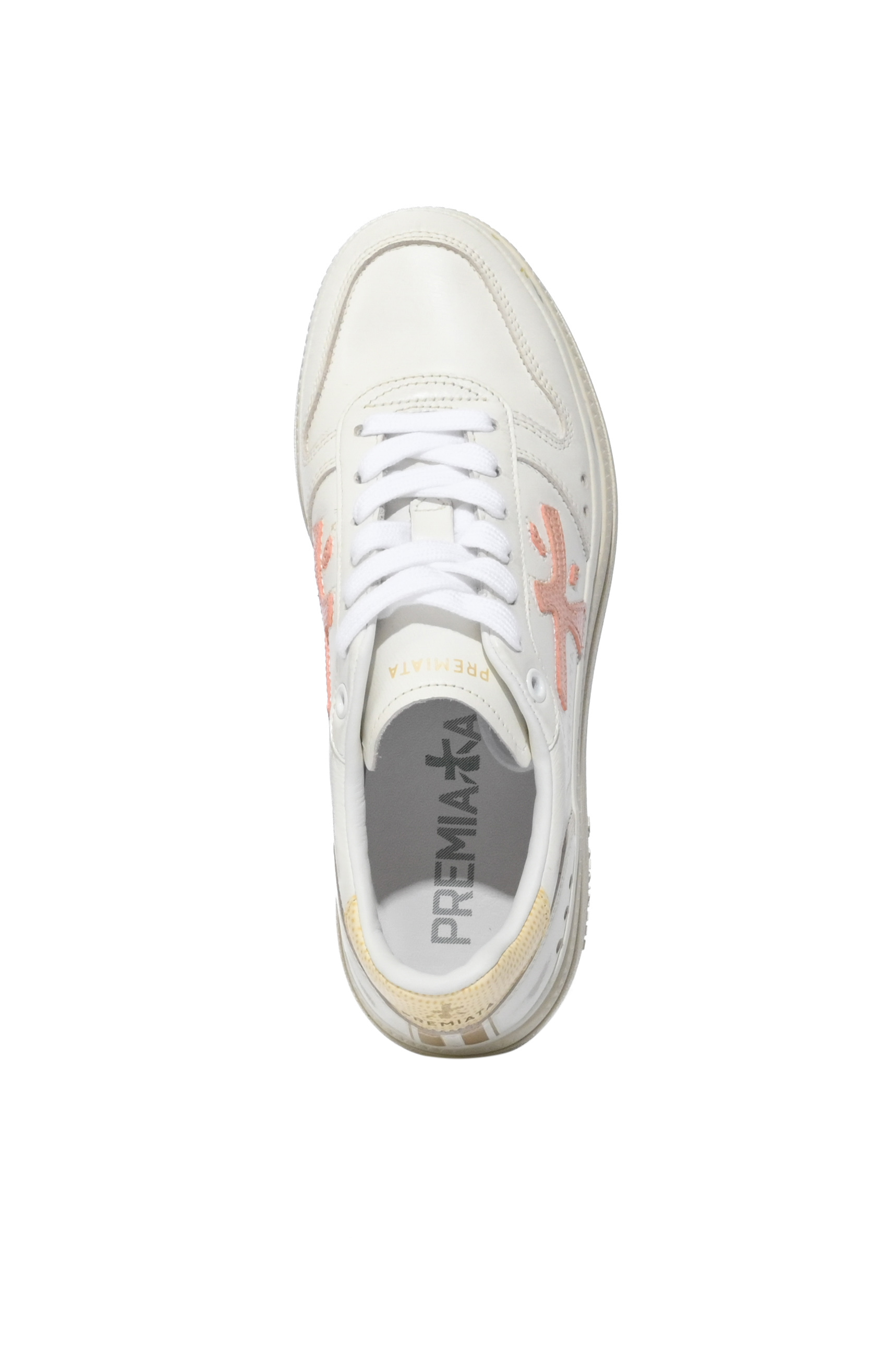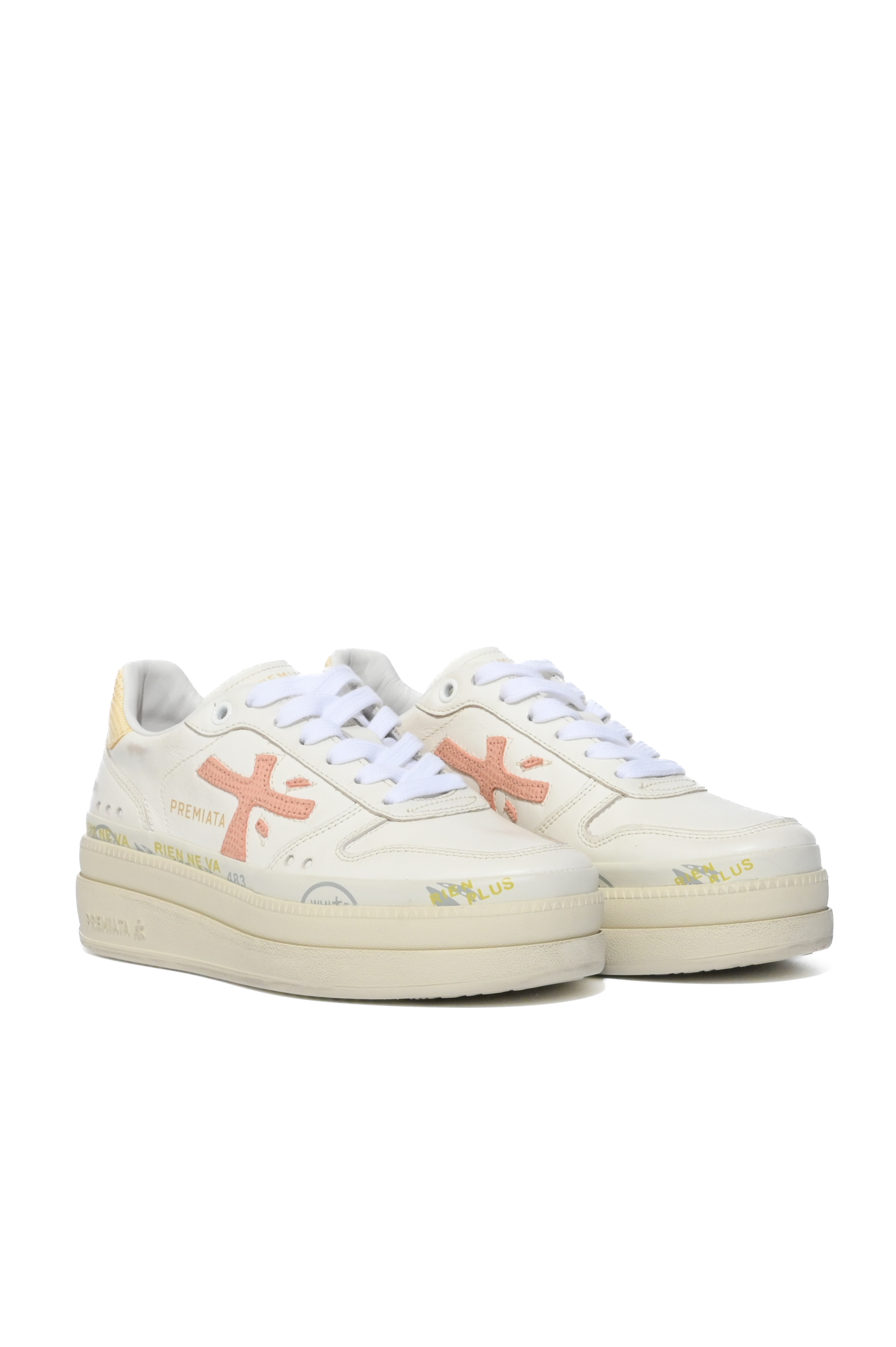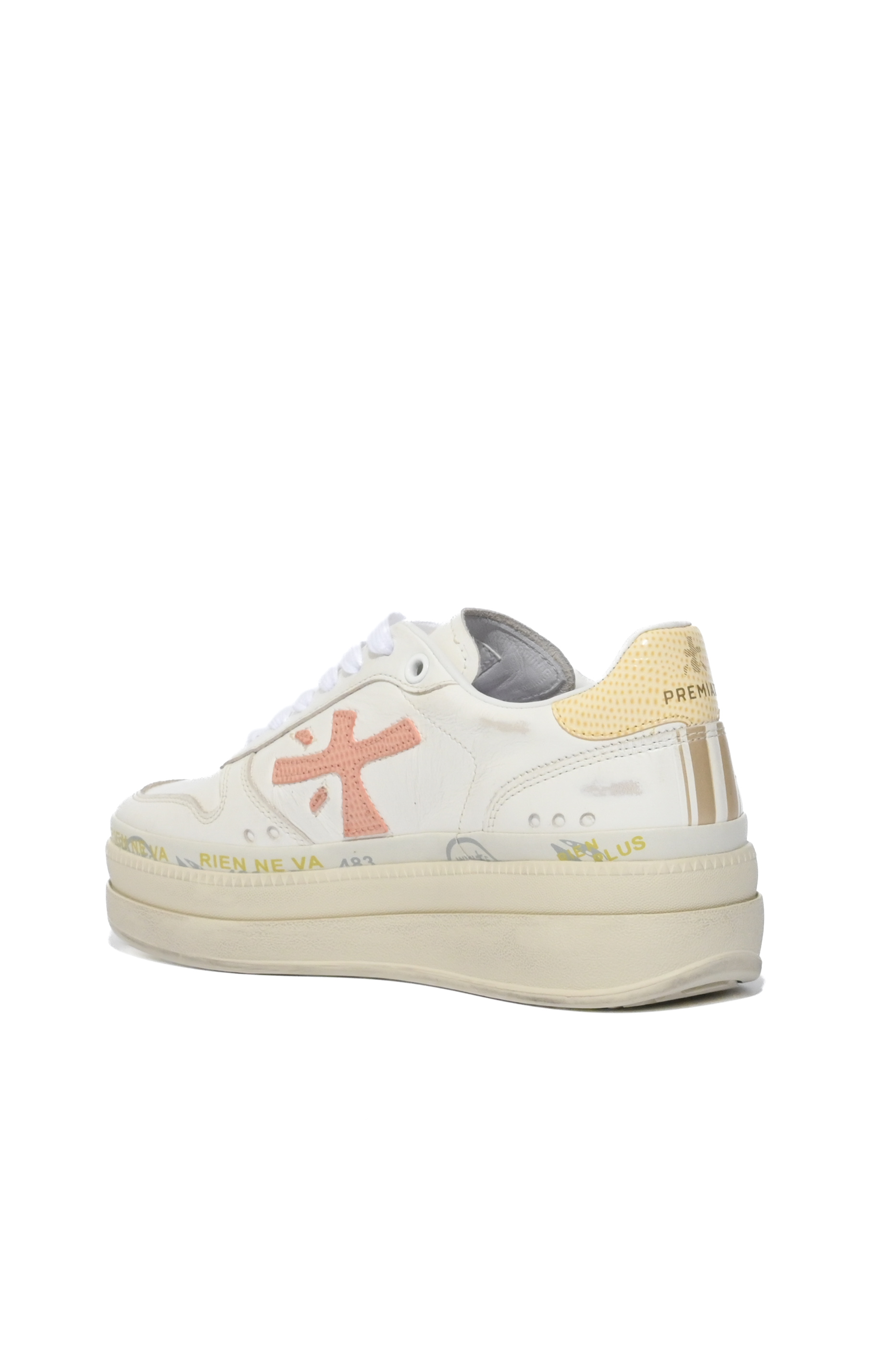 - Tomaia: pelle liscia con logo Premiata laterale applicato in tessuto a contrasto e inserto posteriore in tessuto tecnico giallo