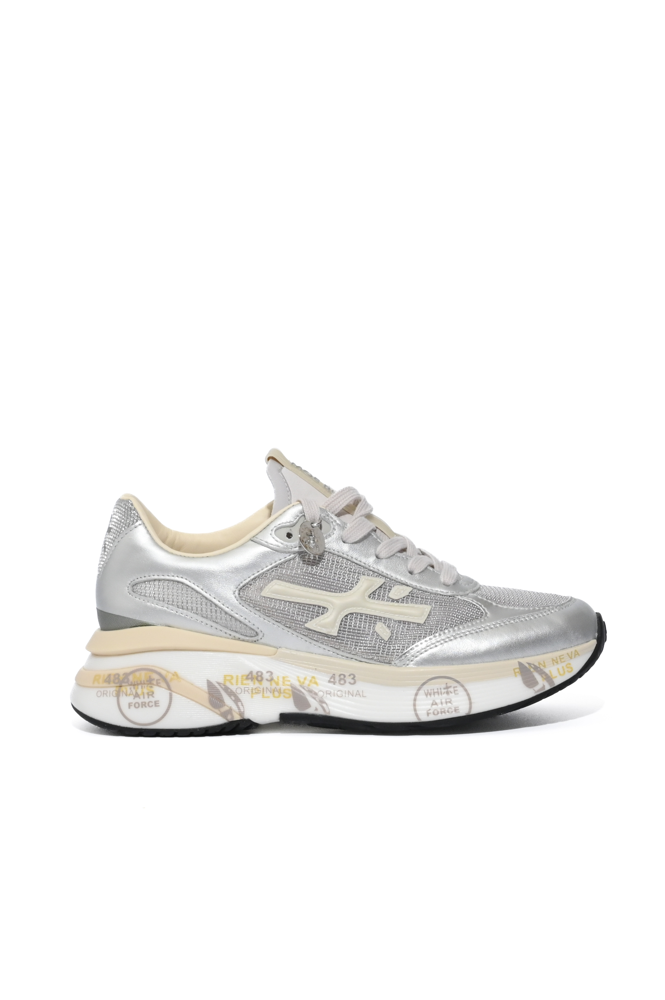 - Dettagli: design sportivo con finitura metallizzata argento, charm logato applicato ai lacci e inserti tono su tono