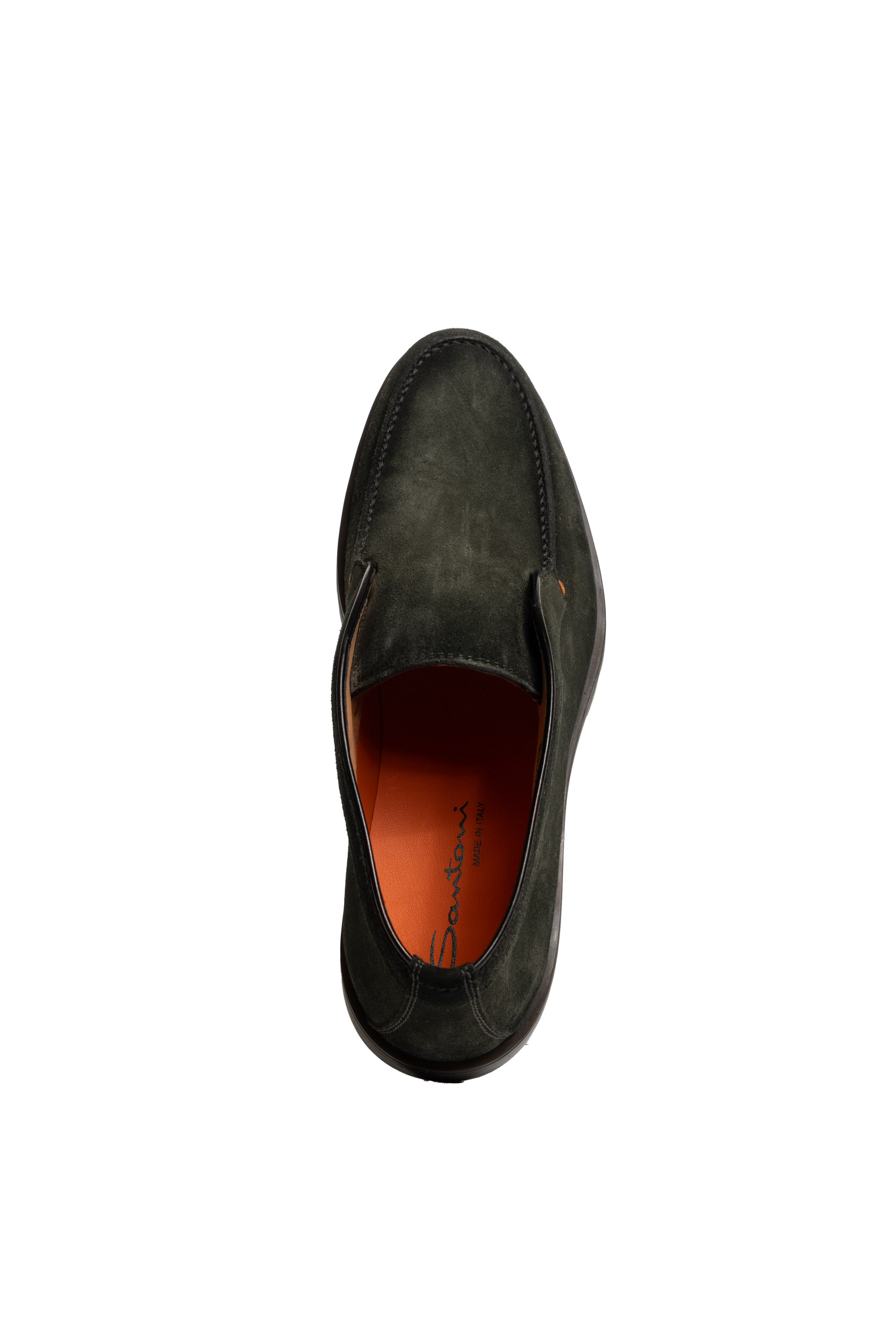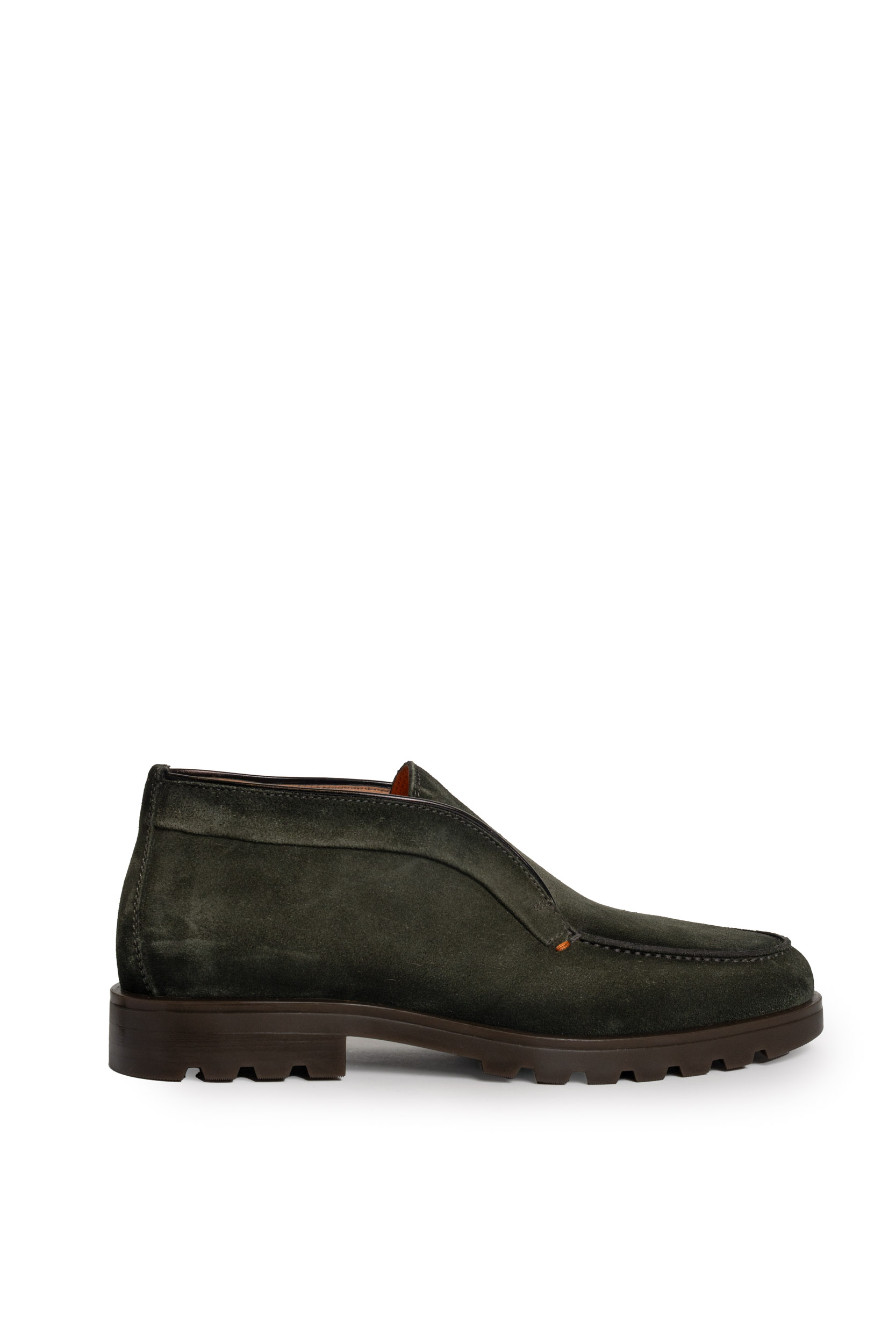 - Tomaia: In suede color verde oliva con linee pulite e silhouette elegante. Dettagli cuciti a mano e profilo curvato che avvolge la caviglia, tipico della lavorazione artigianale Santoni.