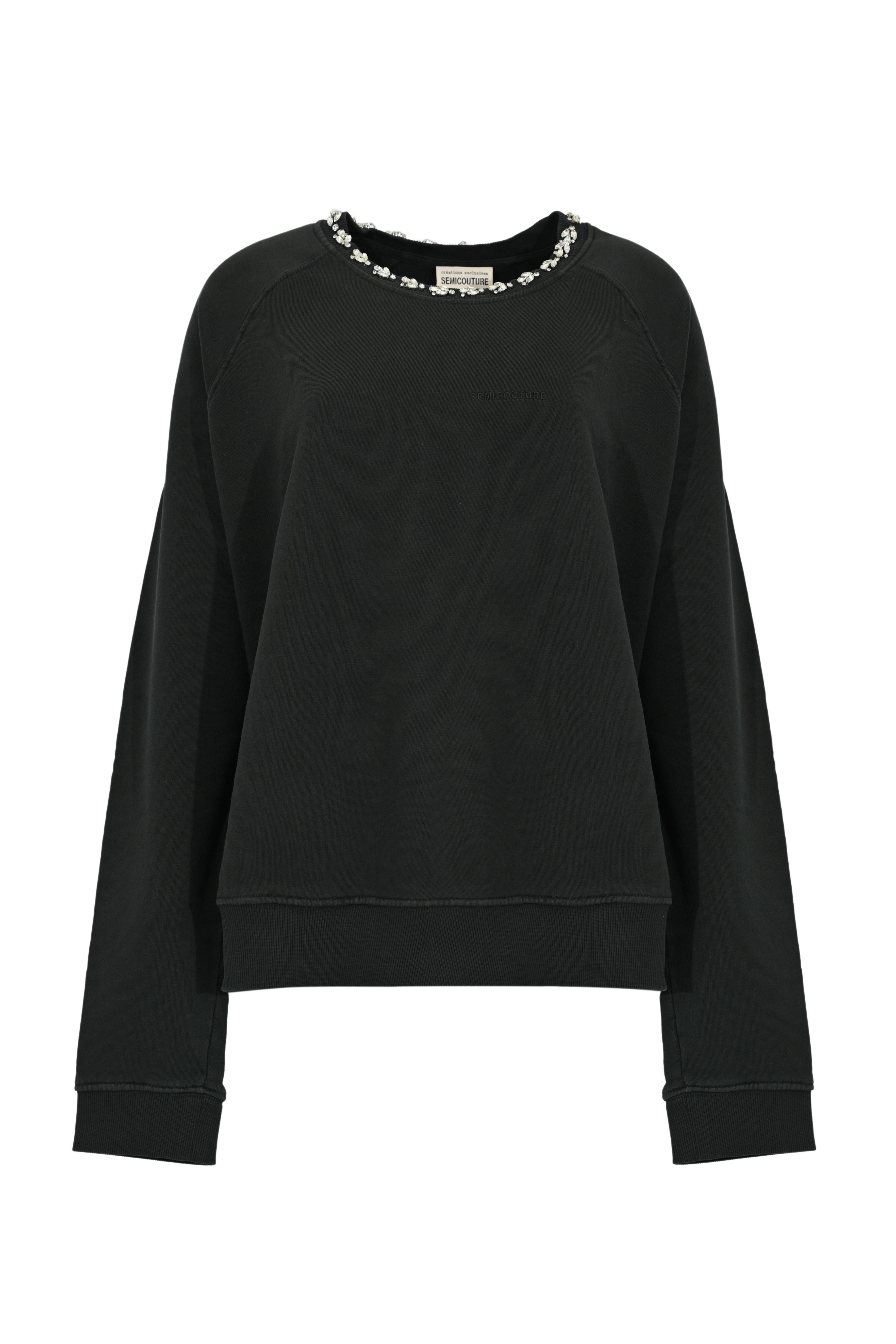 - Dettagli: Logo Semicouture ricamato tono su tono sul petto; bordo a costine su polsini e fondo; lavorazione morbida in felpa di cotone con applicazione gioiello sullo scollo per un tocco luminoso ed elegante