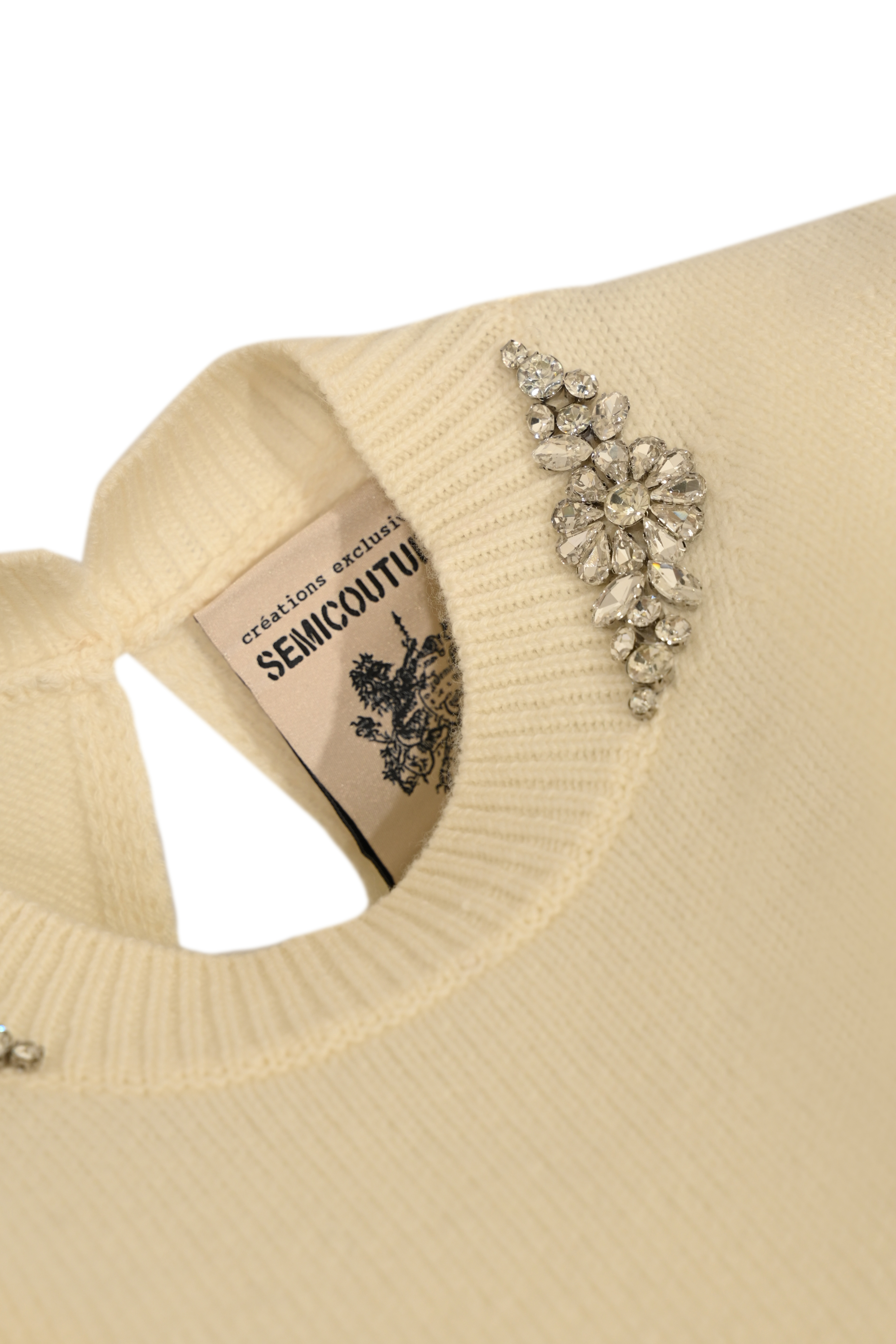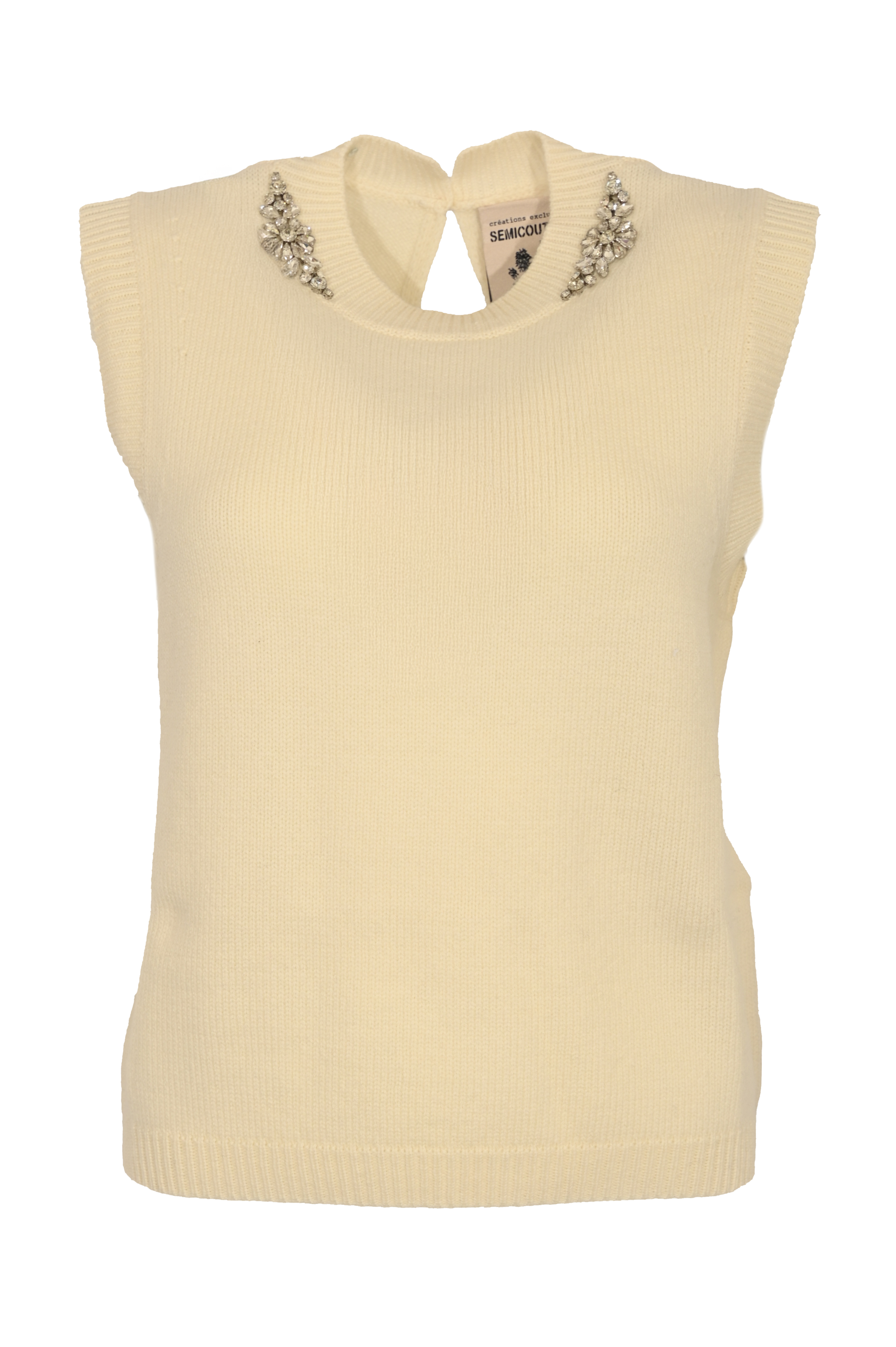 - Dettagli: Applicazioni gioiello con cristalli sul colletto, bordi a costine, taglio pulito e femminile