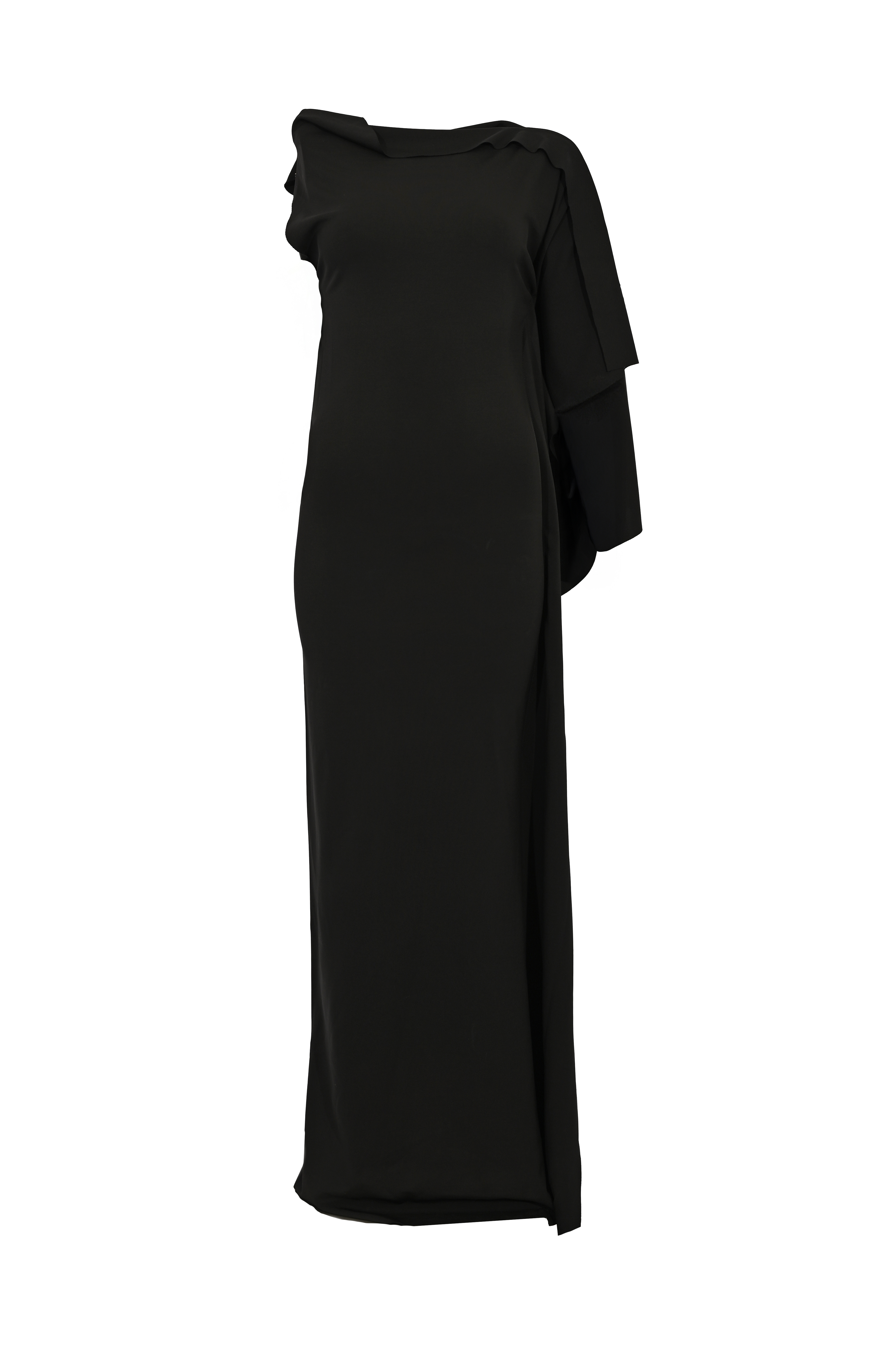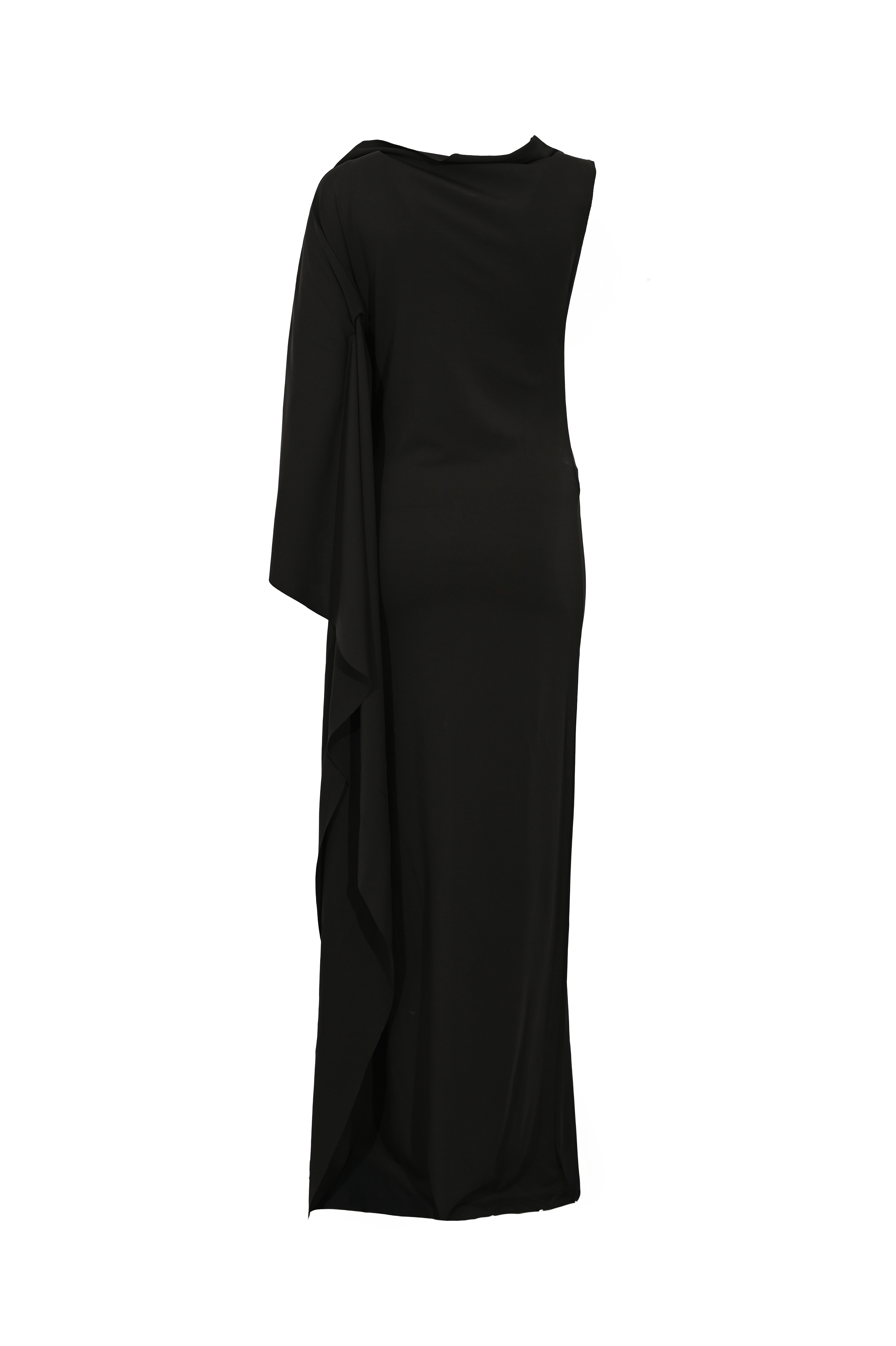 - Dettagli: taglio aderente, spacco laterale sul fondo, dettaglio mantella sulla spalla, linea elegante e fluida