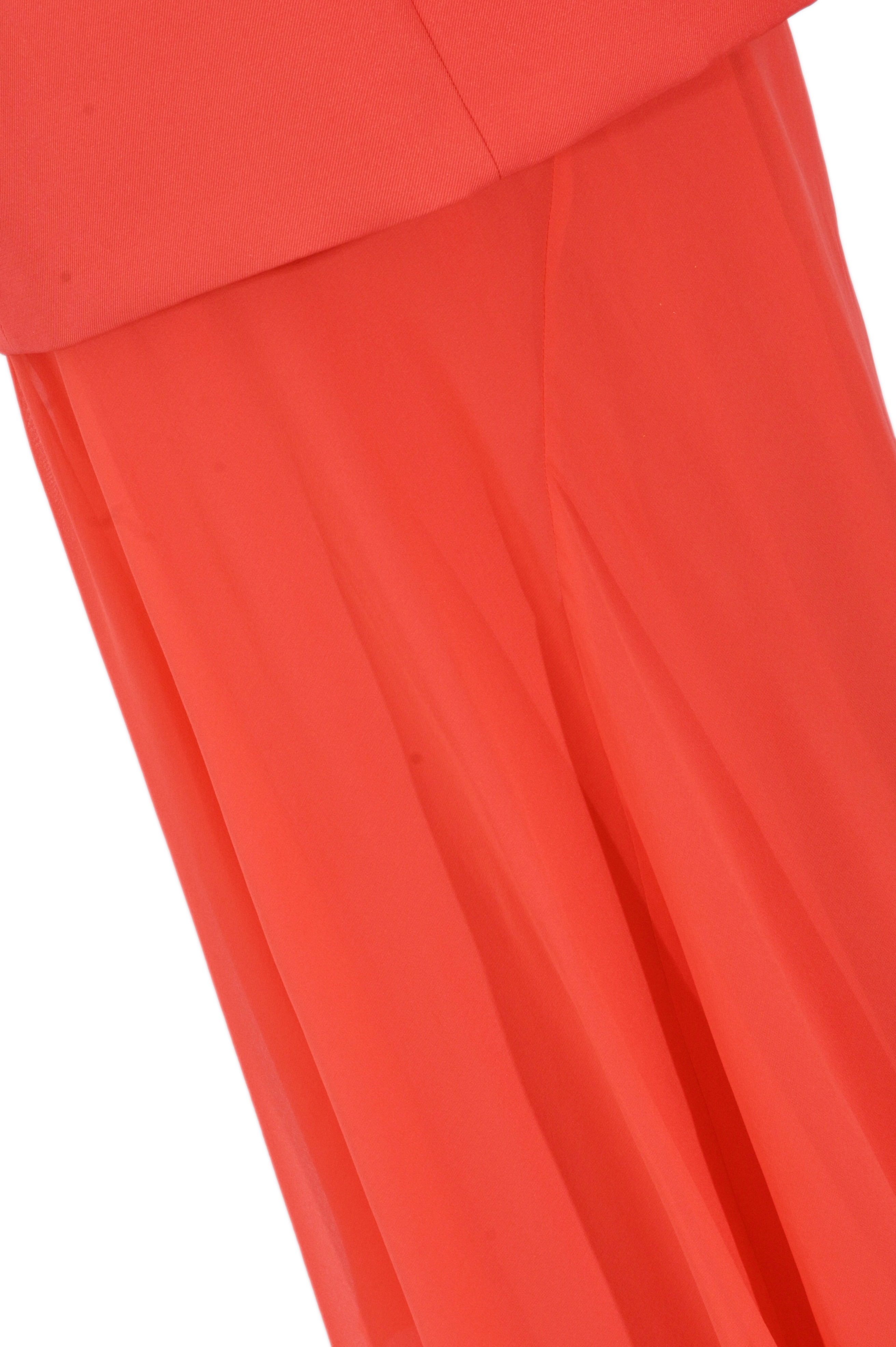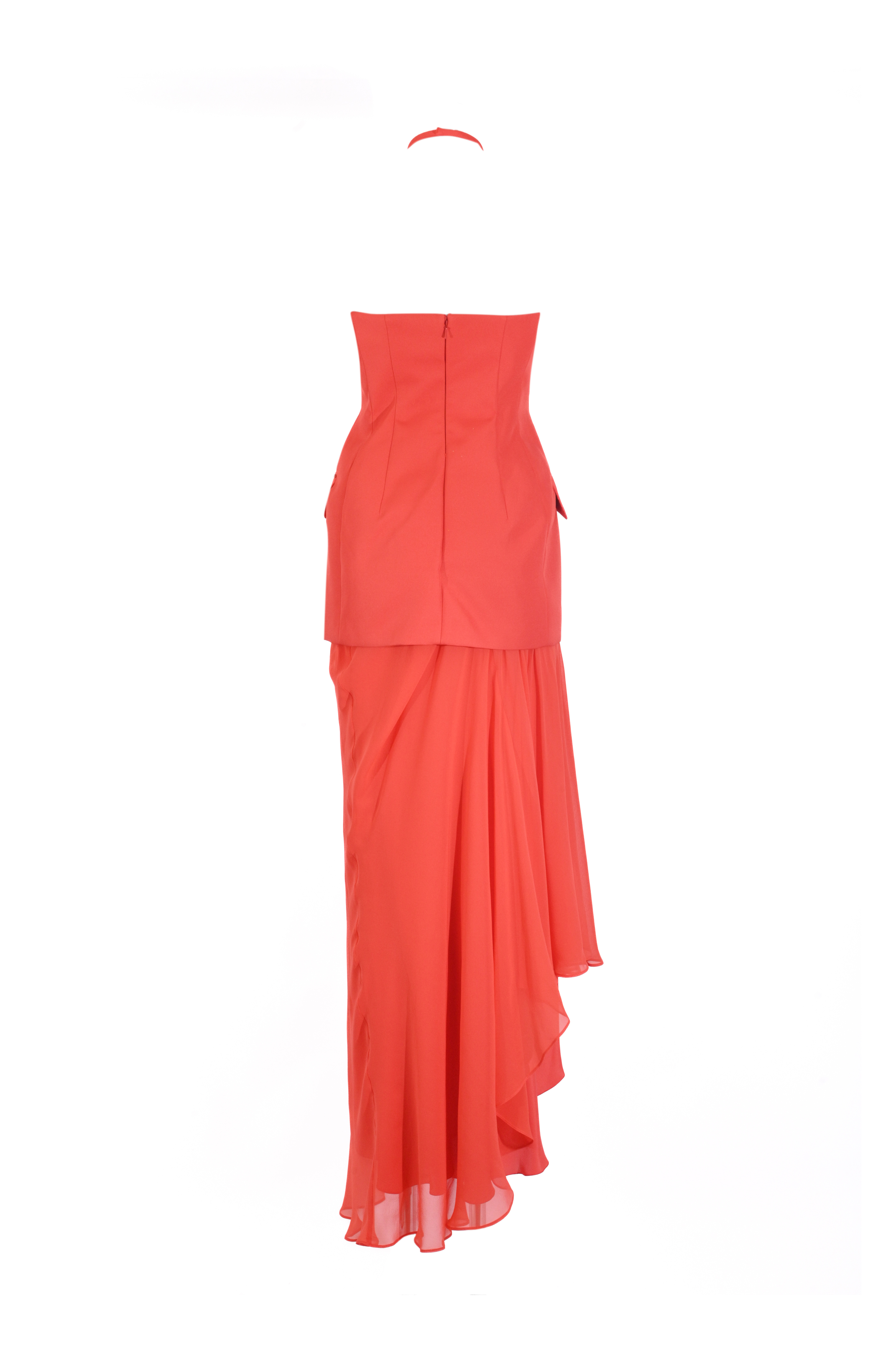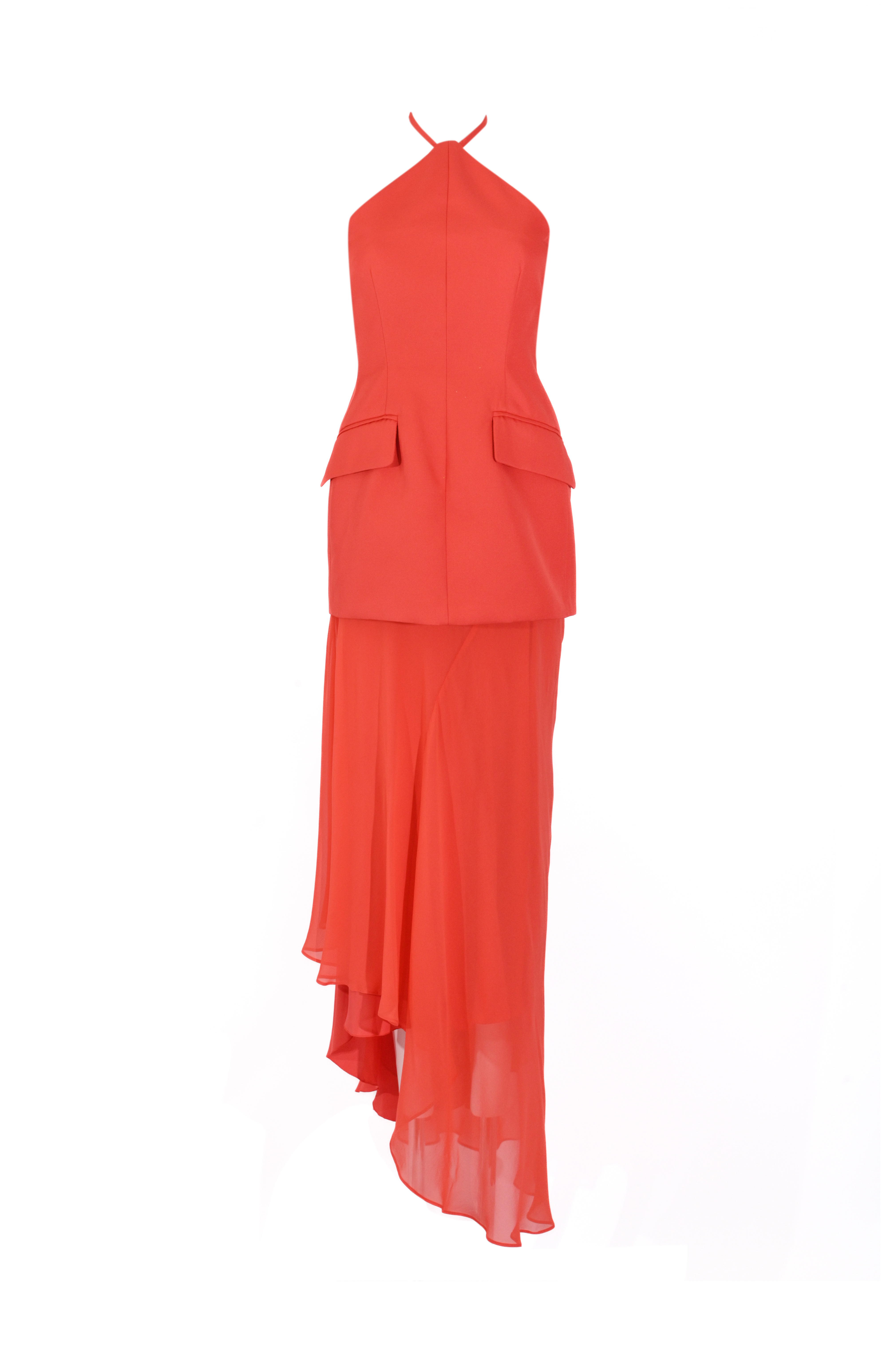 - Dettagli: costruzione a doppio materiale, parte superiore effetto bustier in twill, gonna in georgette con balze morbide e trasparenze