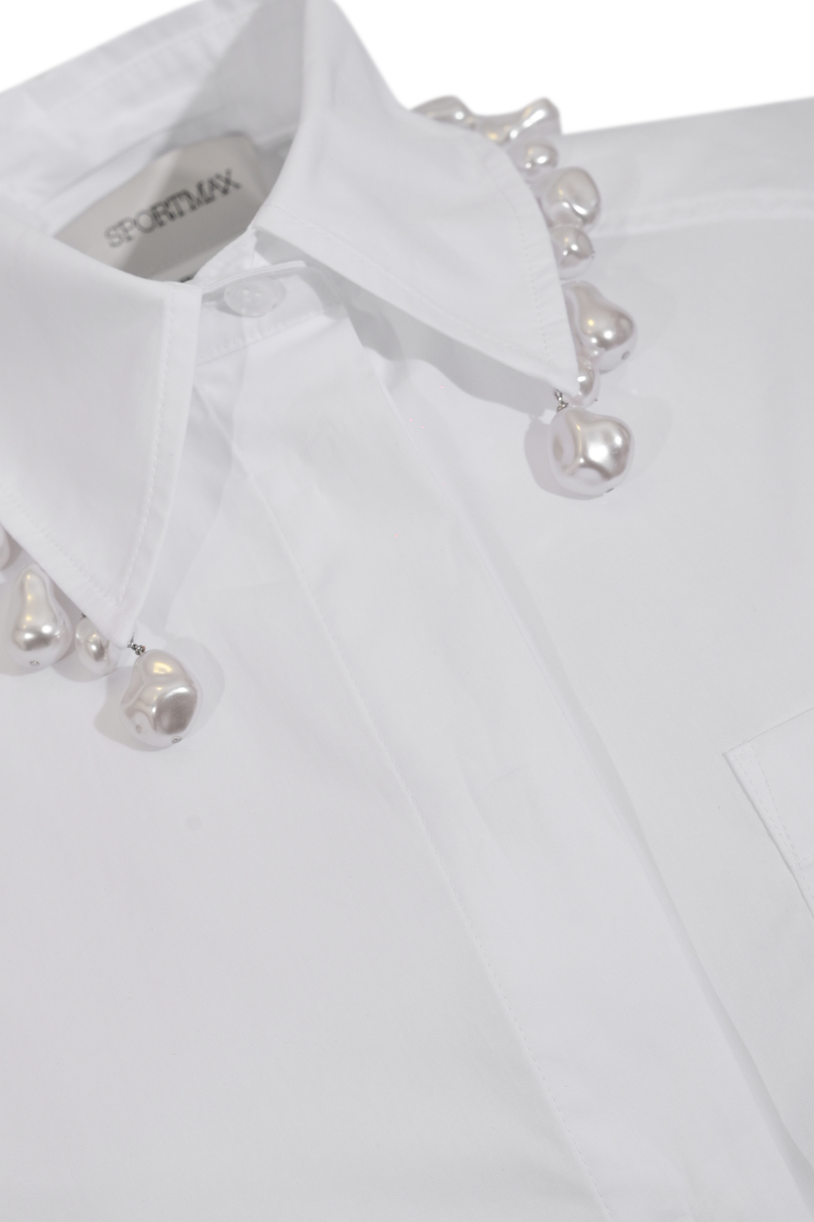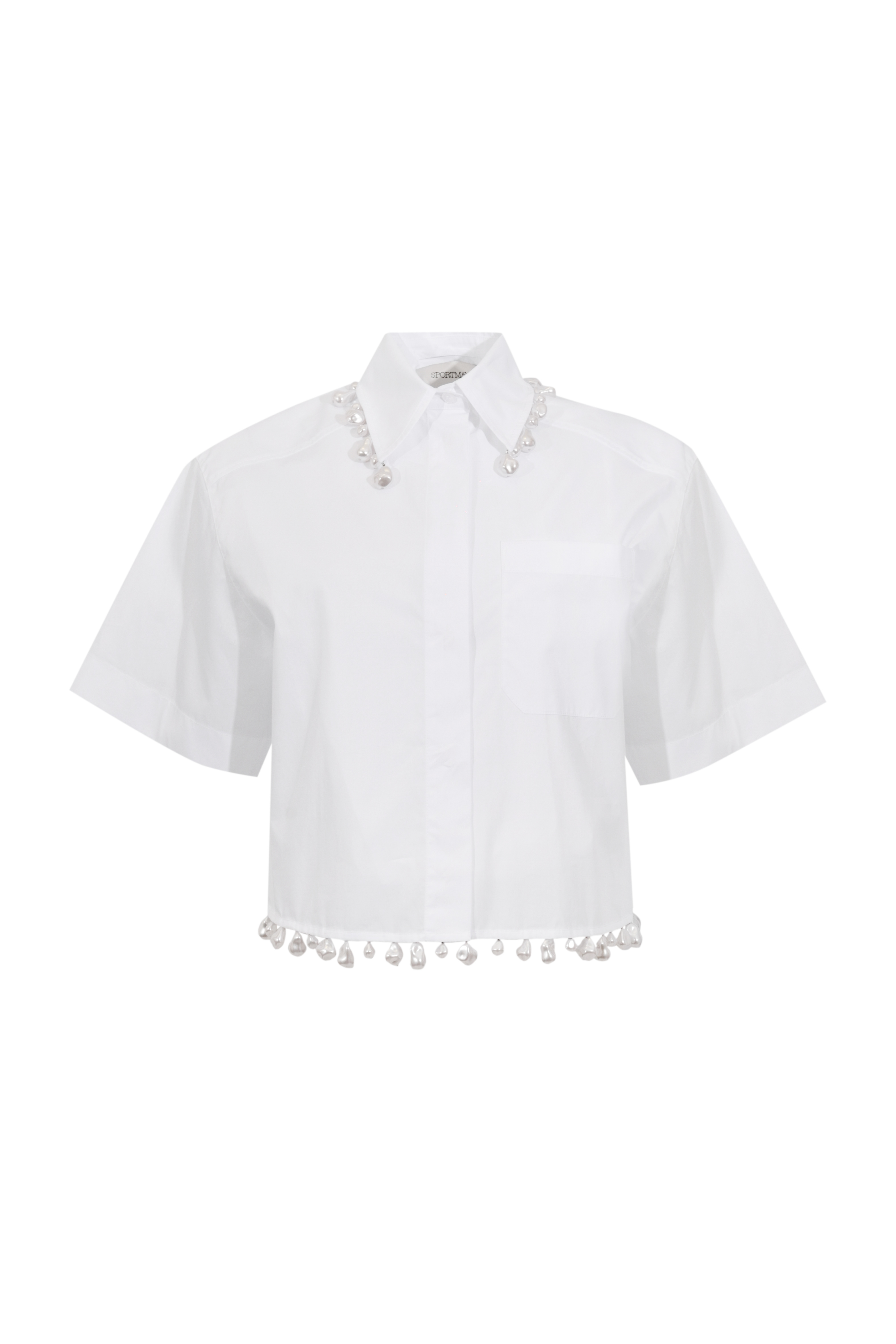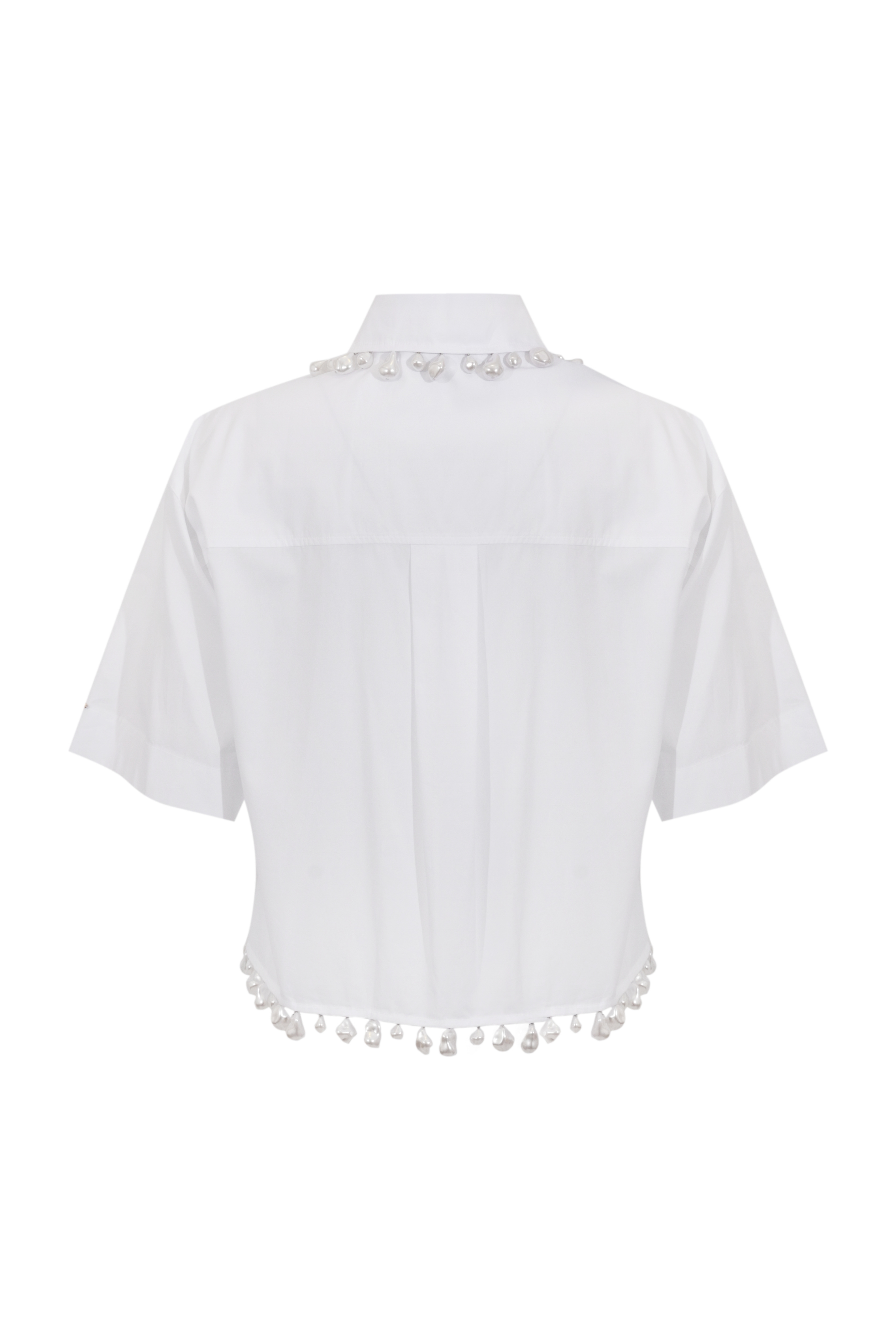 - Dettagli: applicazioni di perle su colletto e fondo, design cropped