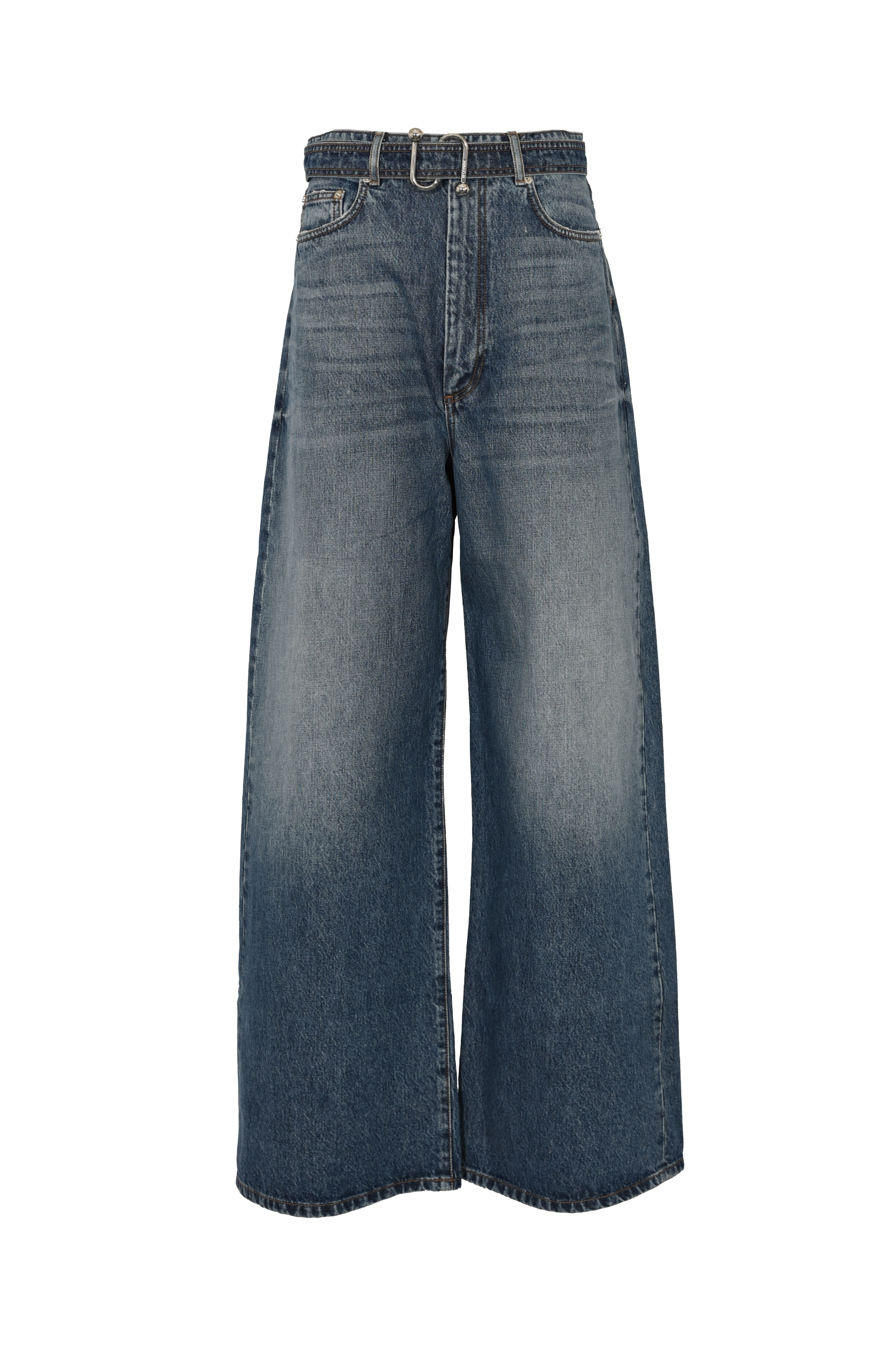 - Vita: alta, con passanti e cintura integrata in denim con fibbie metalliche