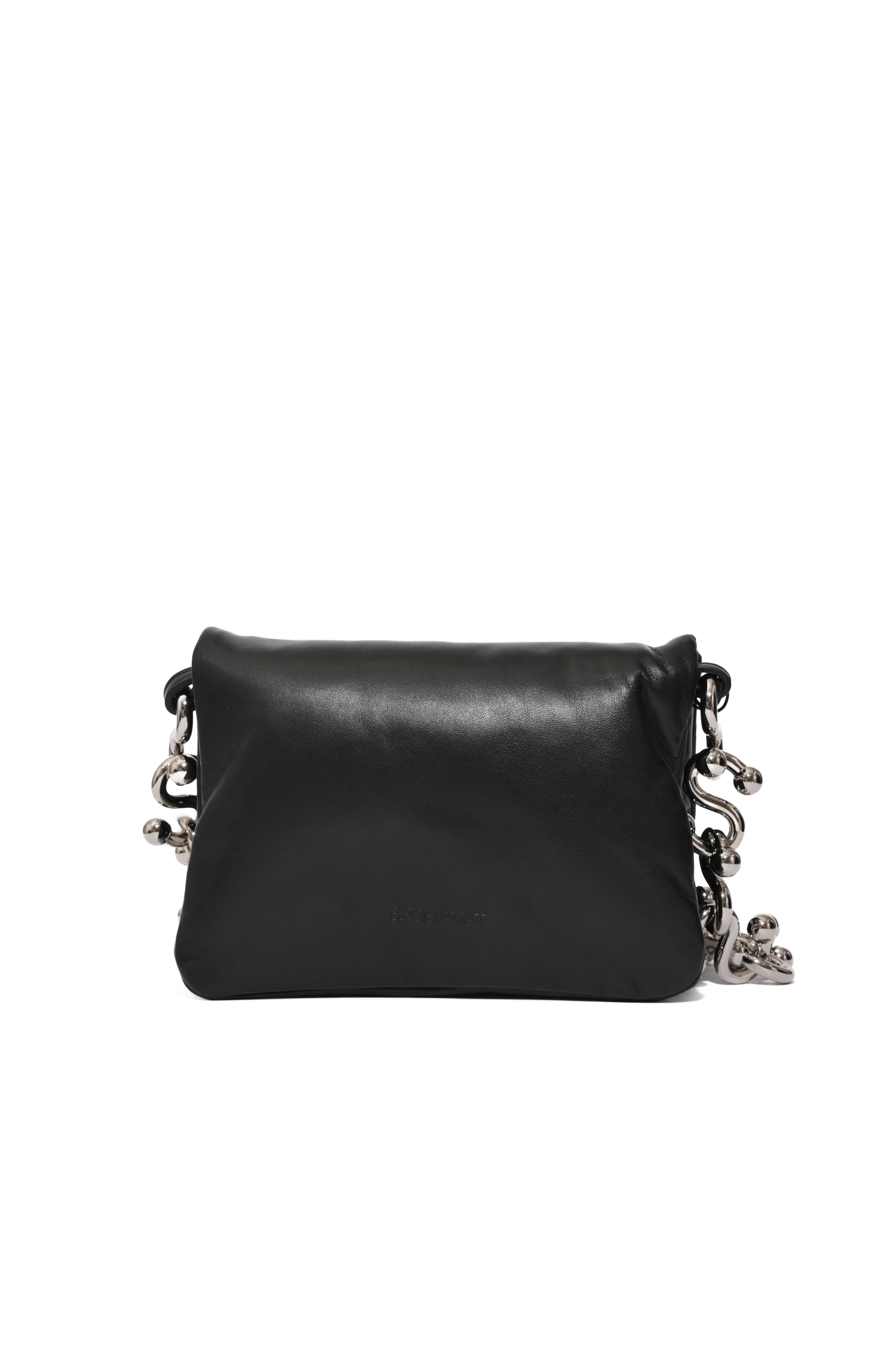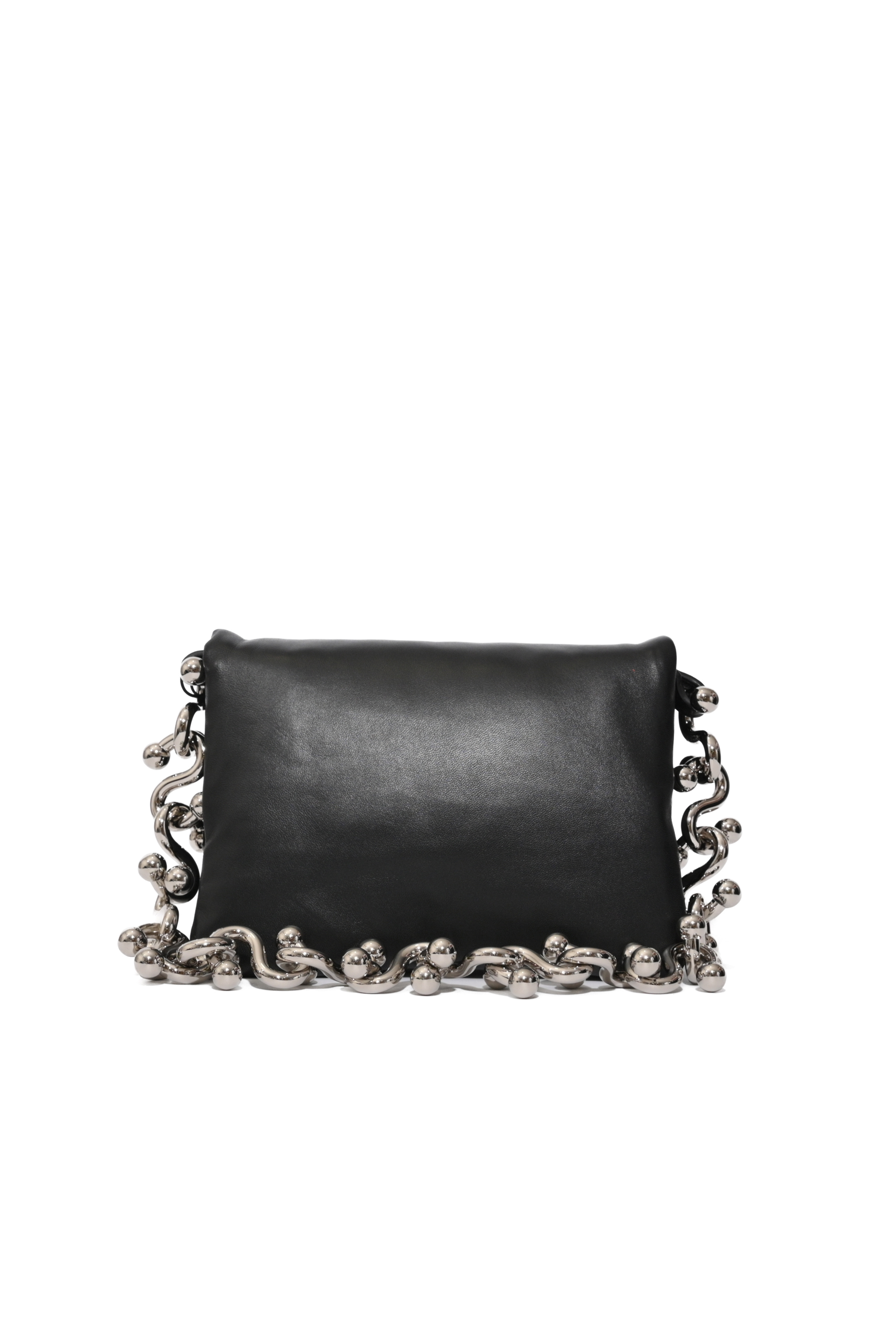 - Dettagli, finitura liscia, logo impresso sul davanti, catena gioiello che incornicia i lati della borsa