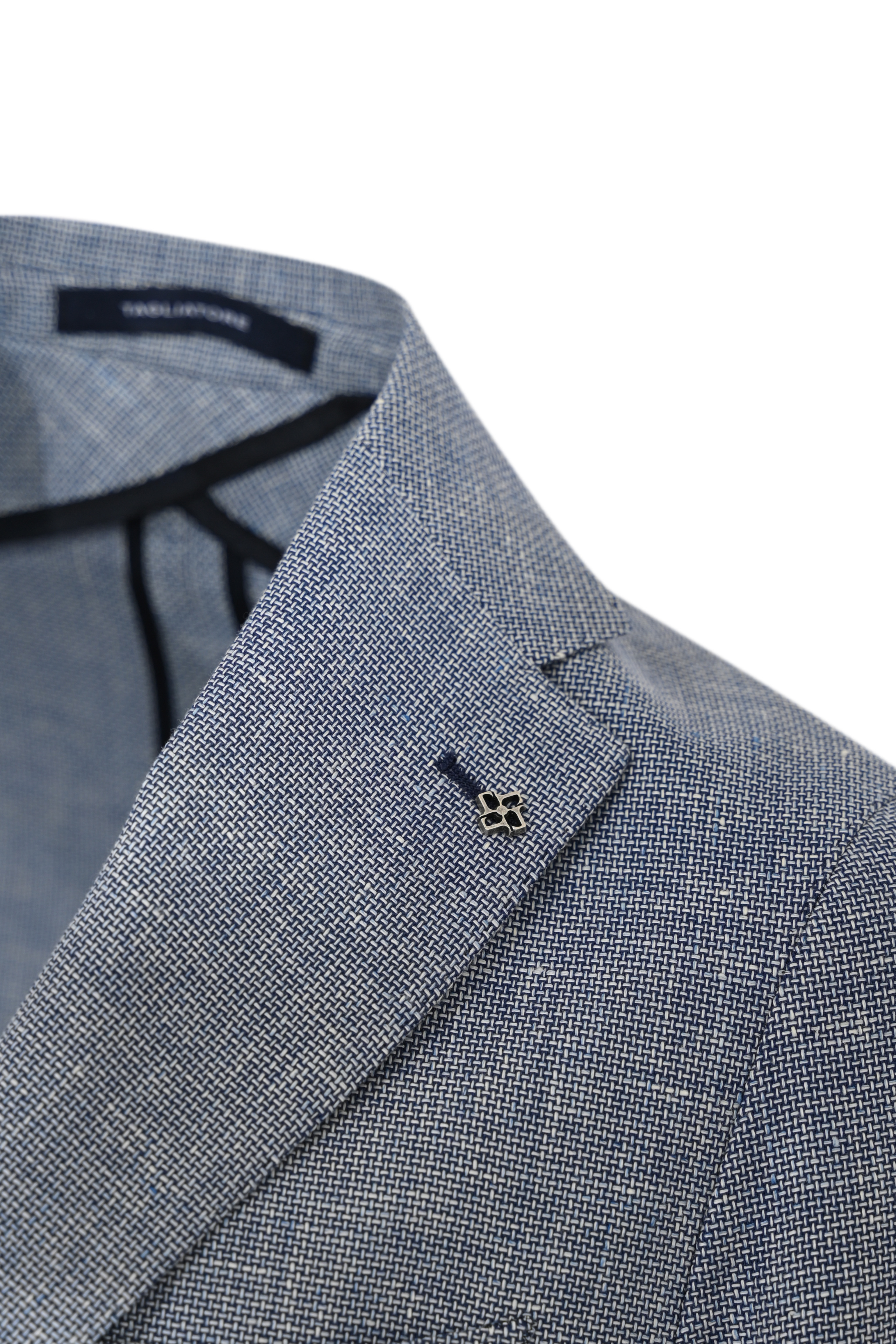 - Dettagli: spilla iconica sul rever, spacchi posteriori