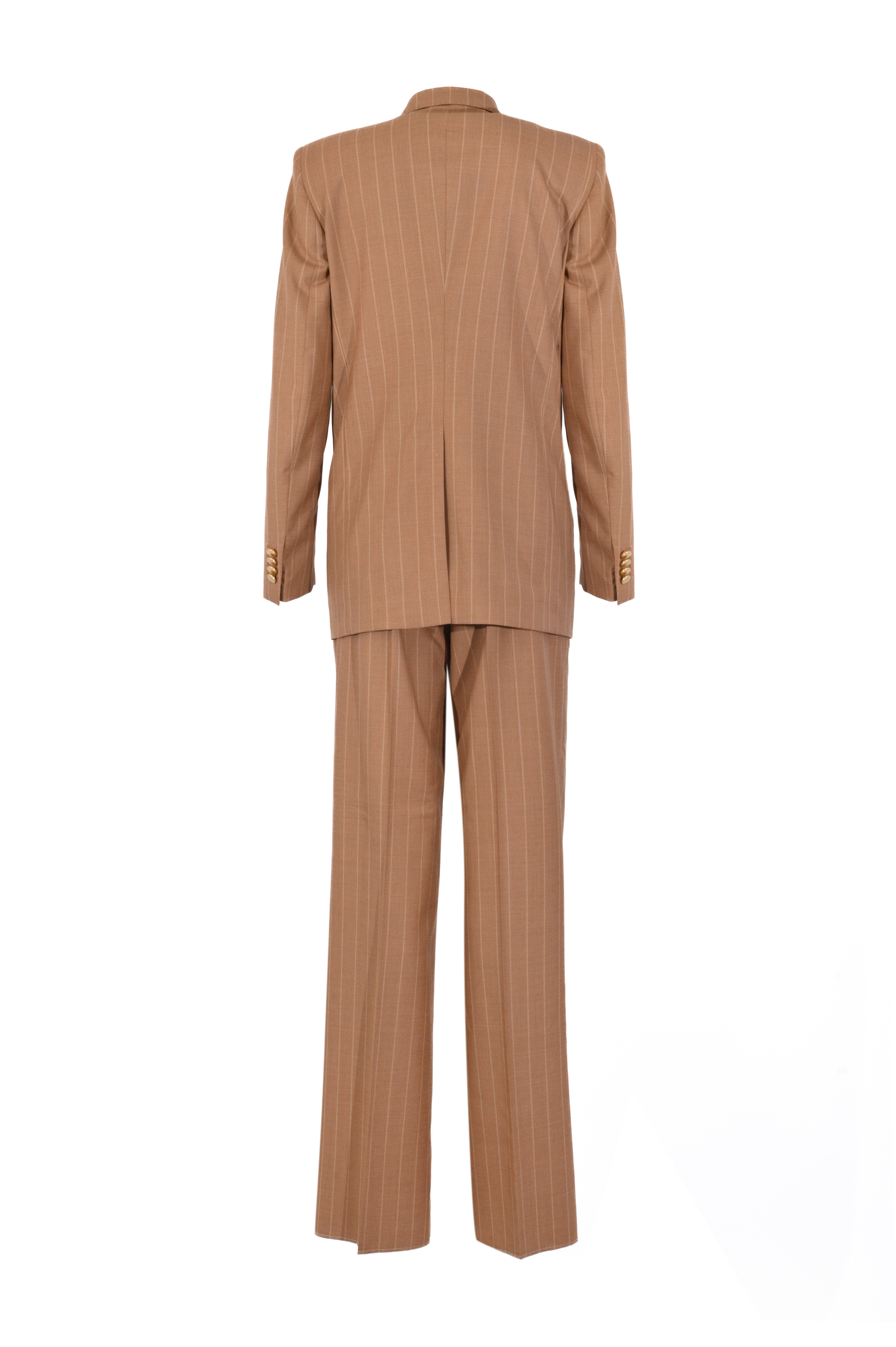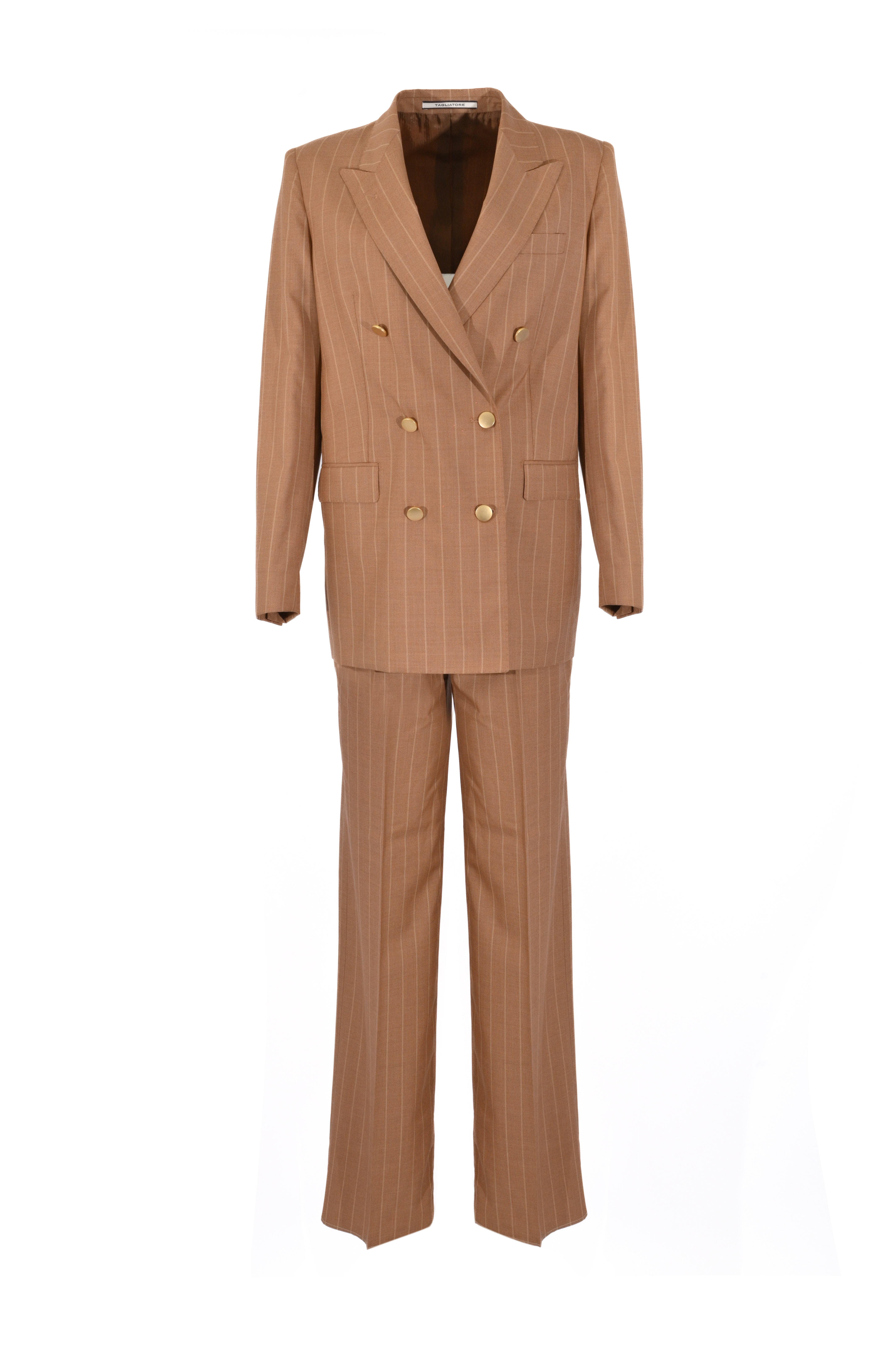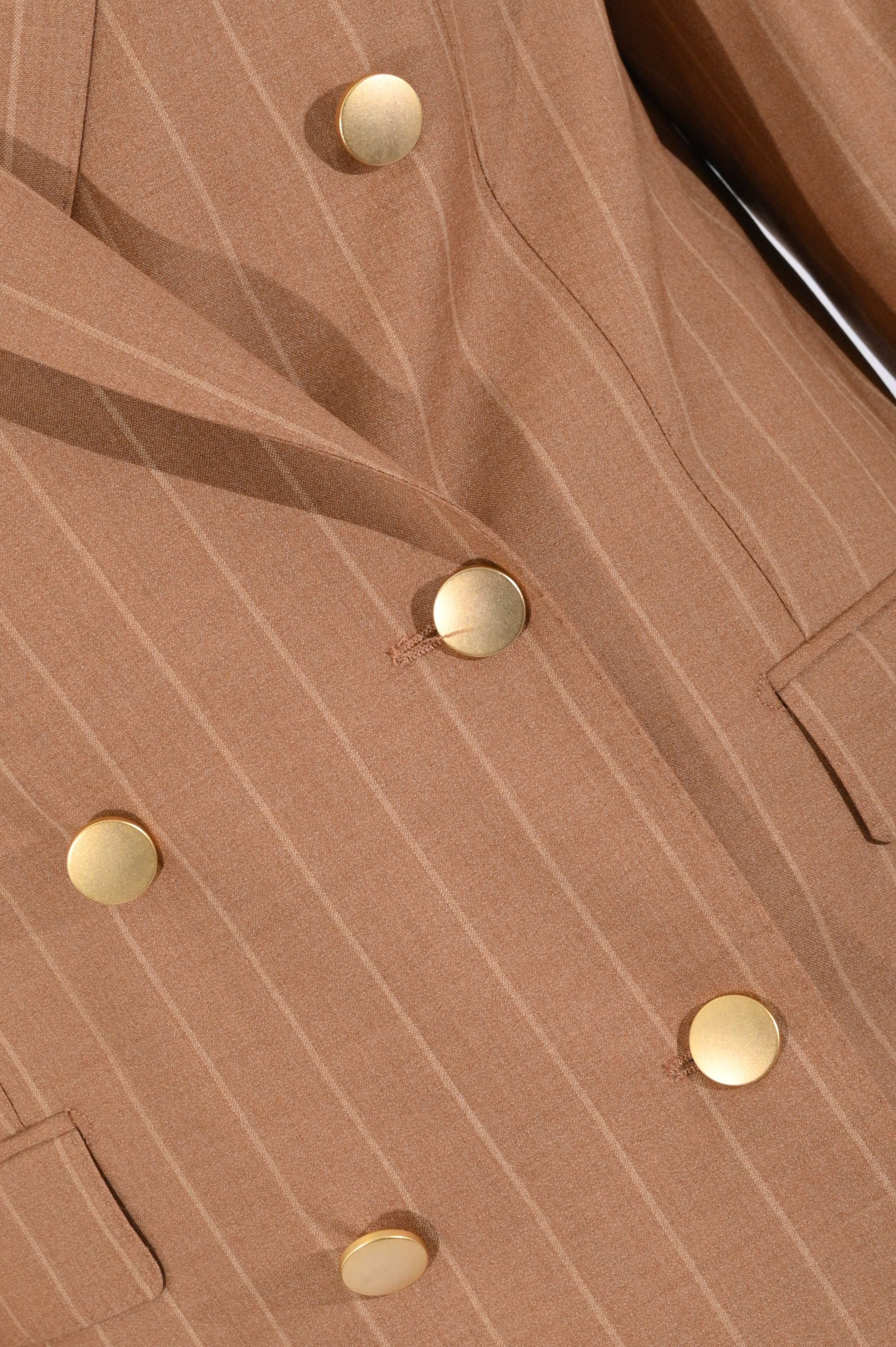 - Dettagli: completo composto da giacca doppiopetto e pantalone coordinato, bottoni dorati, righe verticali eleganti, linea sartoriale, pantalone a gamba dritta con chiusura frontale