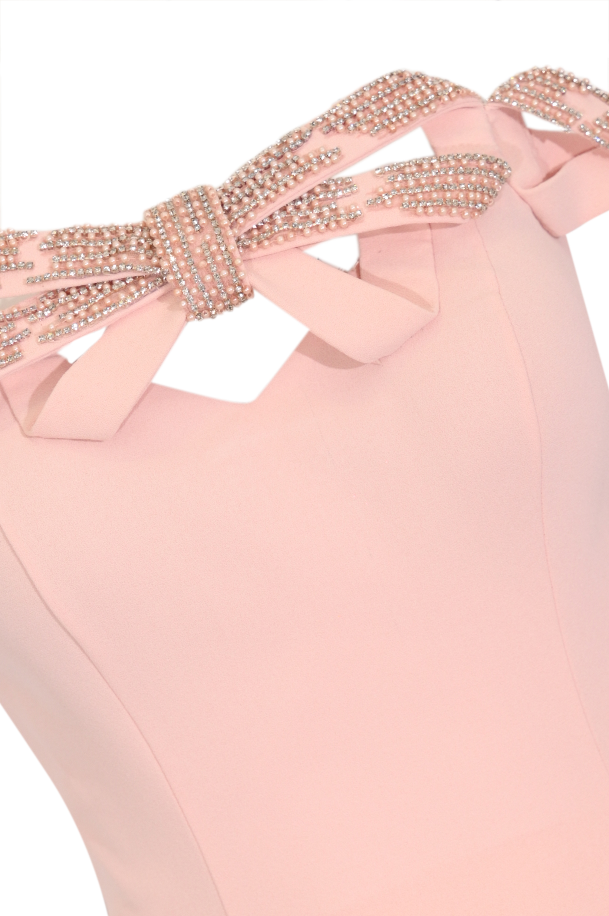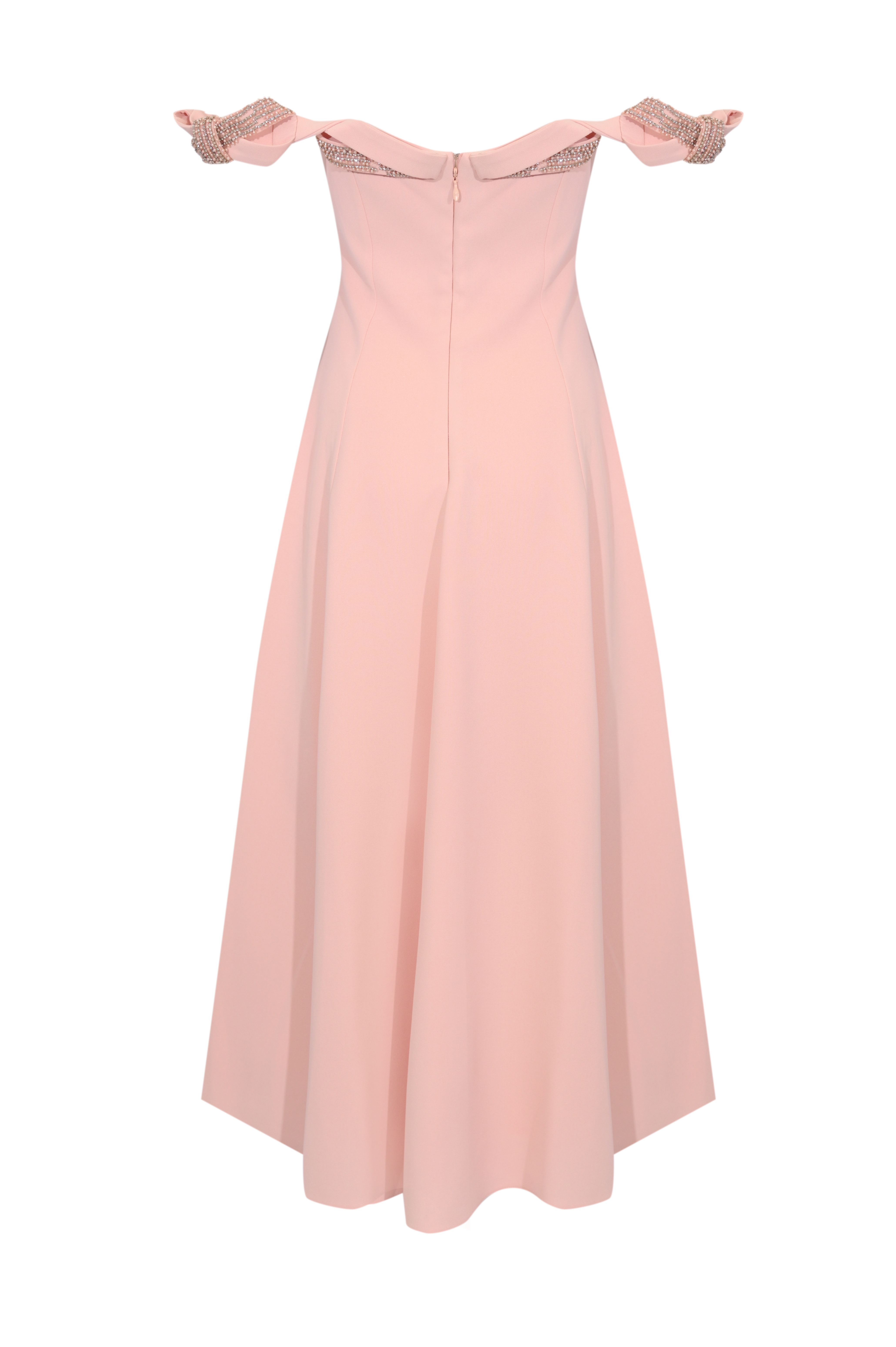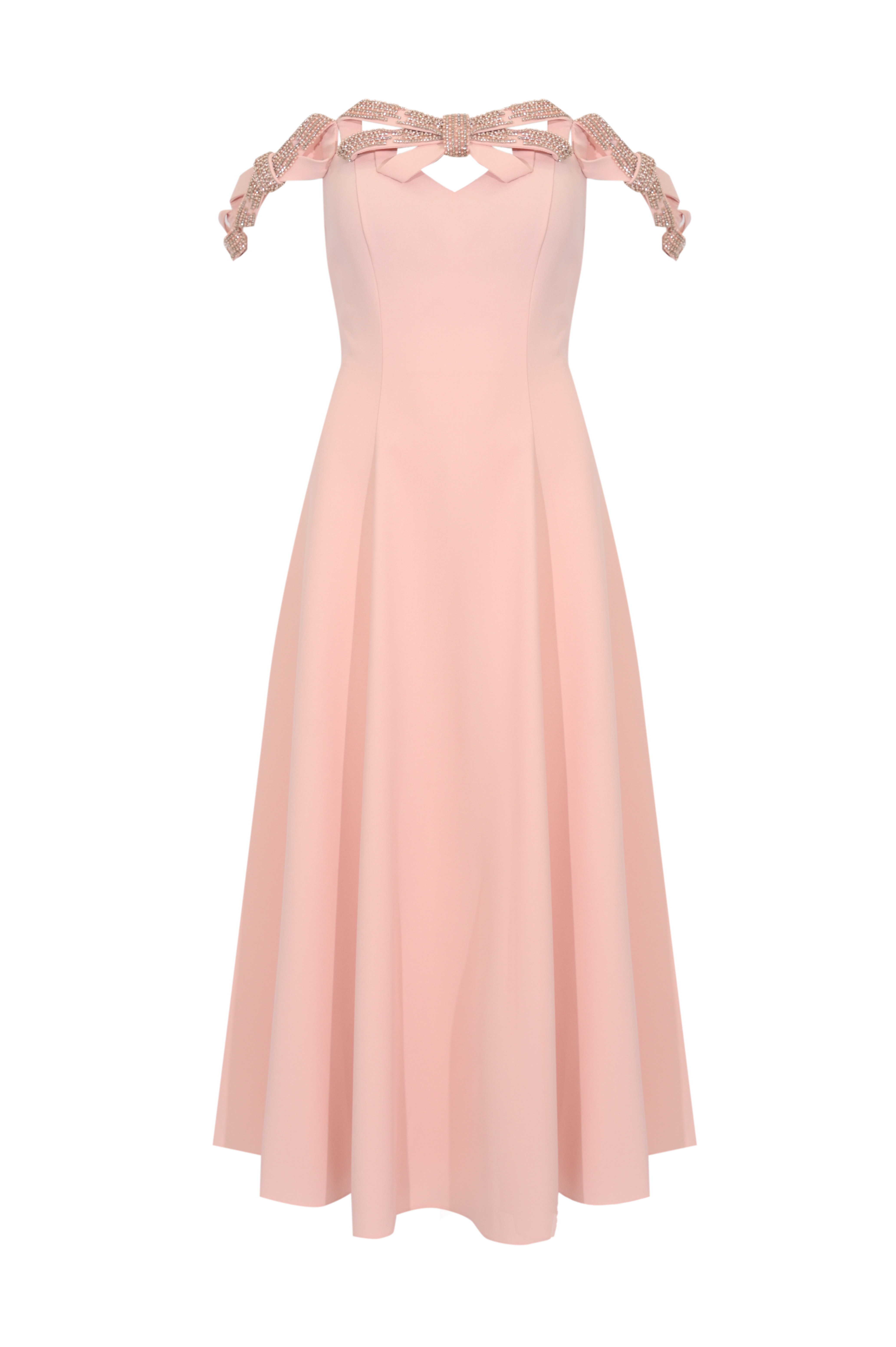 - Dettagli: linea elegante e svasata, corpetto strutturato, applicazioni di strass e perline sulle spalline e sullo scollo con motivo a fiocco centrale, gonna ampia e fluida