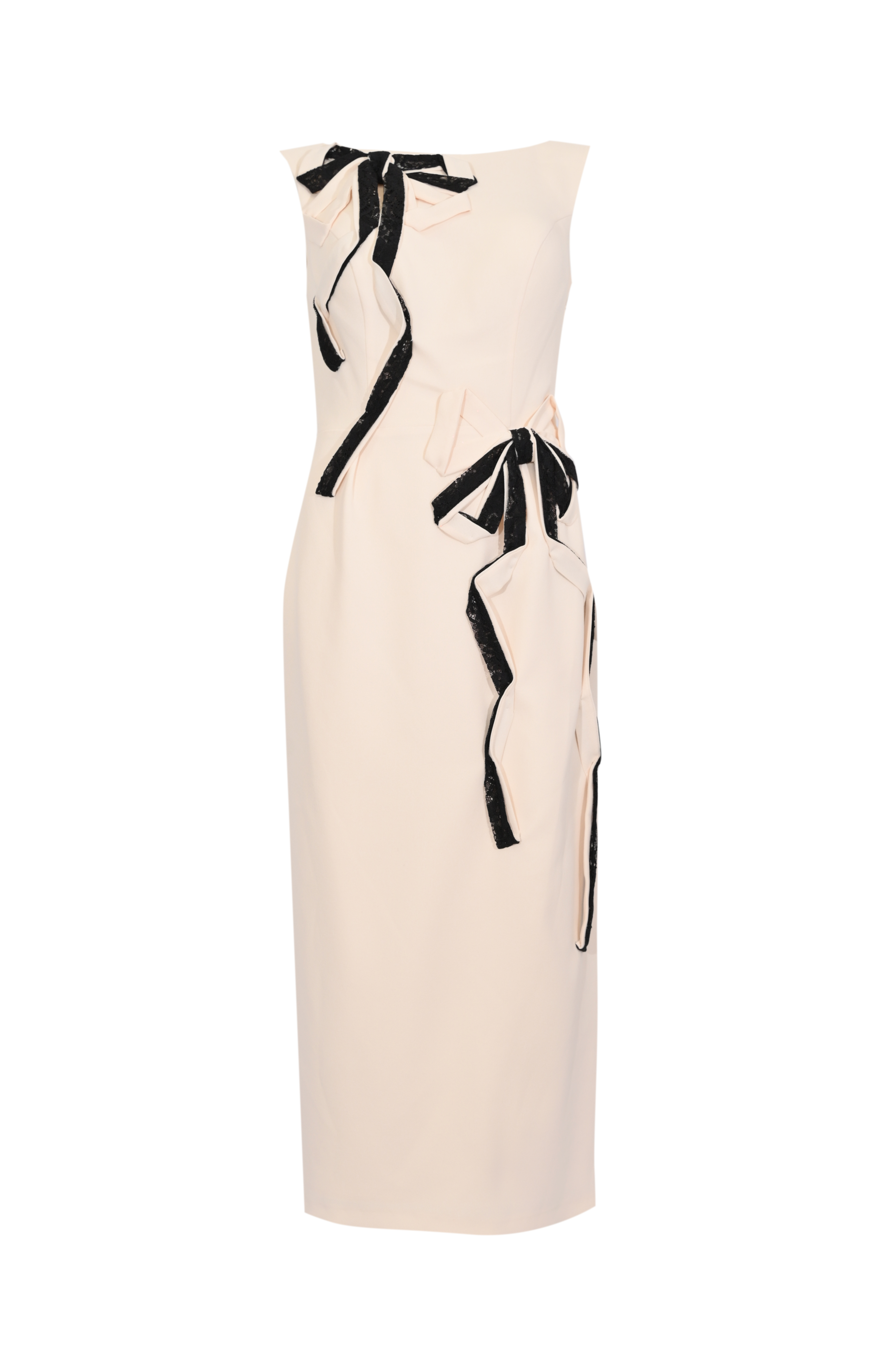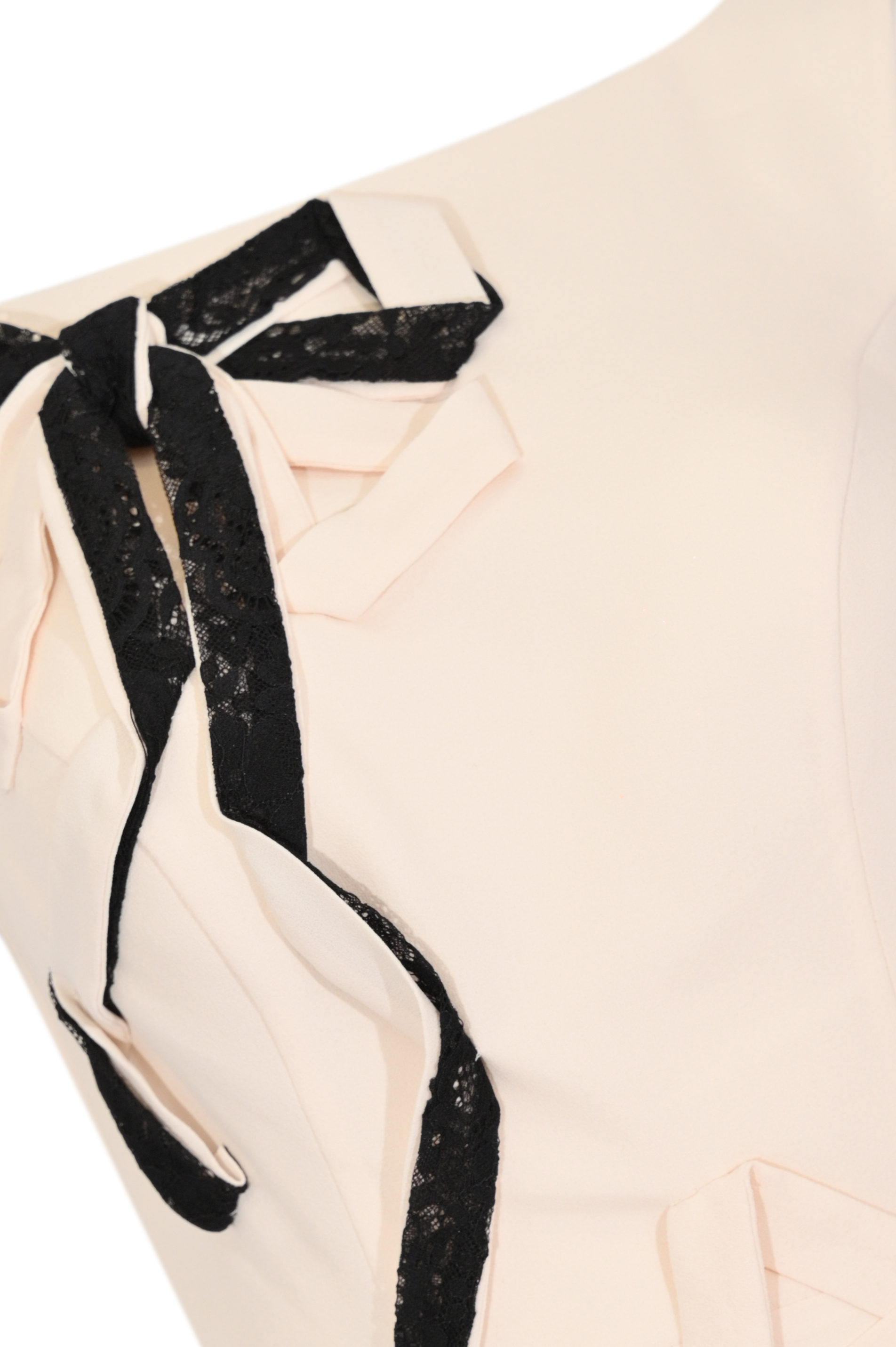 - Dettagli: linea elegante e aderente, applicazioni di fiocchi decorativi con inserti in pizzo a contrasto sul davanti e sul fianco, scollo posteriore profondo a V, spacco frontale sul fondo