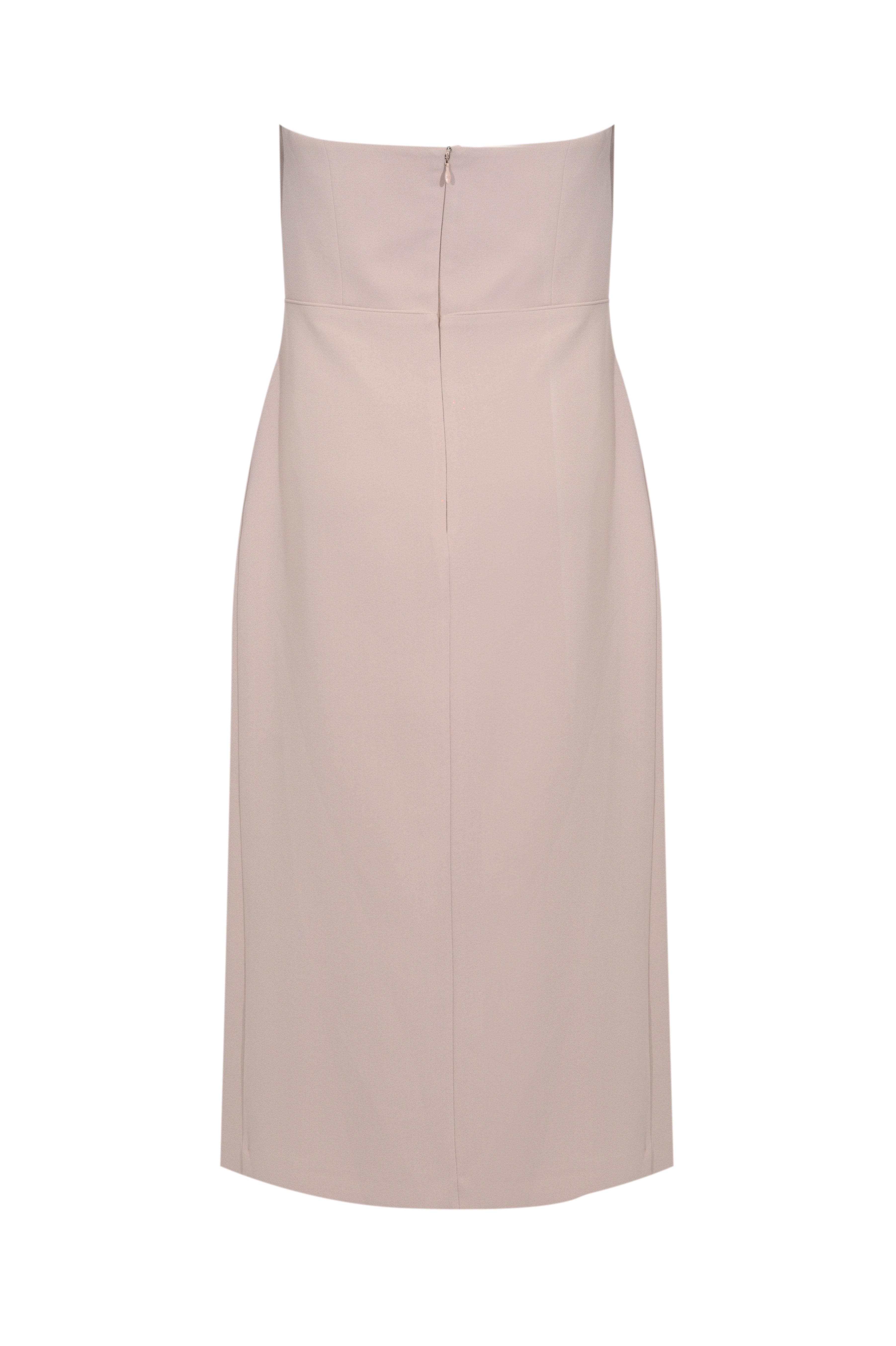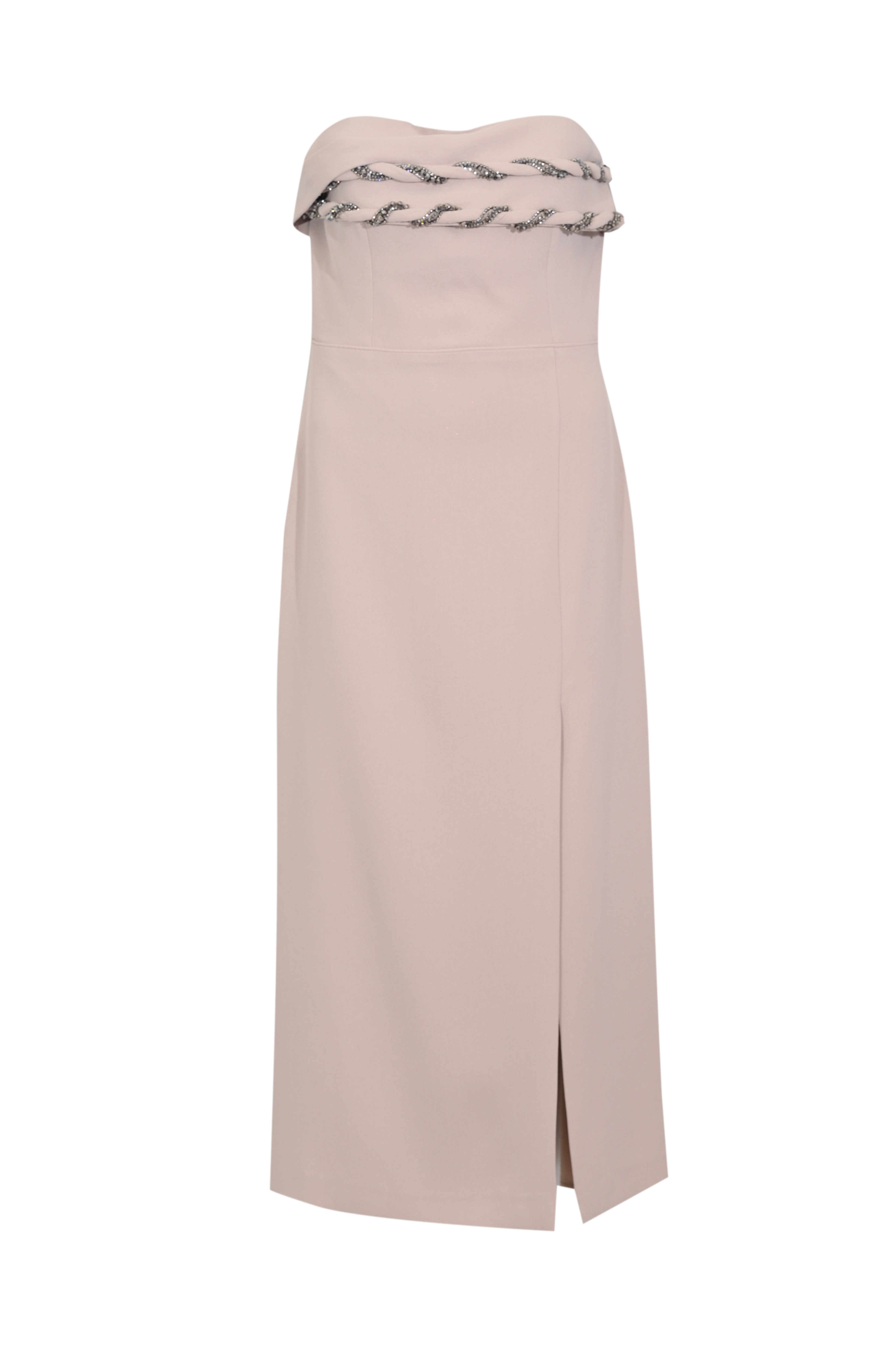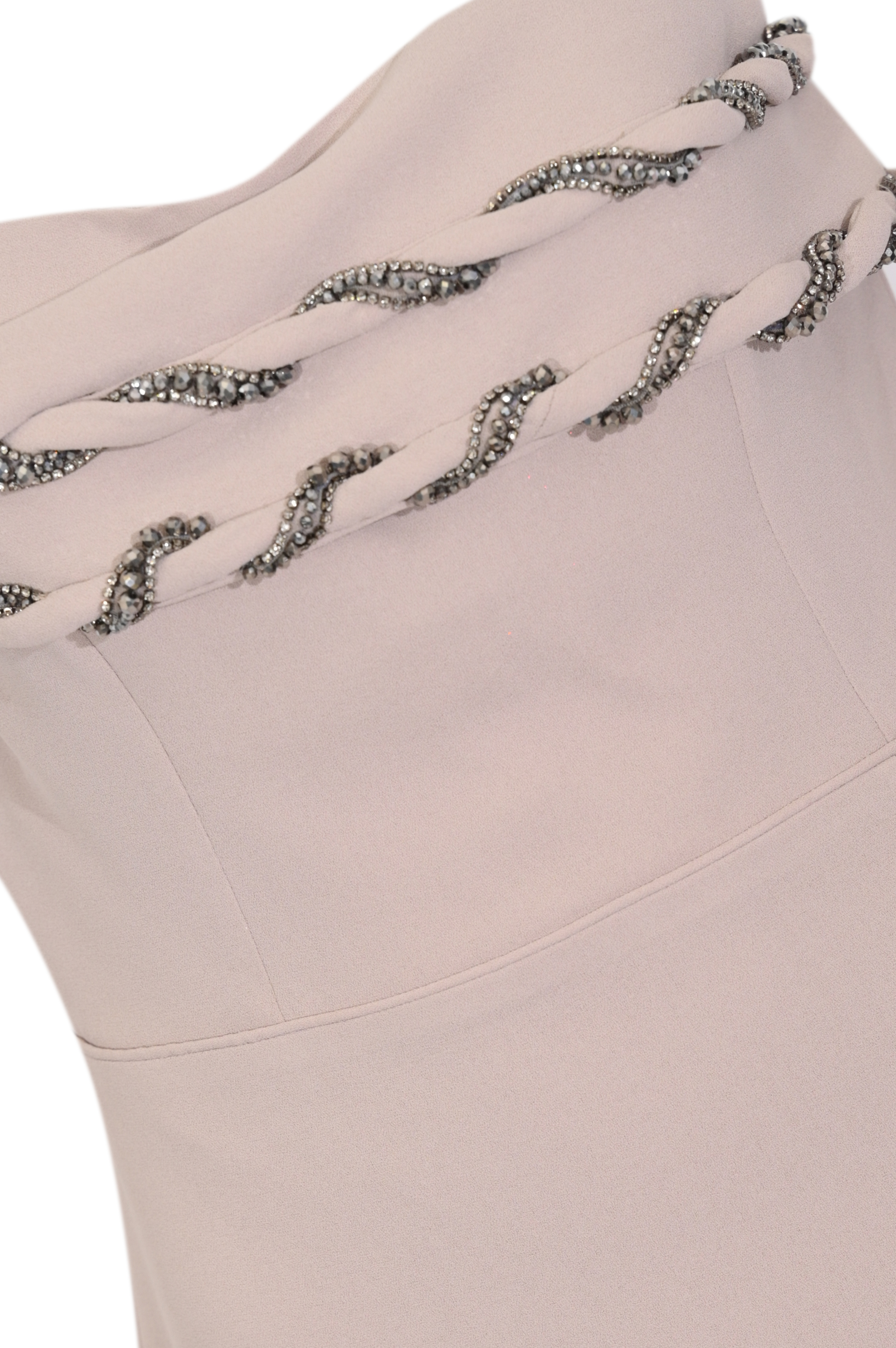 - Dettagli: linea elegante e aderente, scollo con fascia drappeggiata arricchita da applicazioni di strass e intrecci decorativi, spacco frontale sul fondo