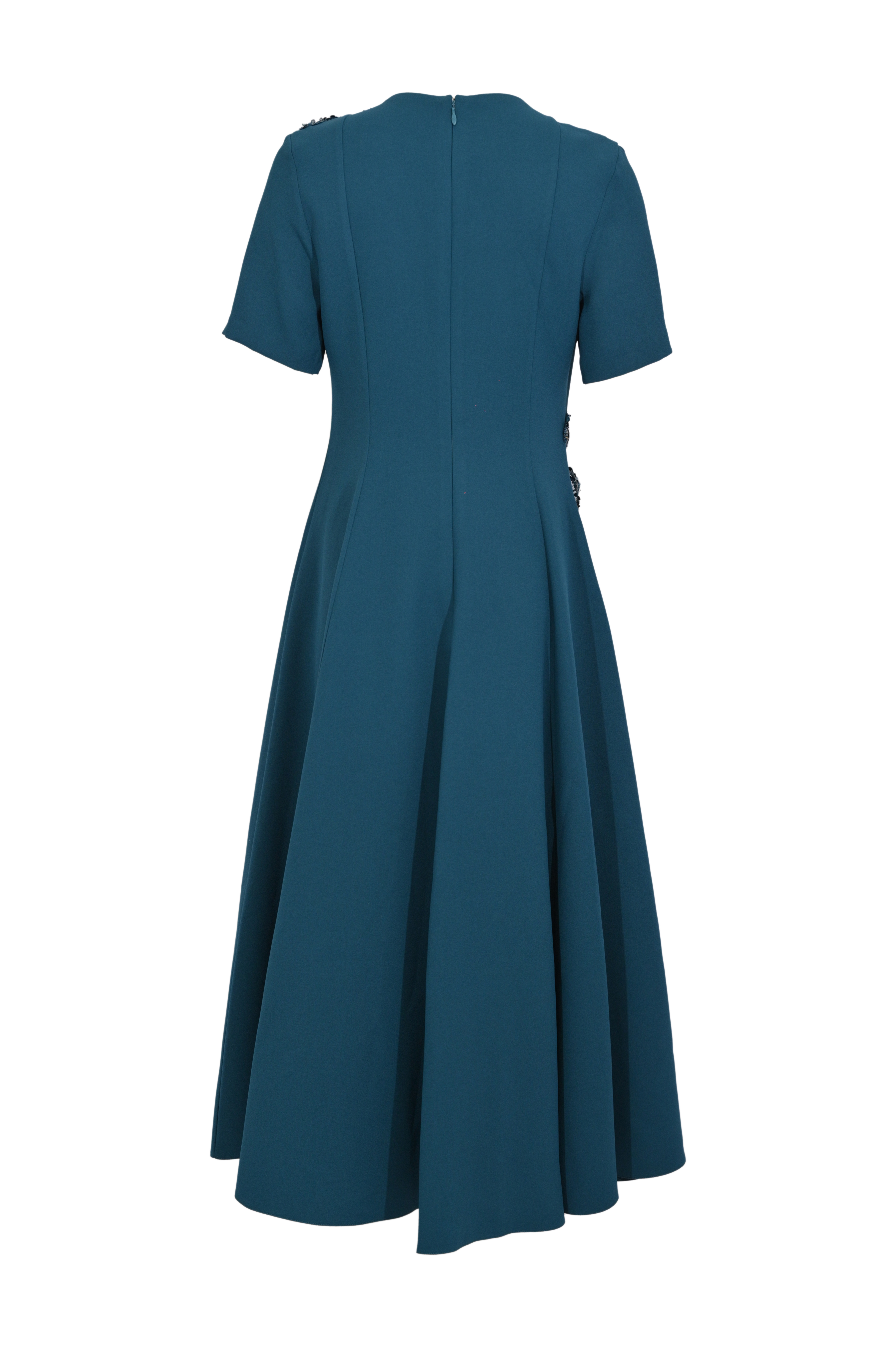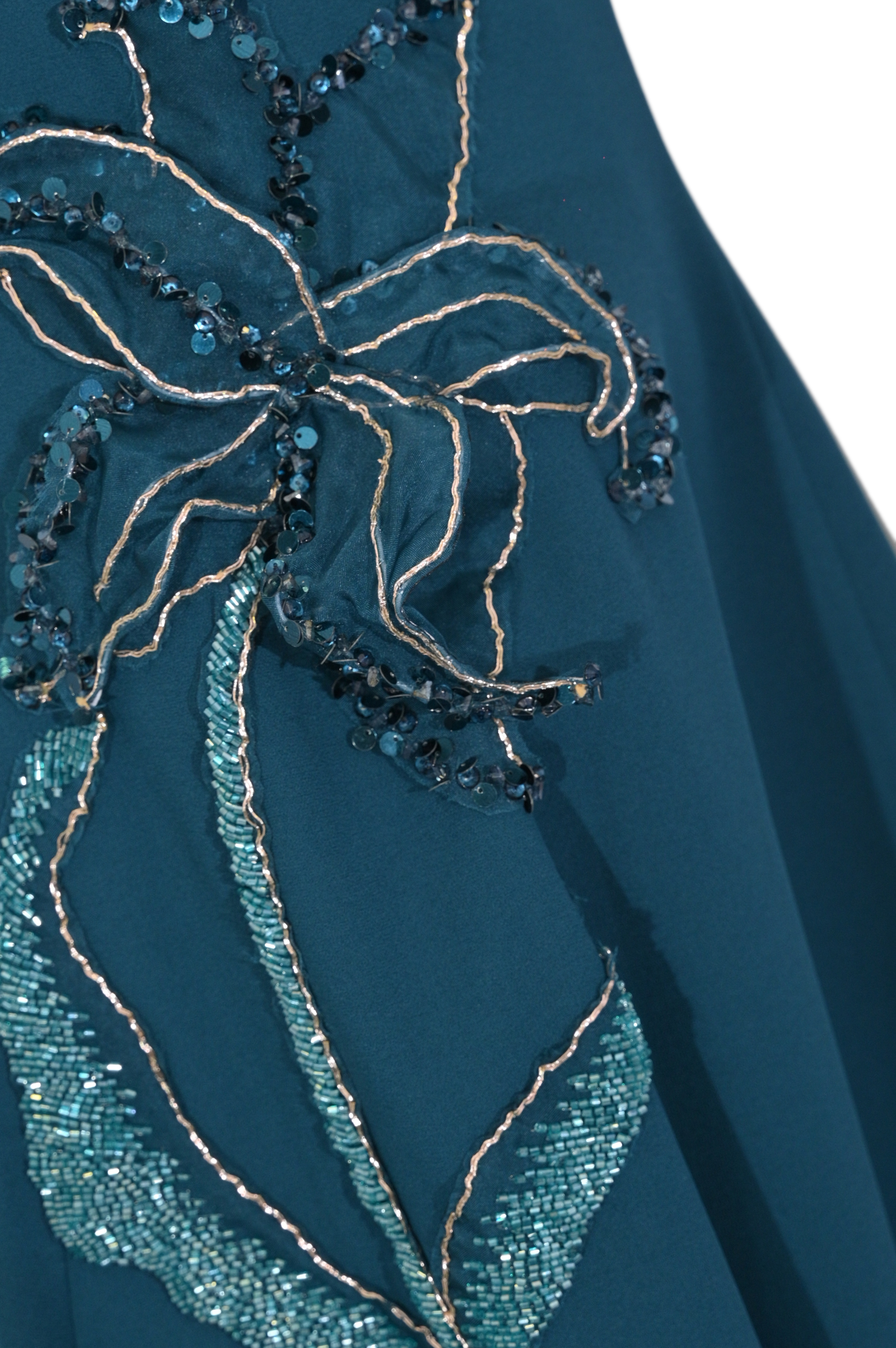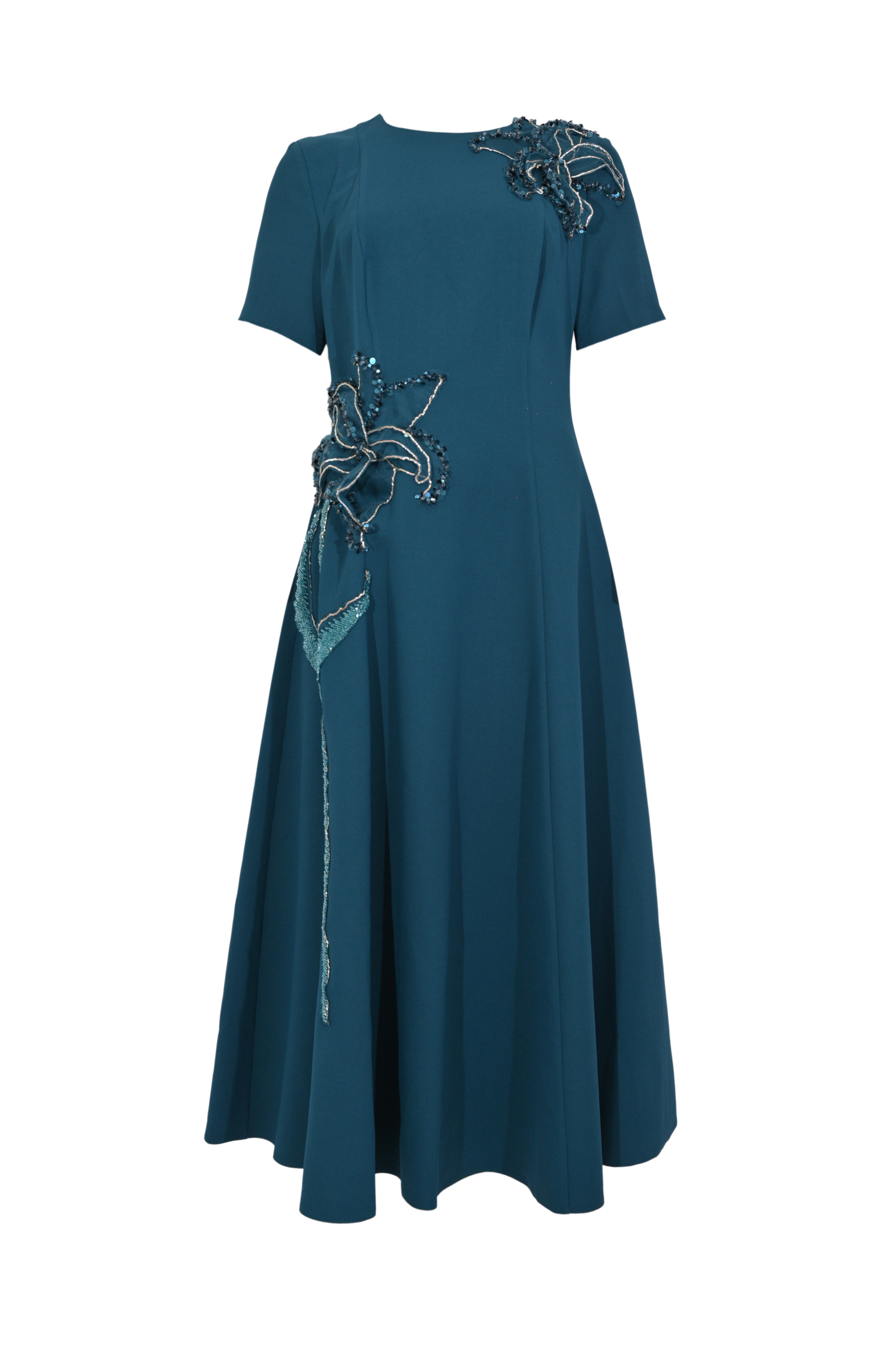 - Dettagli: lunghezza longuette con gonna ampia e strutturata, applicazioni floreali in rilievo su spalla e fianco con ricami, strass e paillettes, lavorazione luminosa tono su tono, design elegante e scenografico