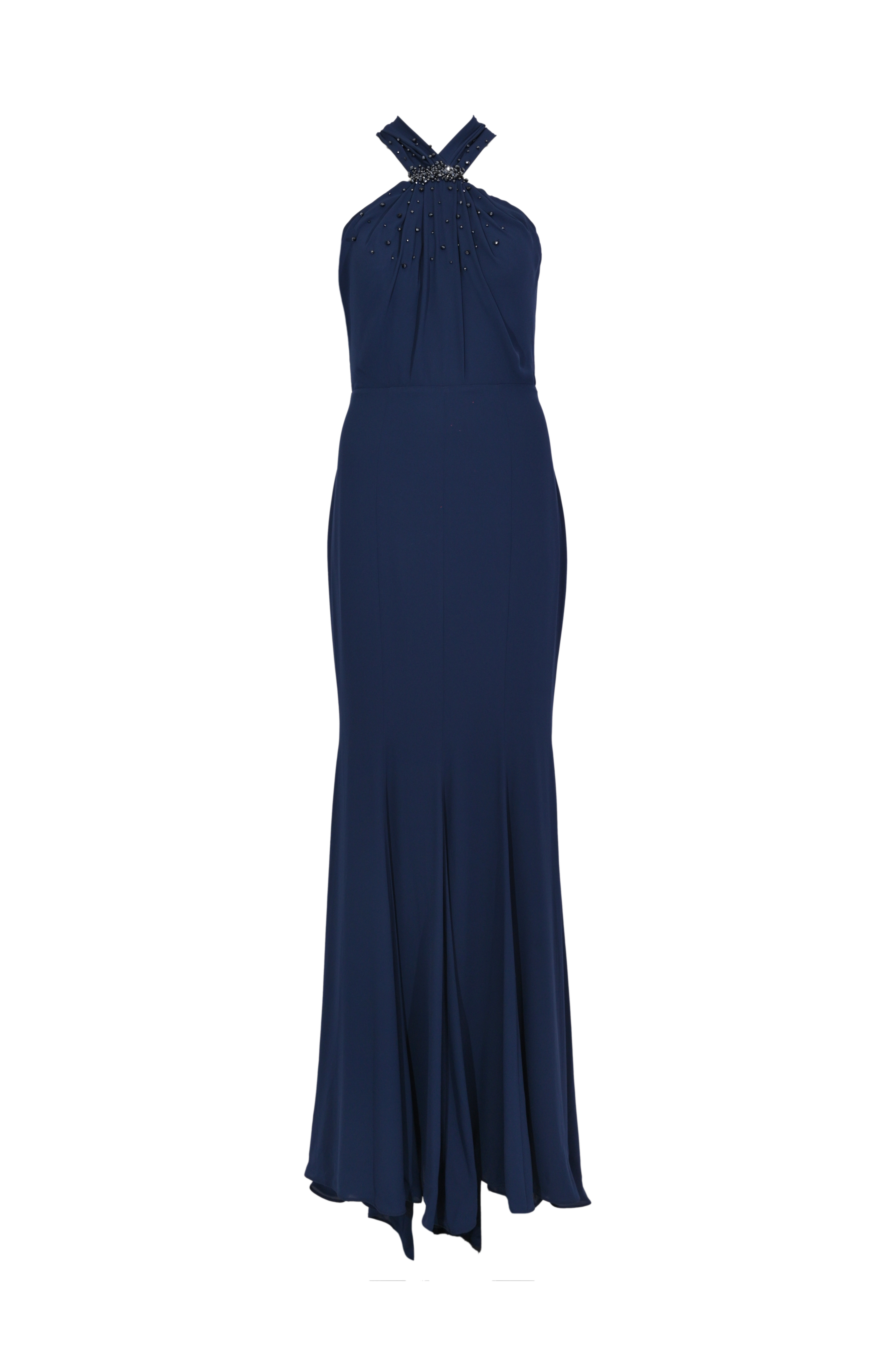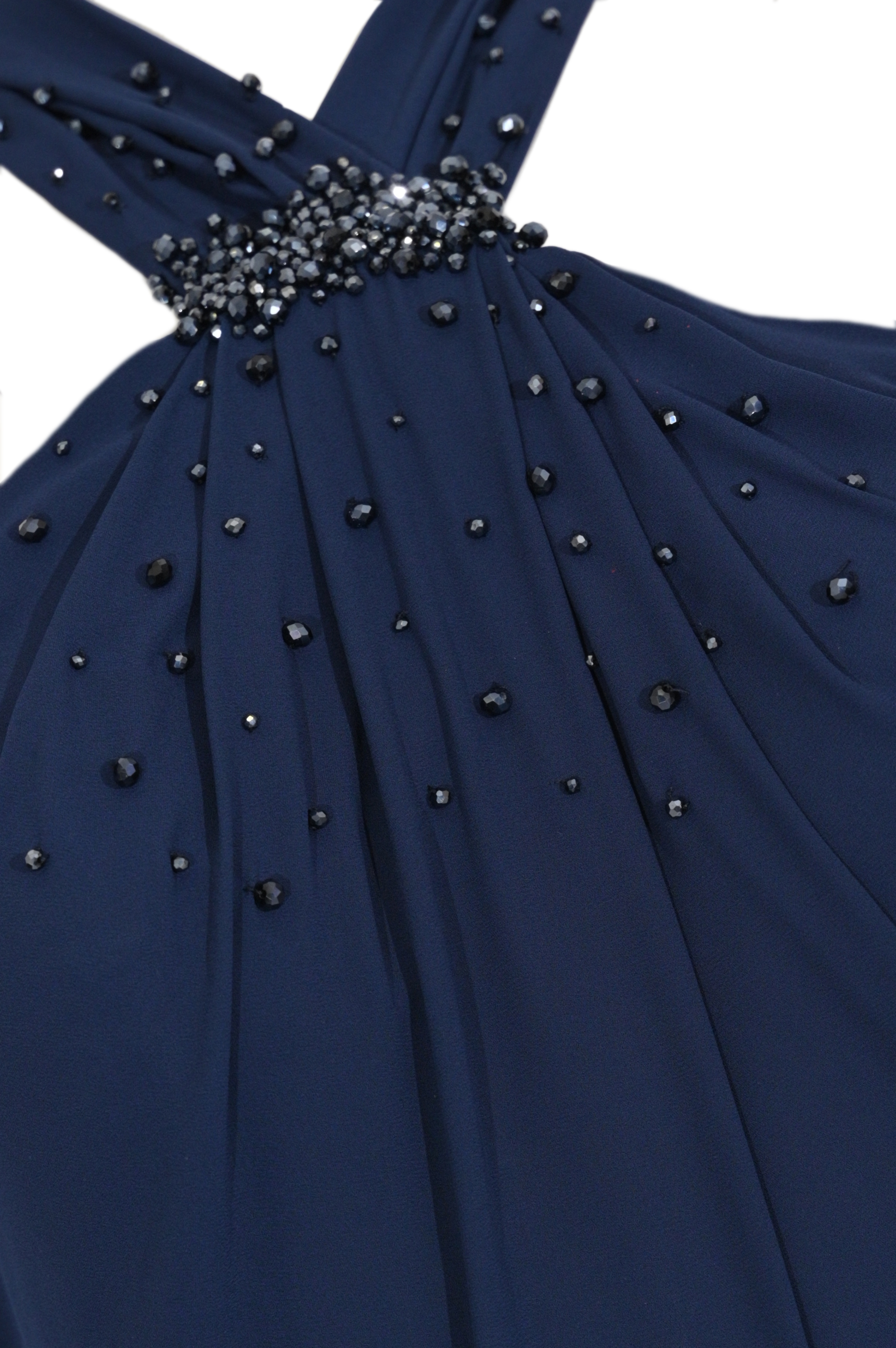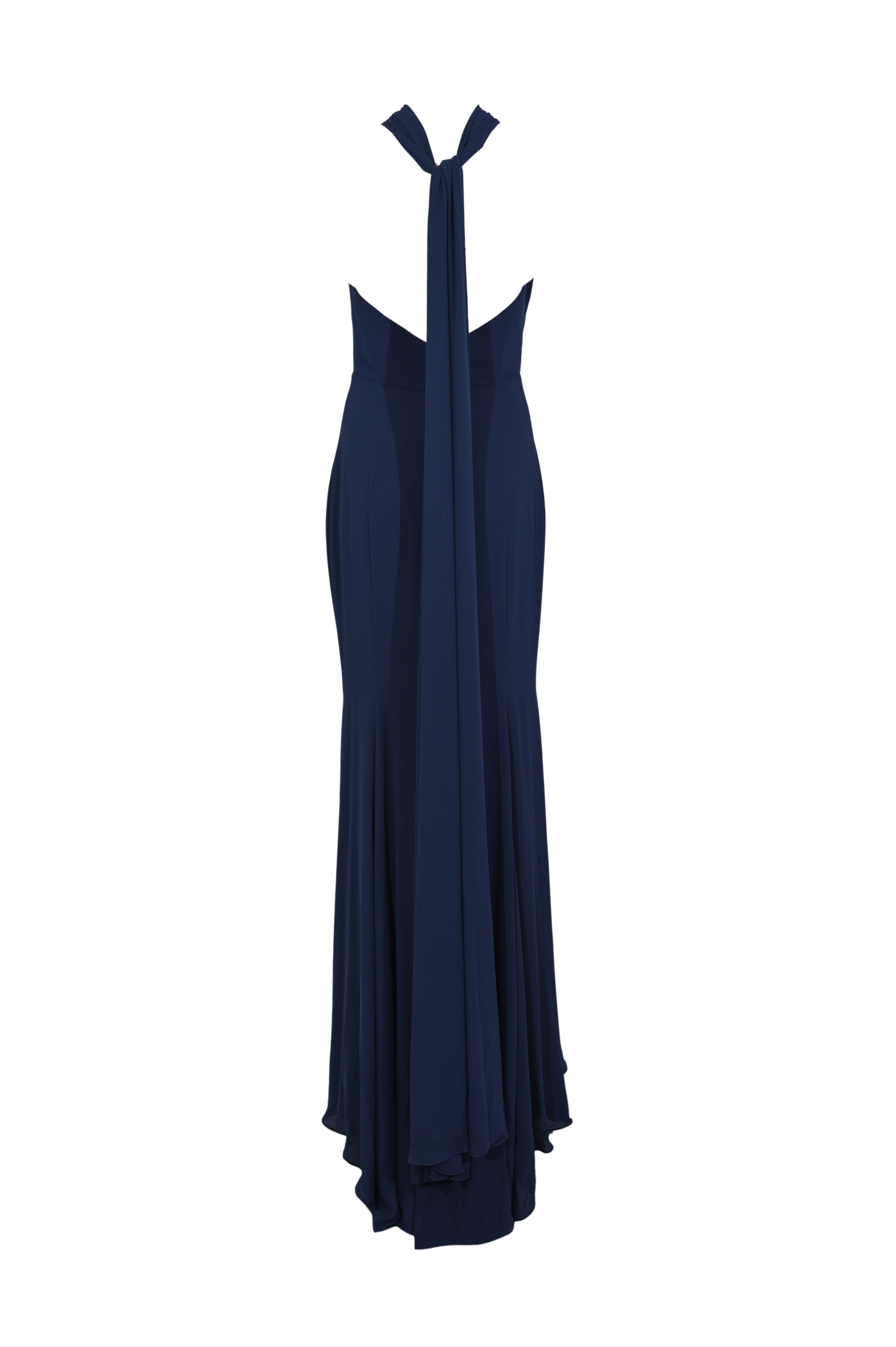 - Dettagli: design elegante e sofisticato, corpetto drappeggiato con applicazione di perline e cristalli tono su tono, scollo posteriore con fascia lunga decorativa, gonna lunga con linea aderente sui fianchi e fondo leggermente svasato