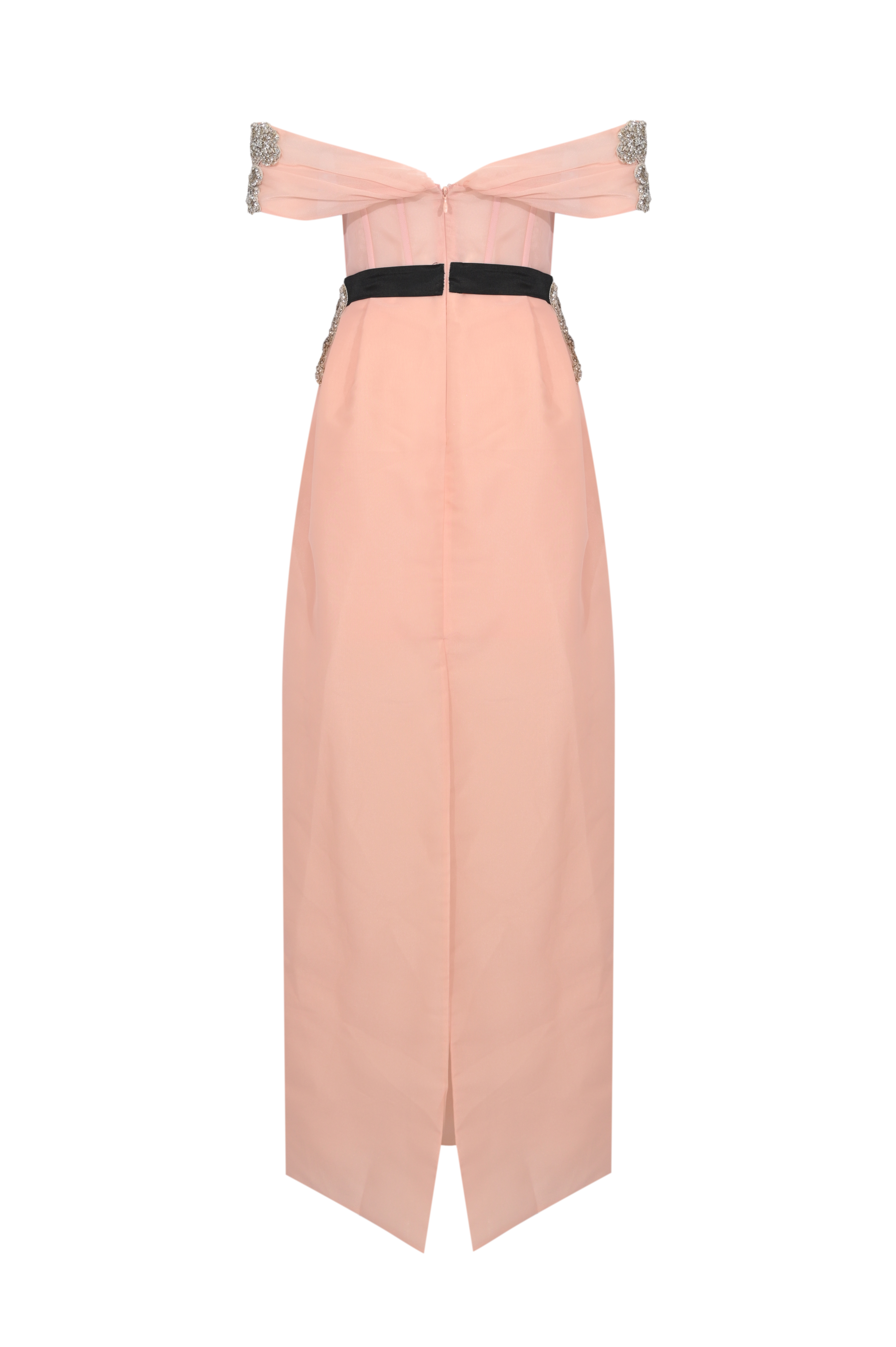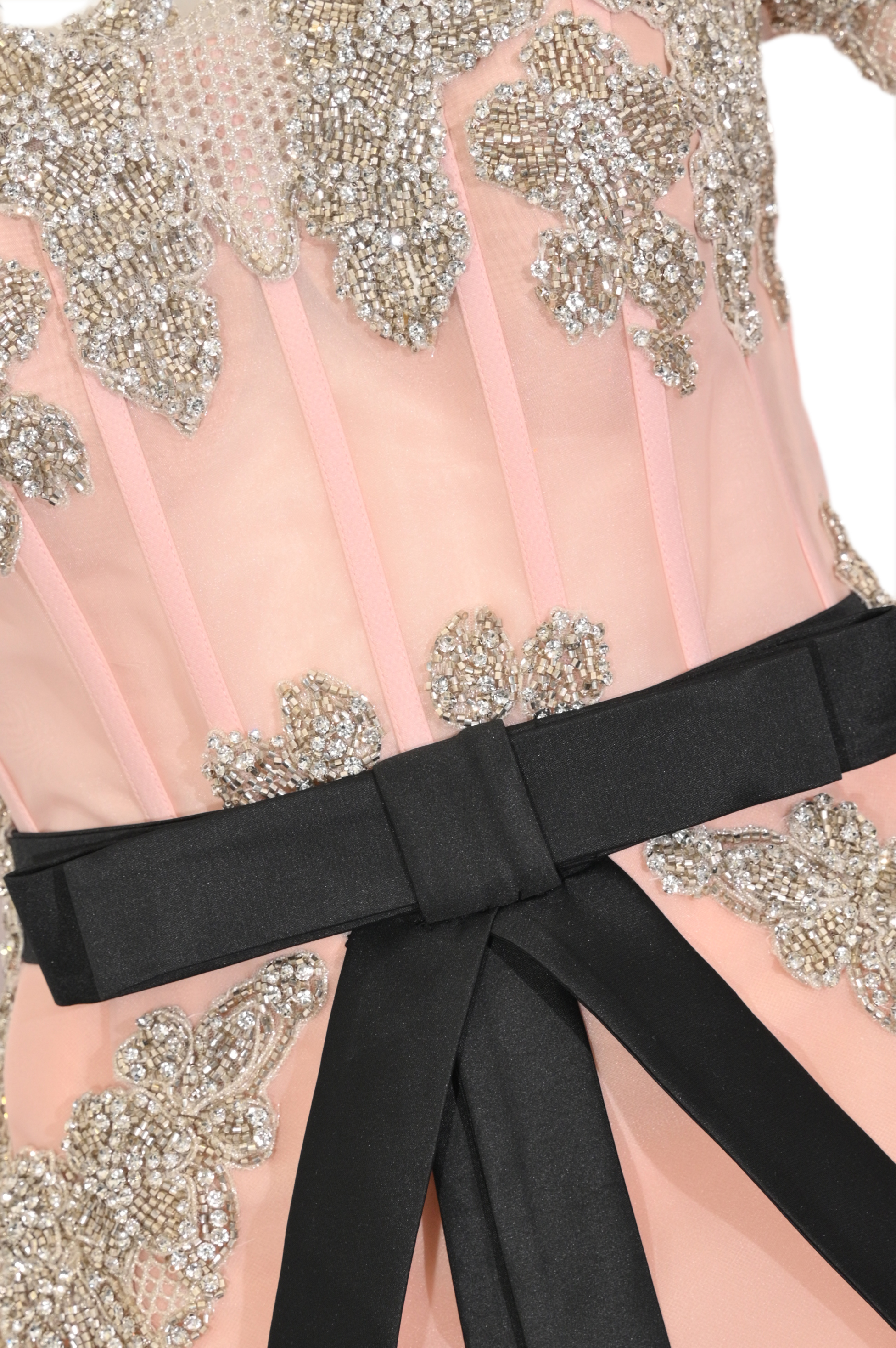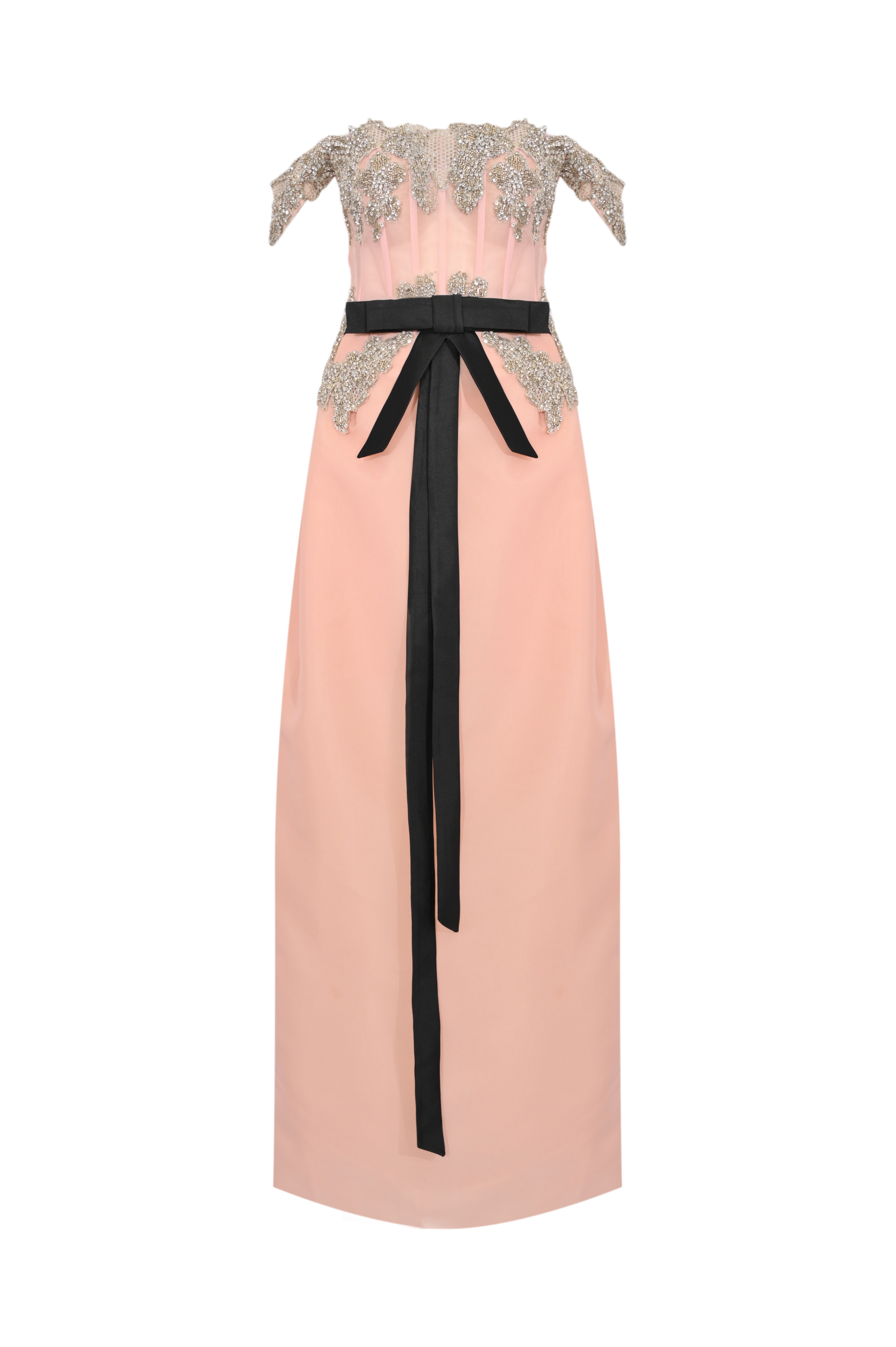- Dettagli: abito lungo con corpetto strutturato effetto bustier, inserti in organza trasparente con stecche a vista, ricami floreali in strass e cristalli, cintura in vita con nastro nero a fiocco, gonna lunga dalla linea pulita con spacco posteriore, design elegante e sofisticato