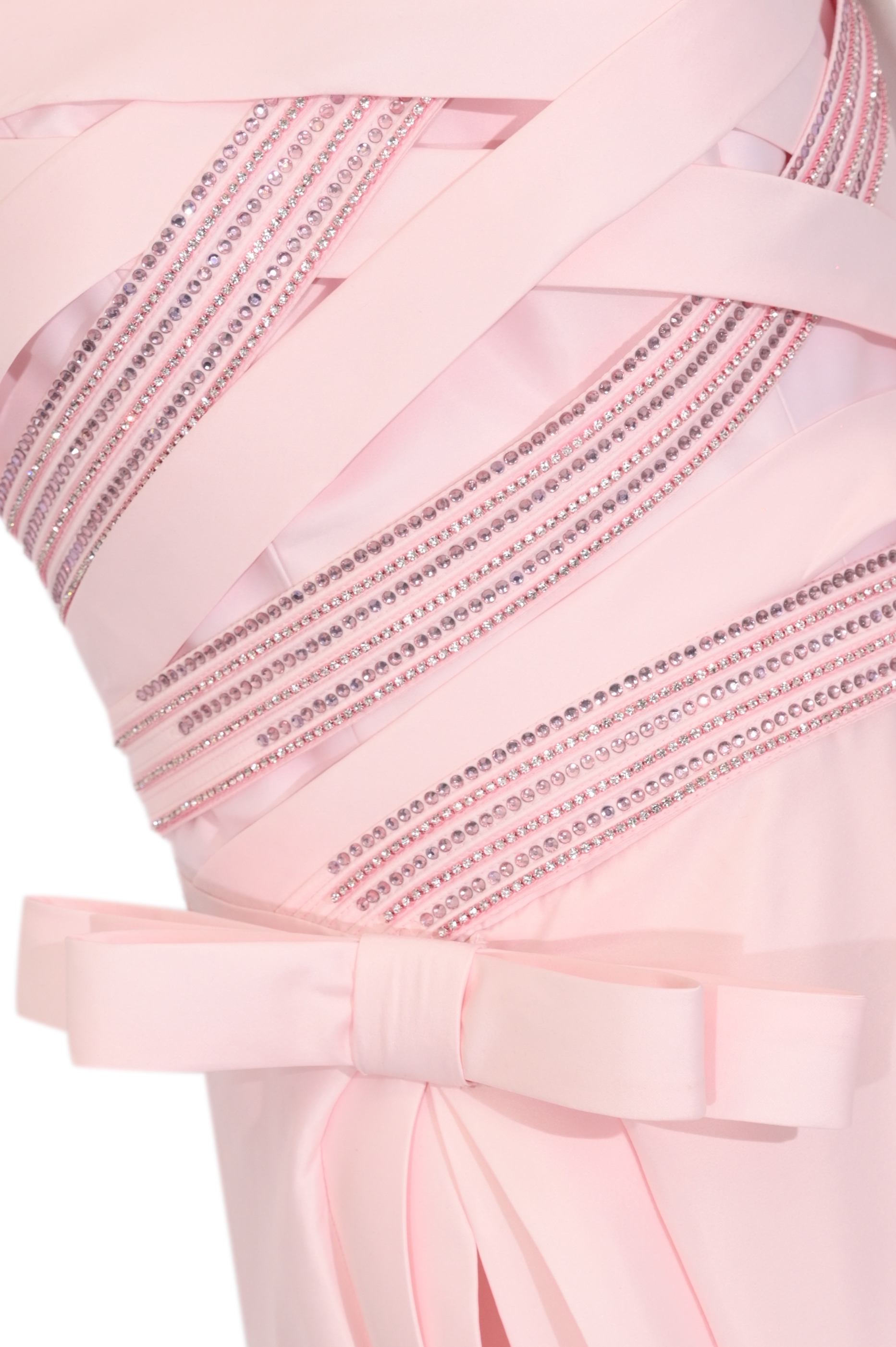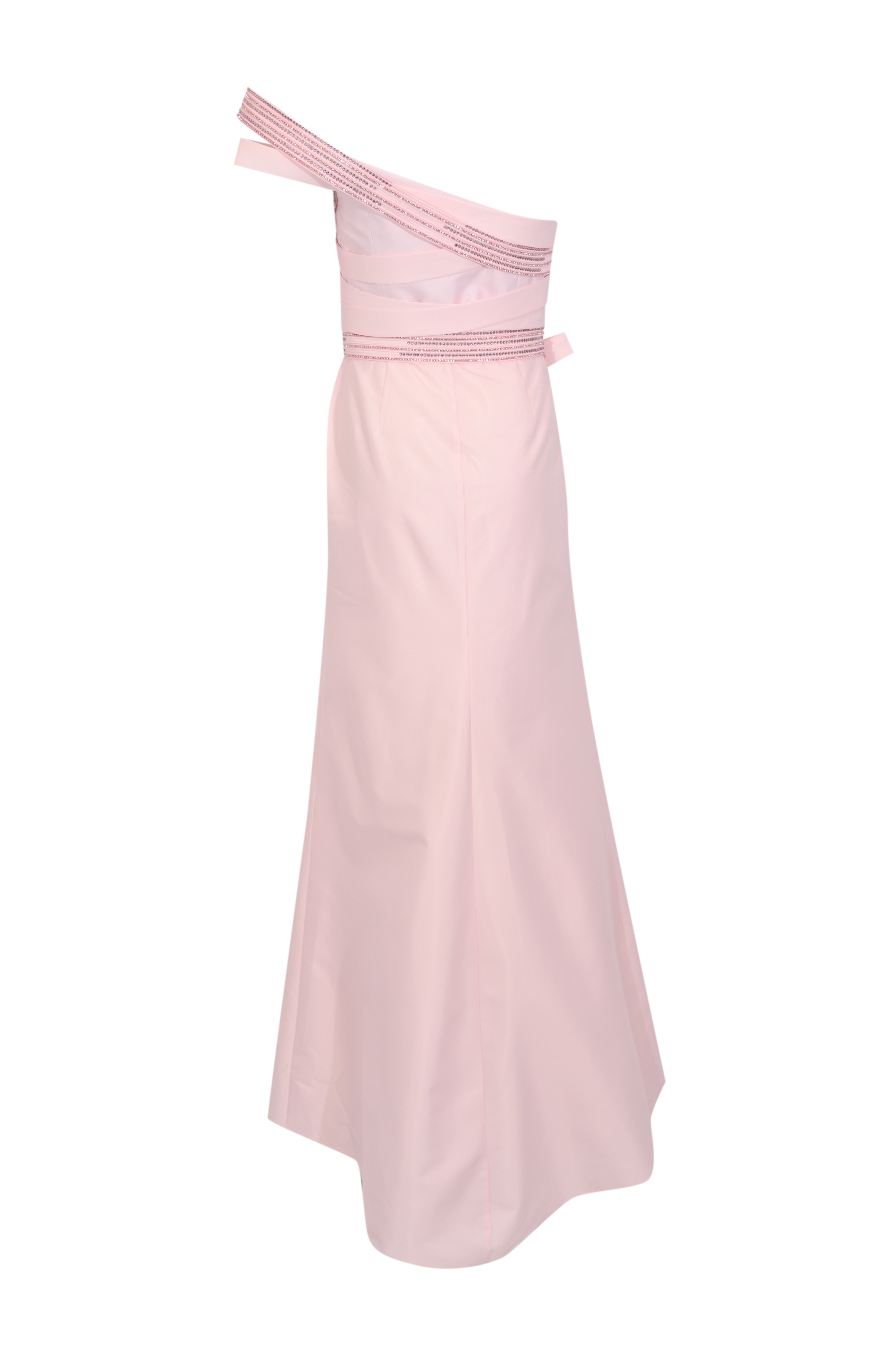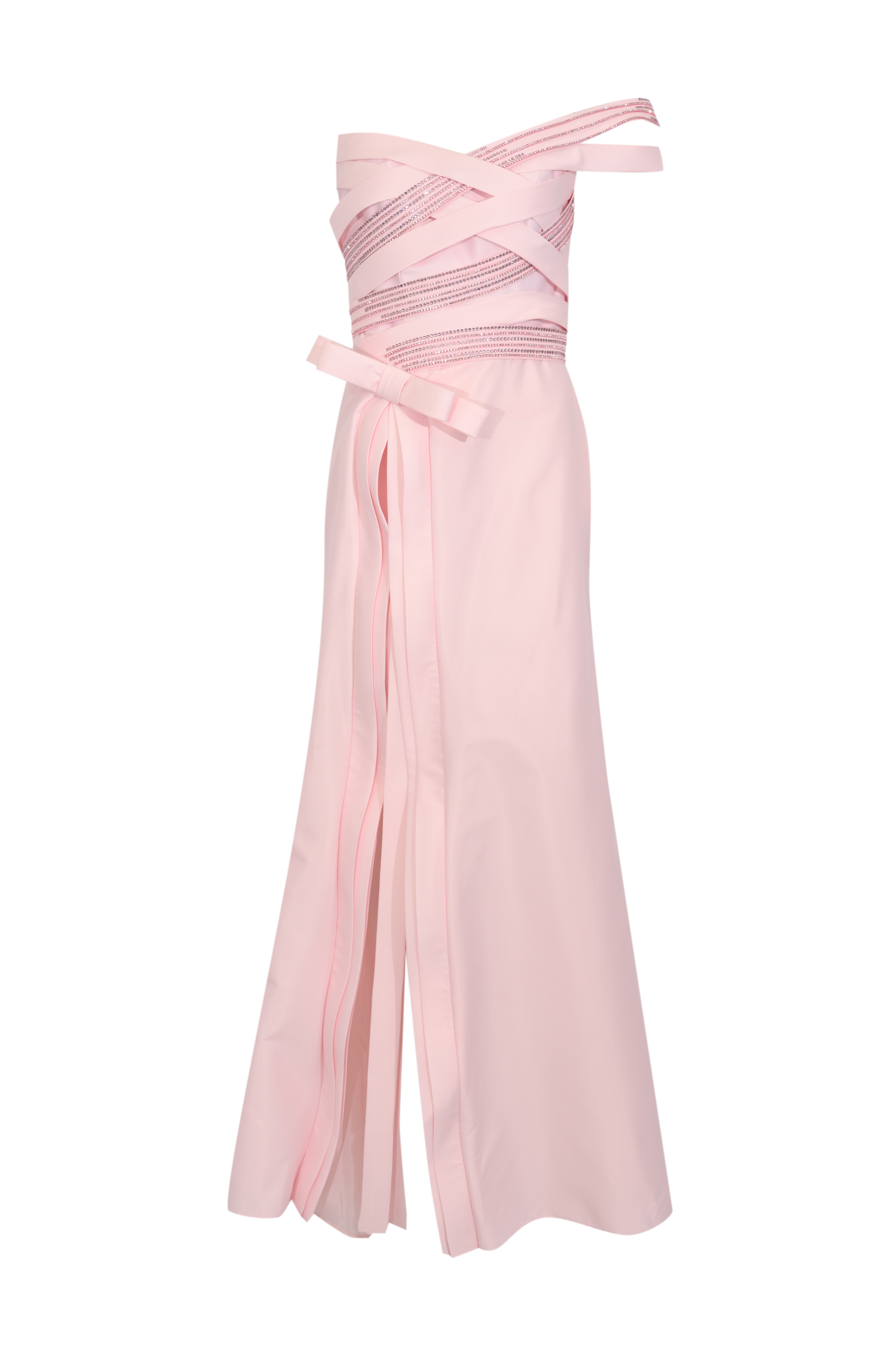 - Dettagli: abito lungo dal design elegante con corpino strutturato, fasce incrociate decorate con strass, cintura con fiocco in vita, gonna lunga con linea leggermente svasata e pieghe frontali, lavorazione luminosa con applicazioni di strass lungo il busto