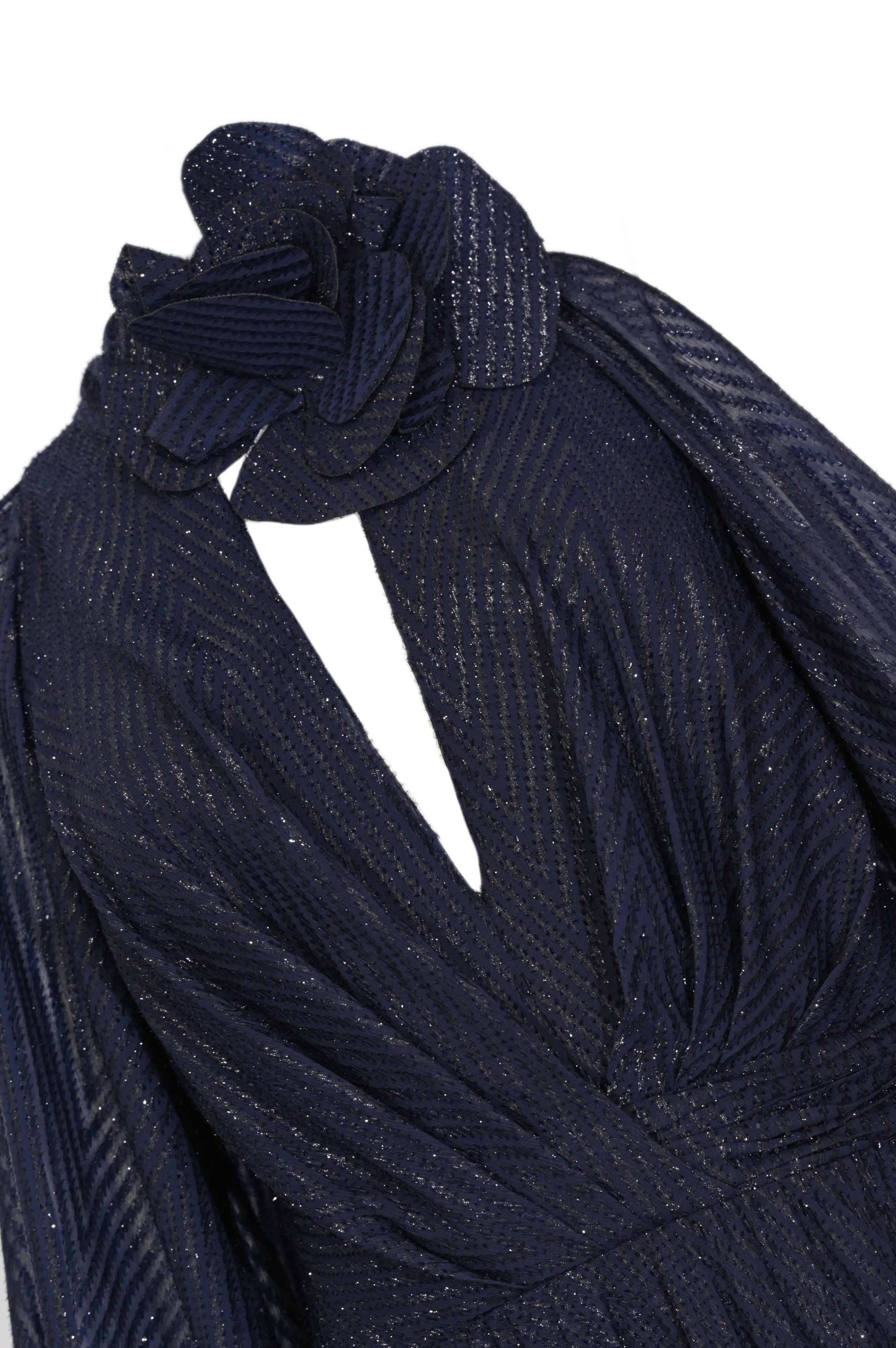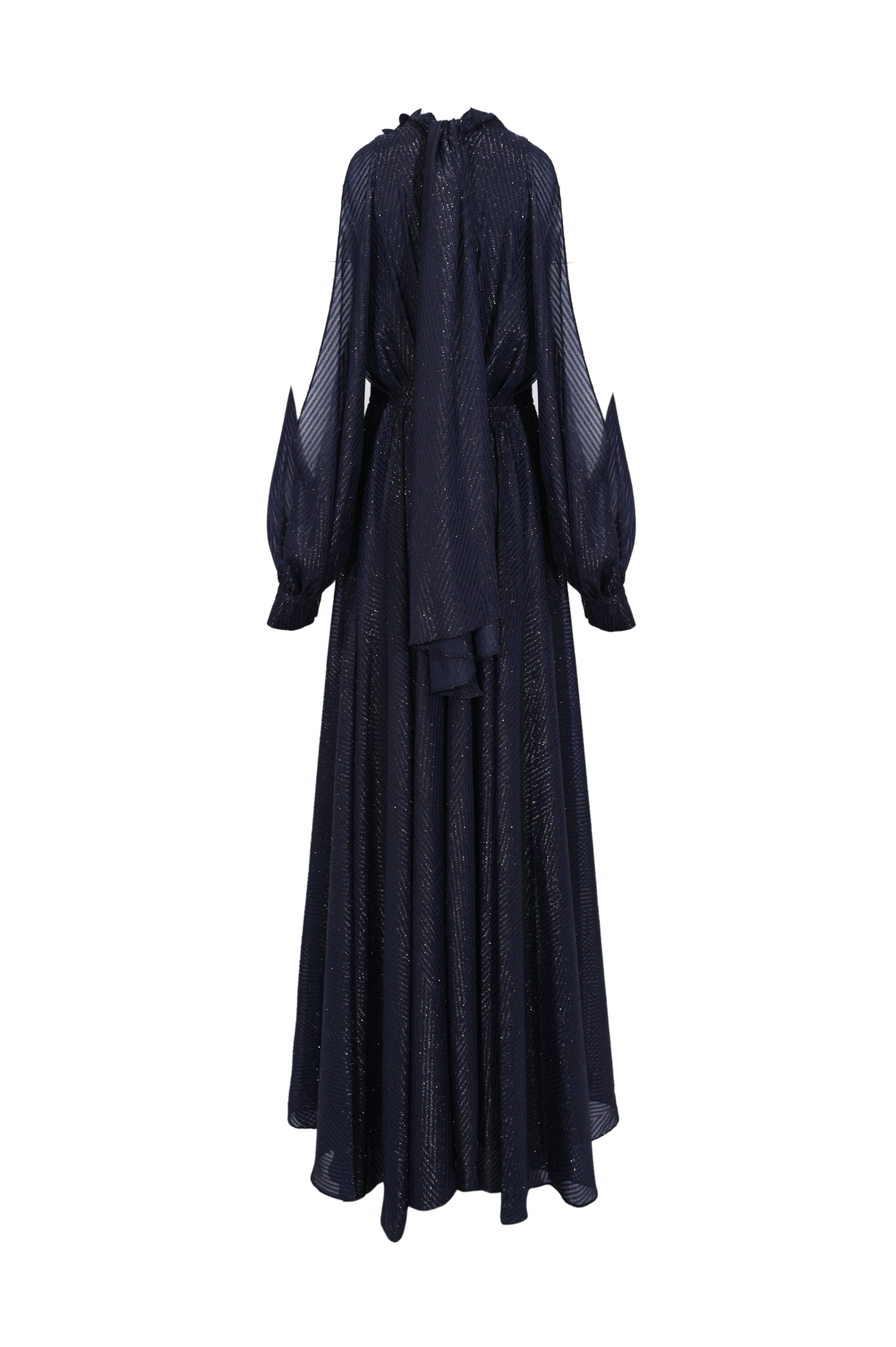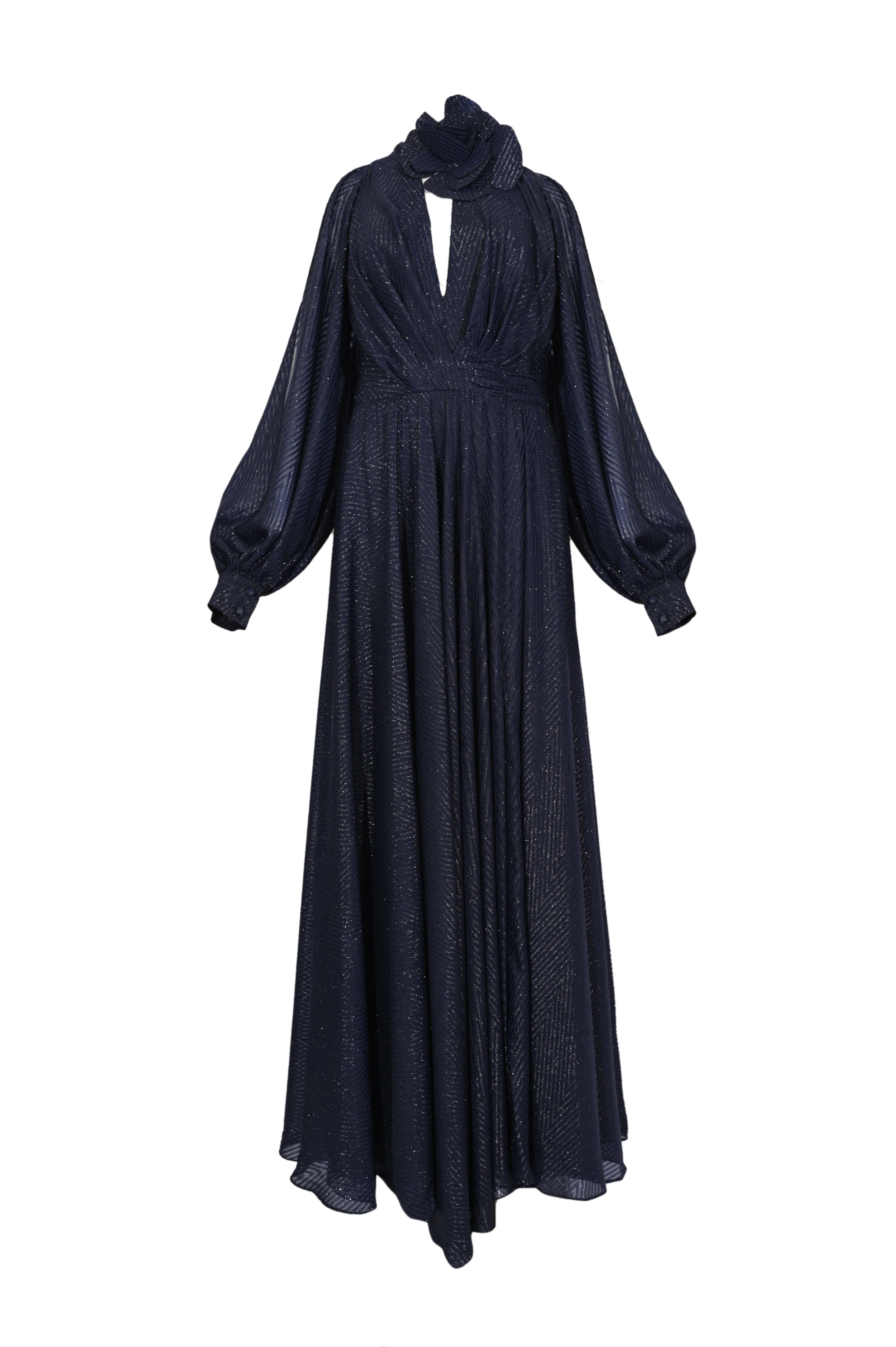 - Dettagli: abito lungo con linea fluida ed elegante, tessuto leggermente brillante con trama effetto laminato, scollo a V con apertura frontale, collo alto annodato, maniche voluminose, vita segnata e gonna ampia, effetto morbido e raffinato