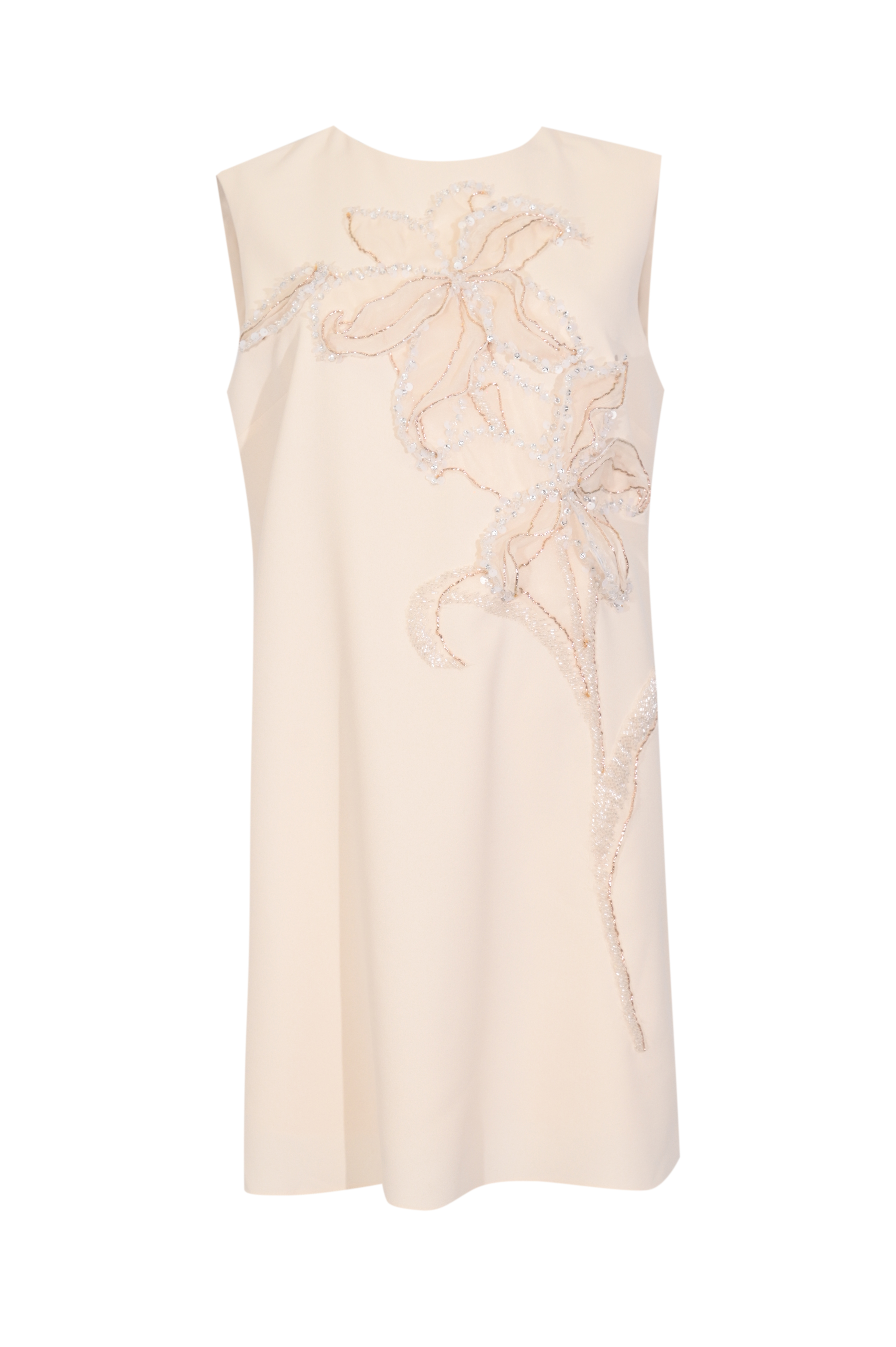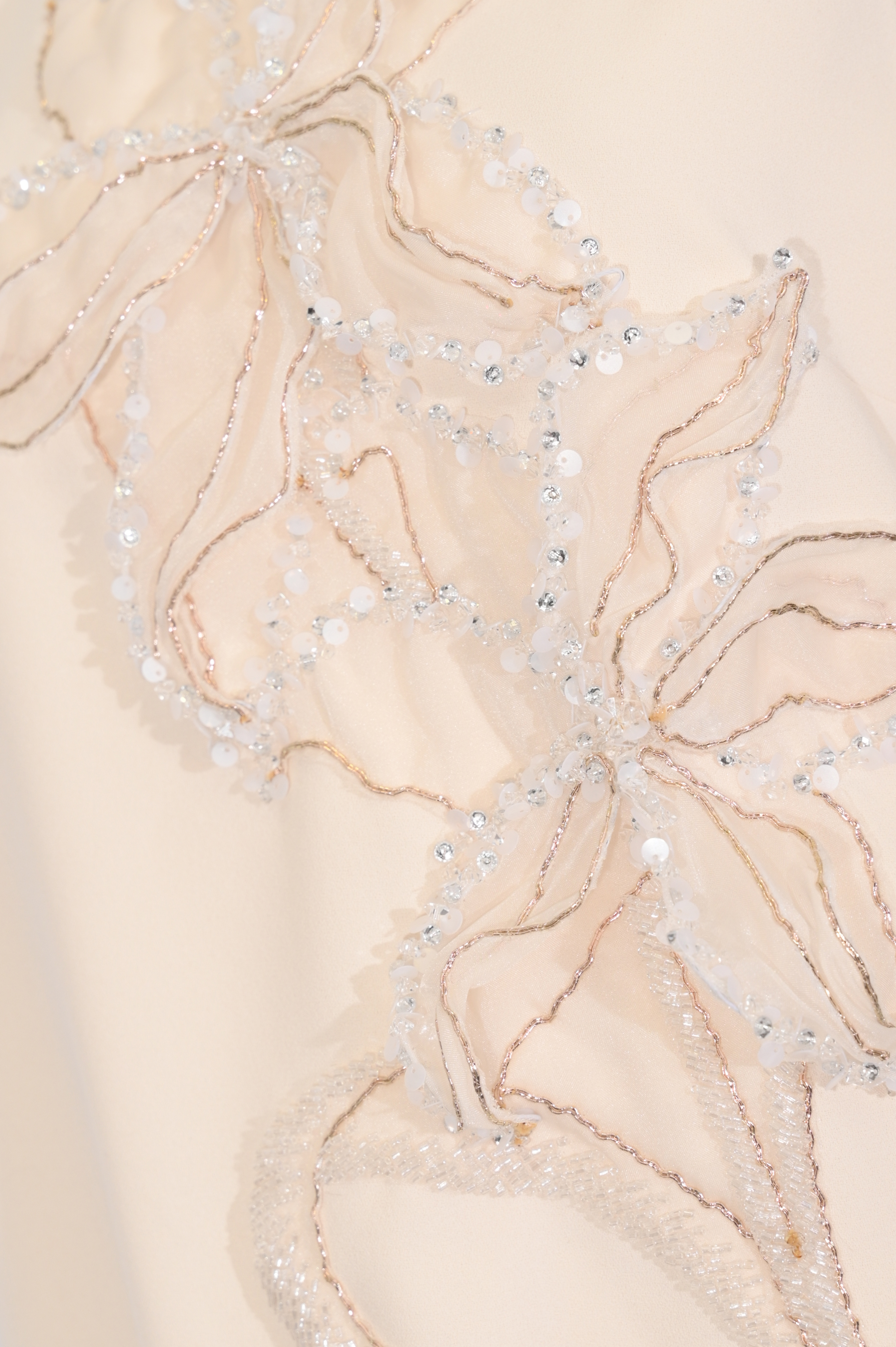 - Dettagli: lunghezza midi con linea morbida, applicazioni floreali in rilievo su busto e fianco con ricami, strass e paillettes, lavorazione luminosa e delicata, design elegante e raffinato