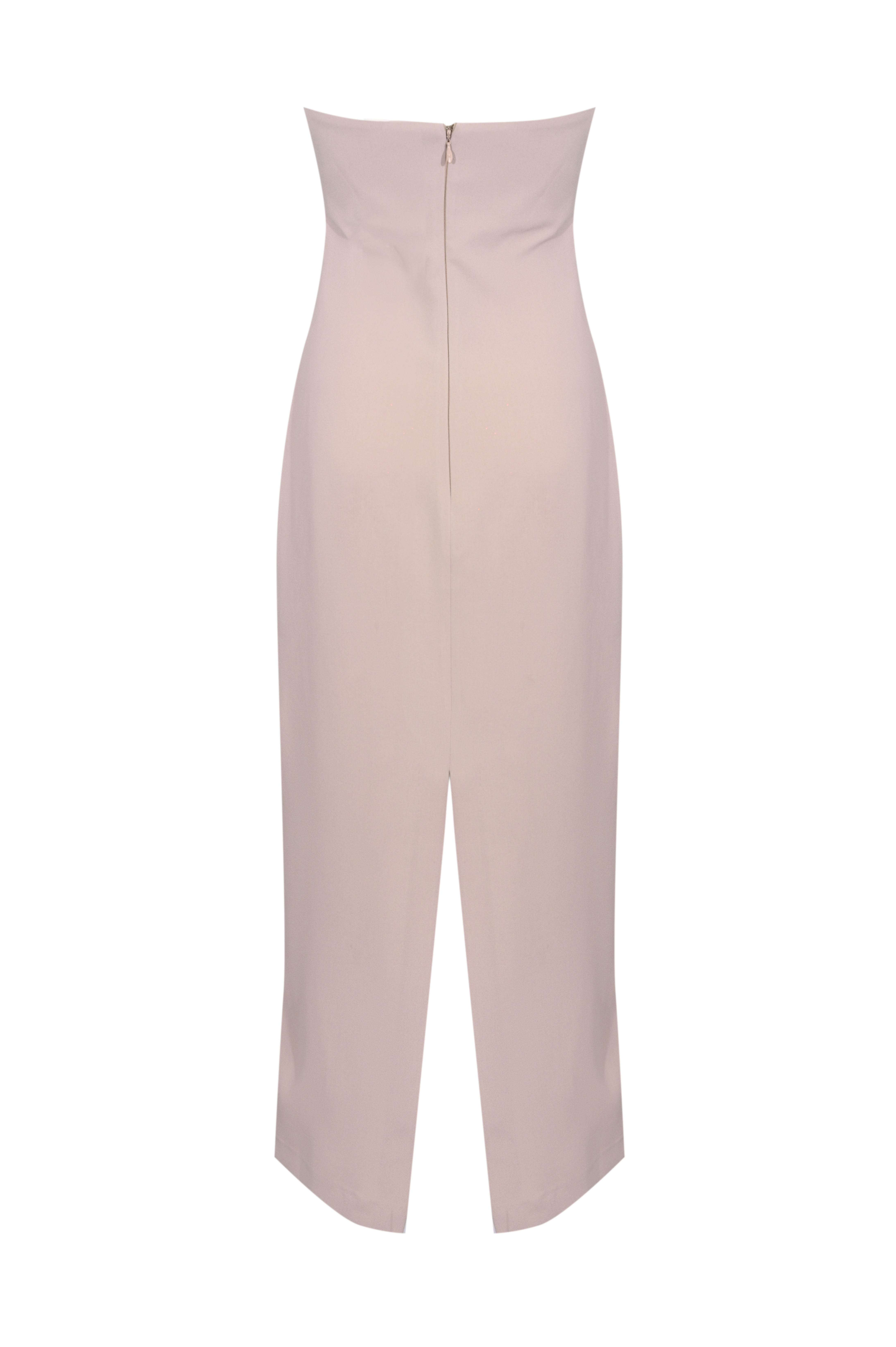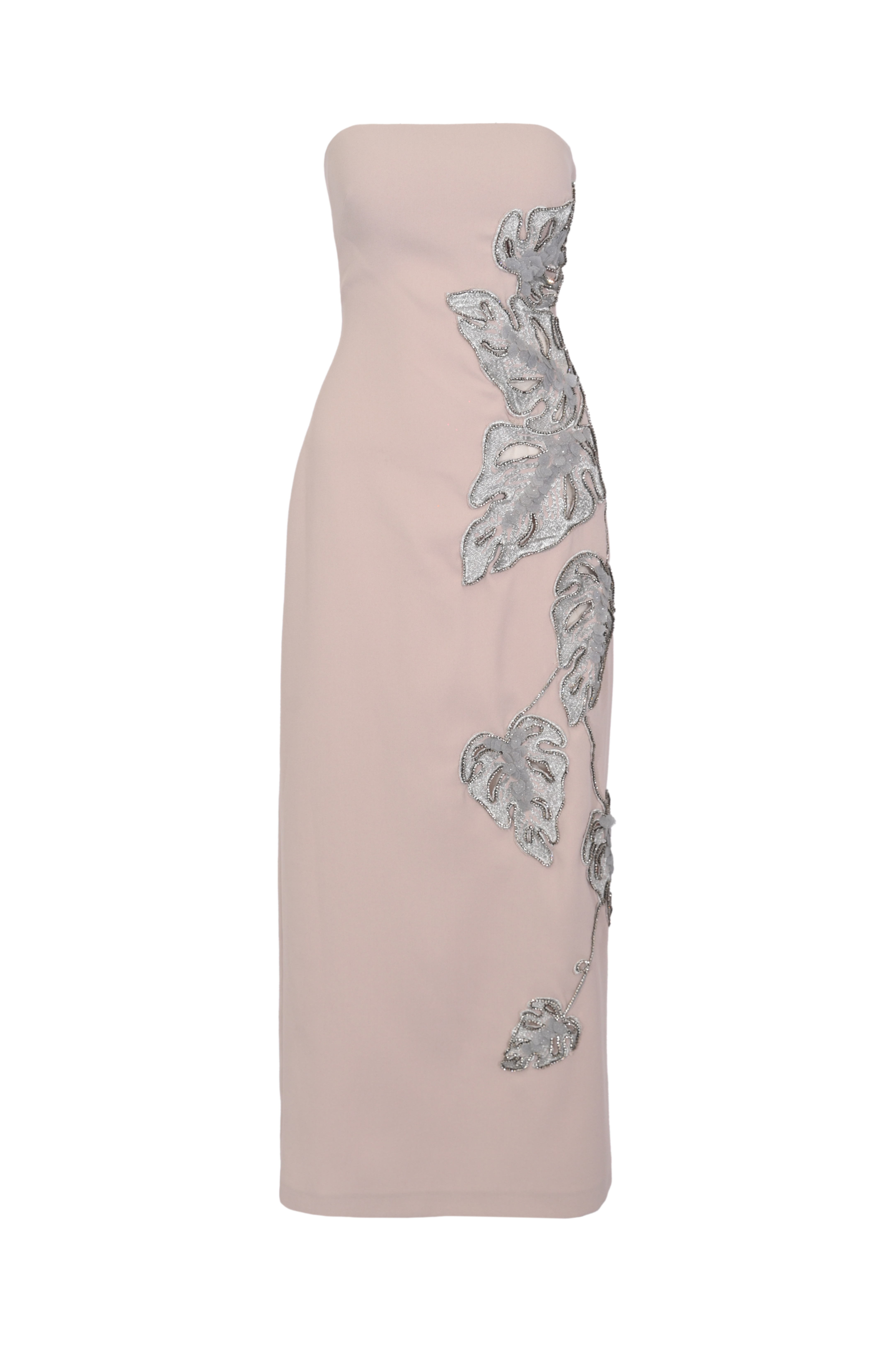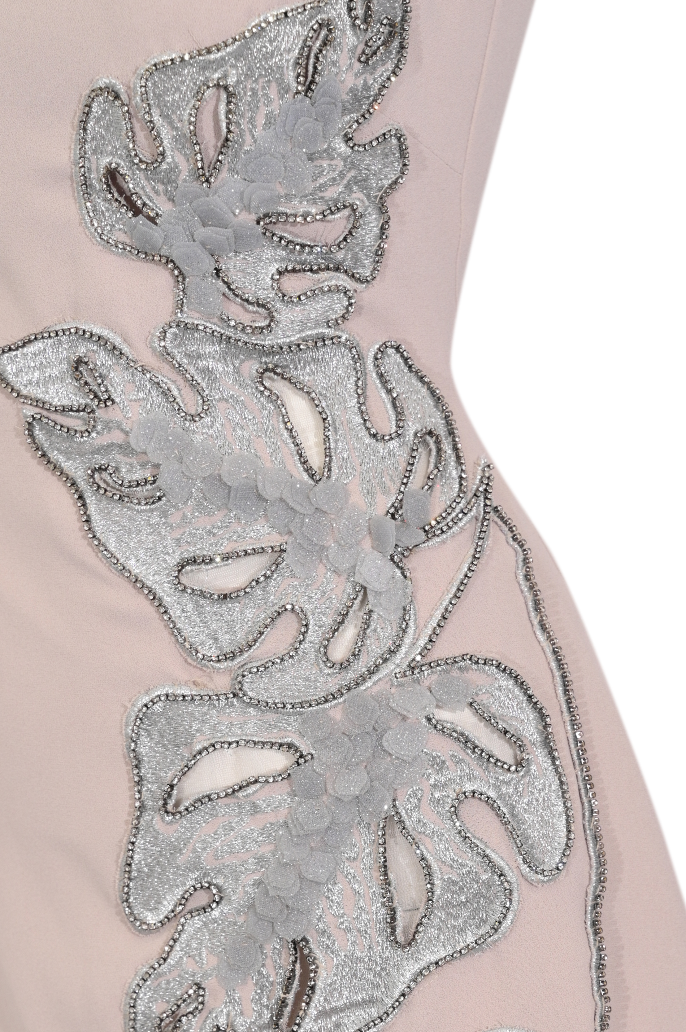 - Dettagli: silhouette aderente con lunghezza midi, spacco frontale, applicazioni laterali con motivo floreale in rilievo arricchite da strass e ricami, lavorazione elegante e strutturata