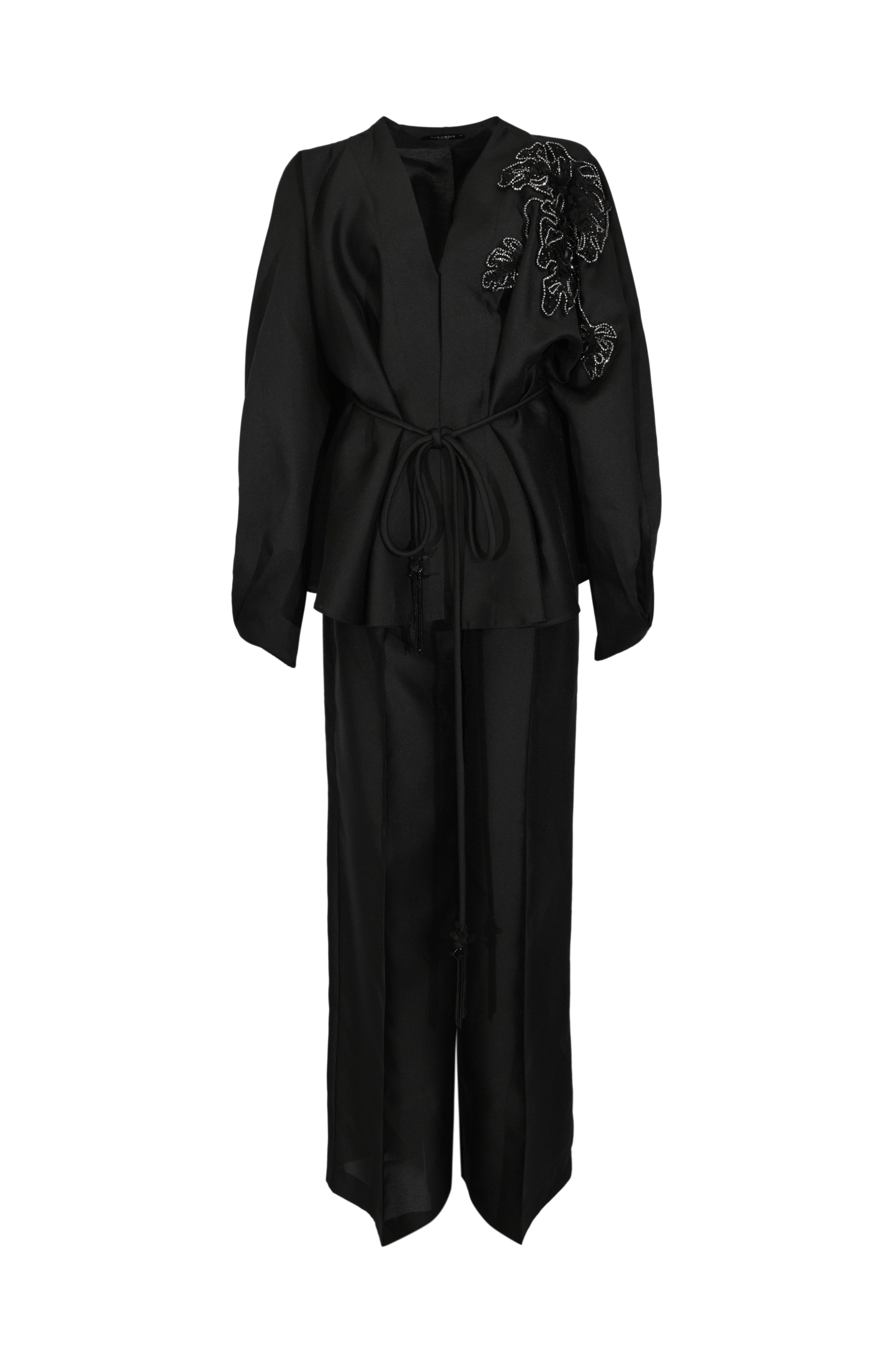 - Dettagli: applicazioni floreali con strass e perline sulla spalla, giacca con cintura e nappine decorative, pantalone a gamba larga