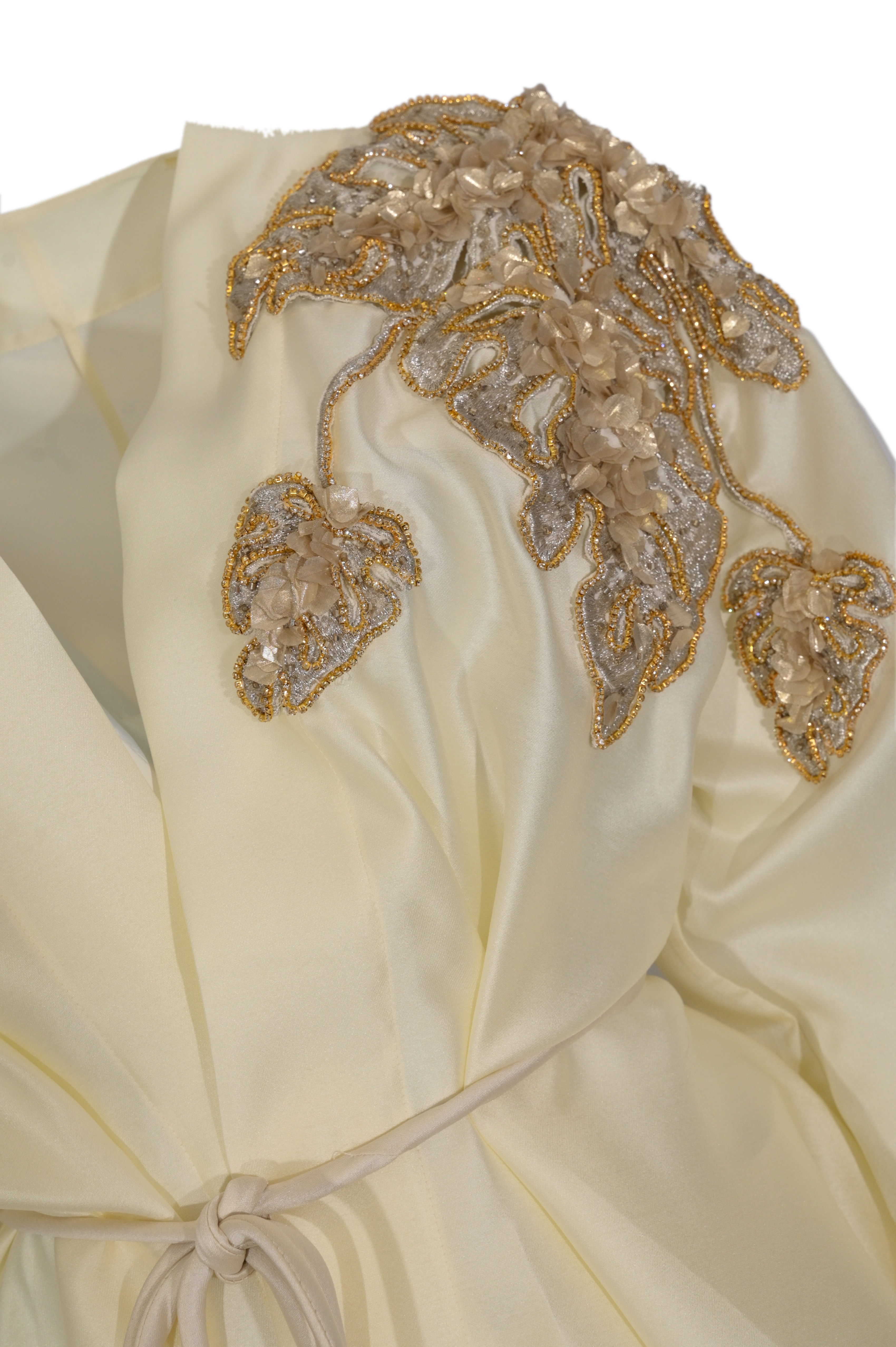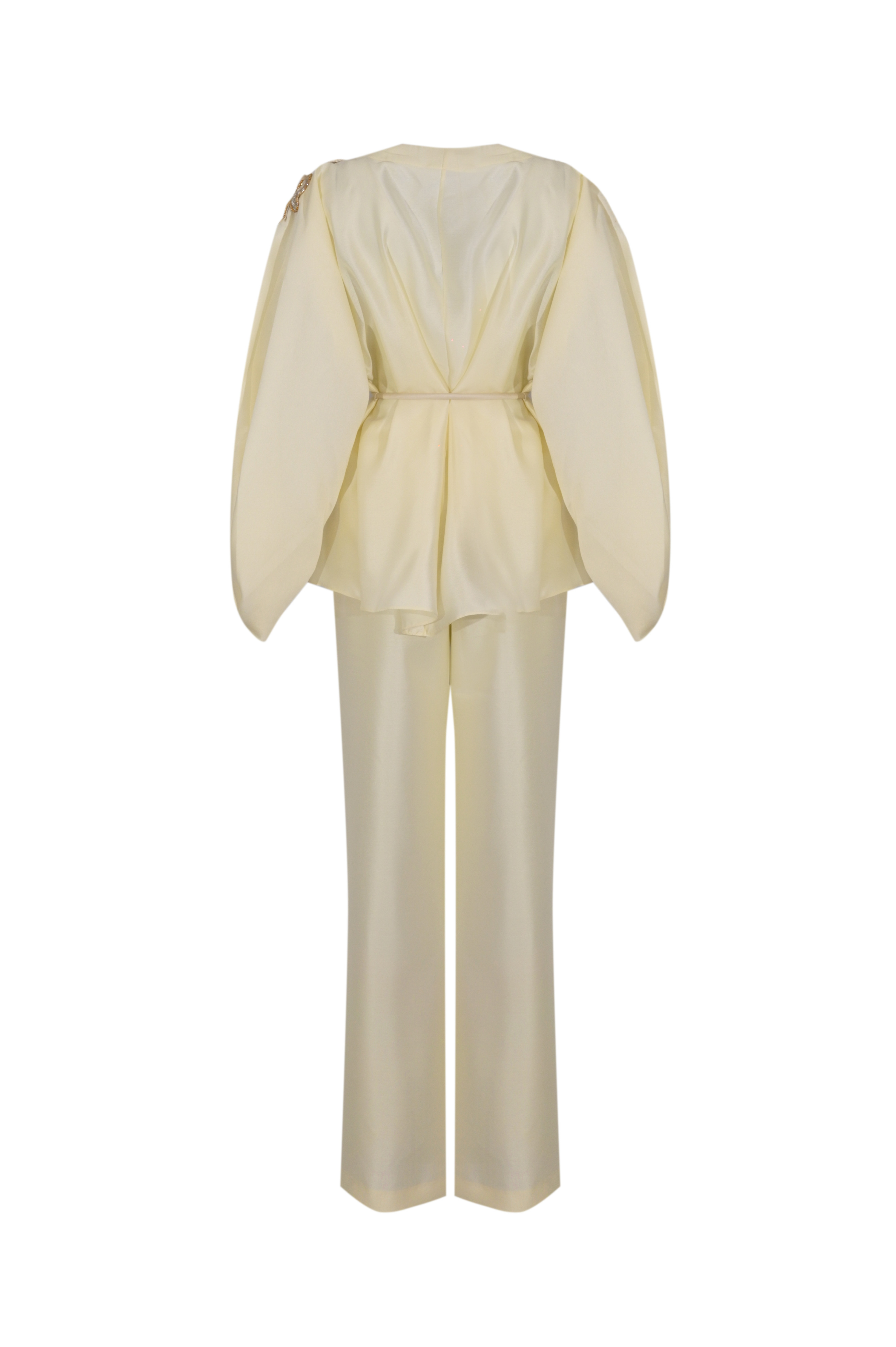 - Dettagli: applicazioni floreali con strass e perline sulla spalla, giacca con cintura e nappine decorative, pantalone a gamba larga