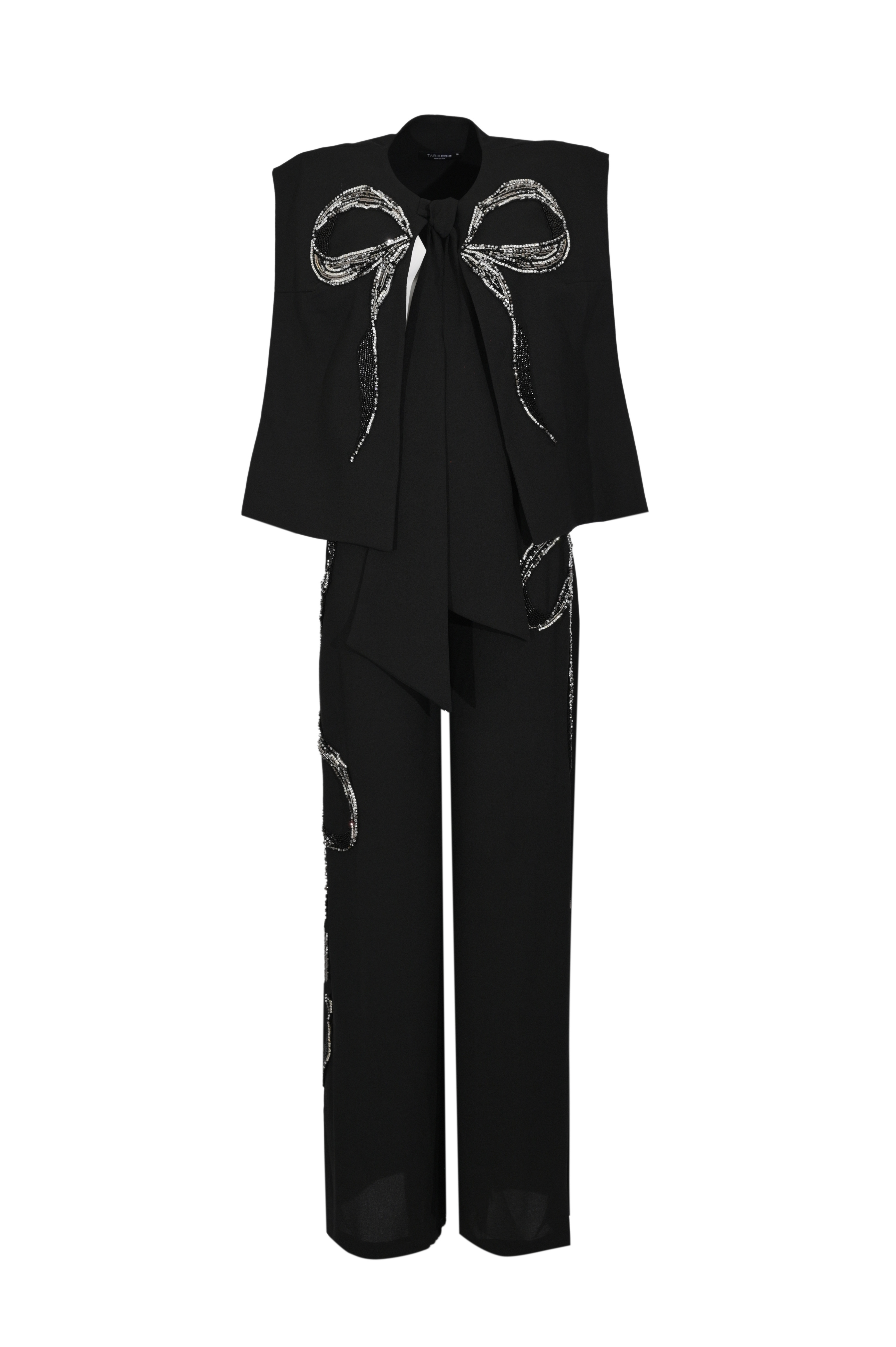 - Dettagli: applicazione fiocco in strass sul davanti, ricami in strass su top e pantalone, pantalone a gamba dritta
