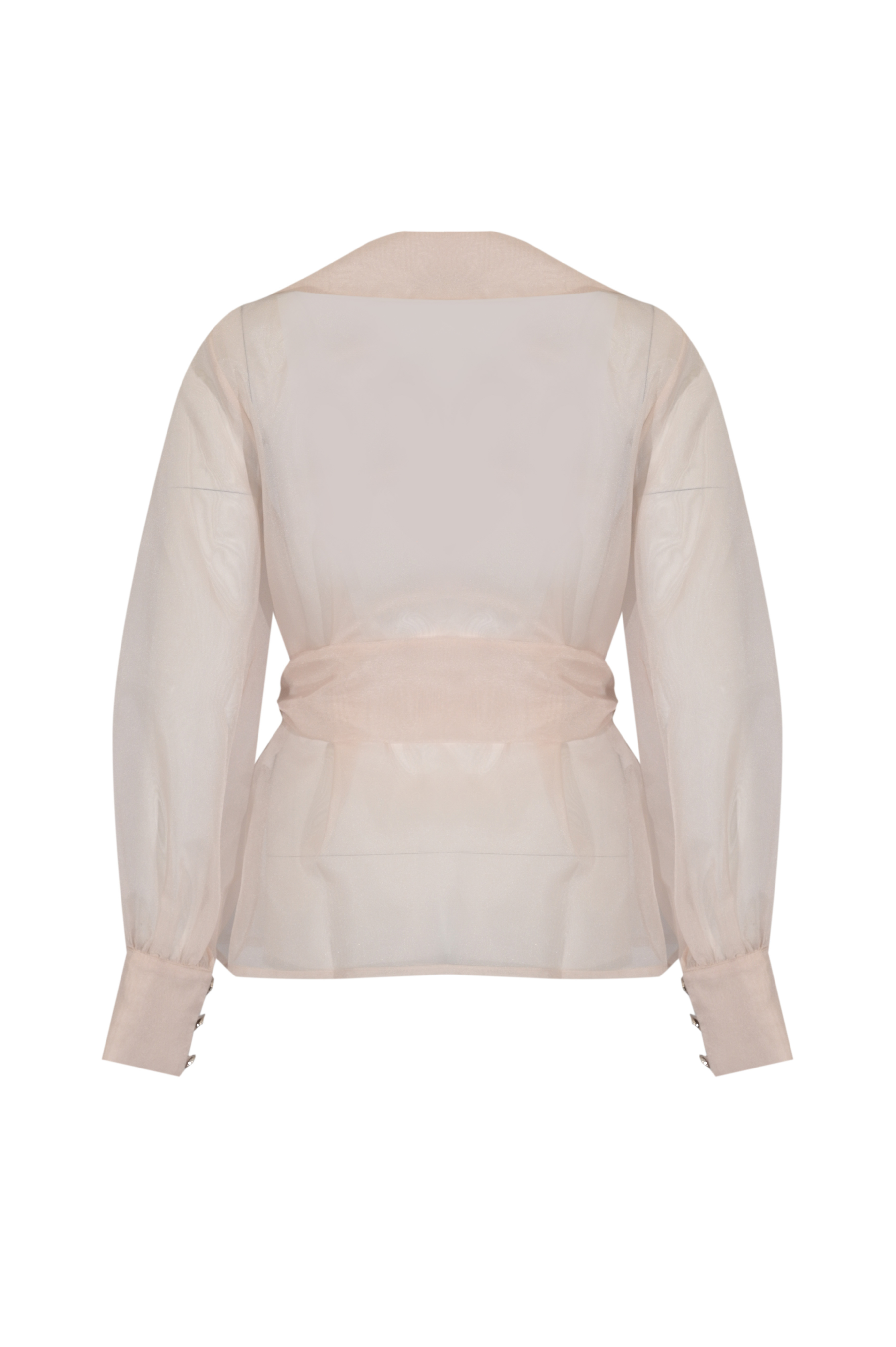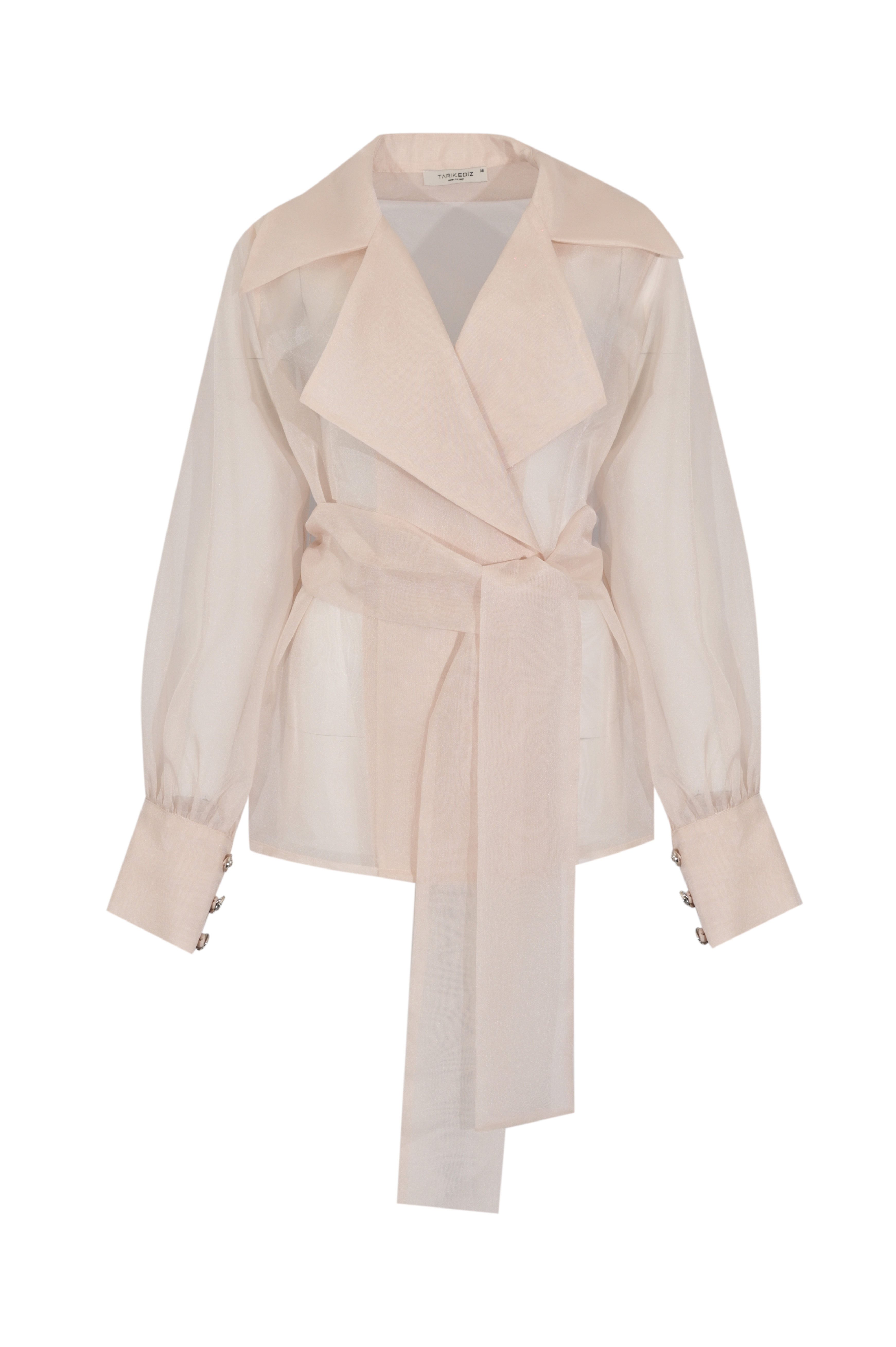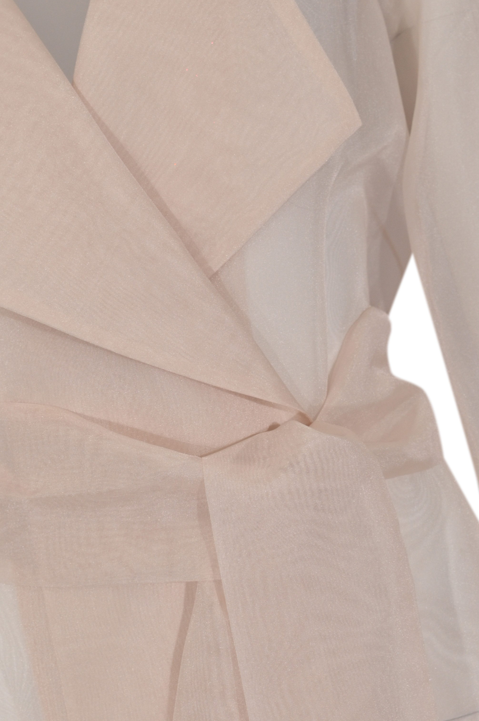 - Dettagli: giacca semi trasparente dal design elegante e leggero, cintura tono su tono con nodo frontale che valorizza la silhouette, maniche leggermente arricciate con polsini strutturati e bottoni decorativi, linea fluida e sofisticata ideale per look formali o cerimonia
