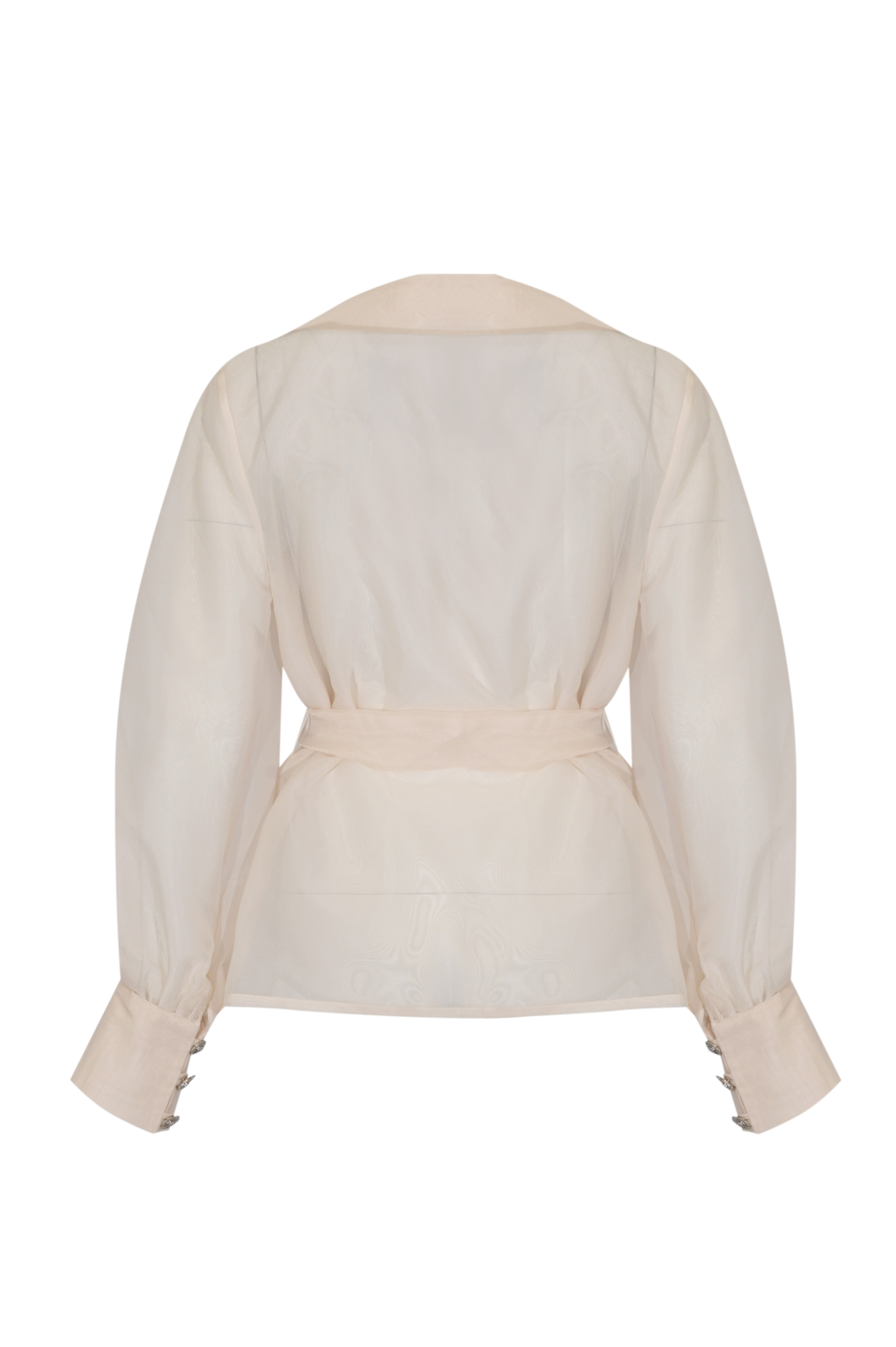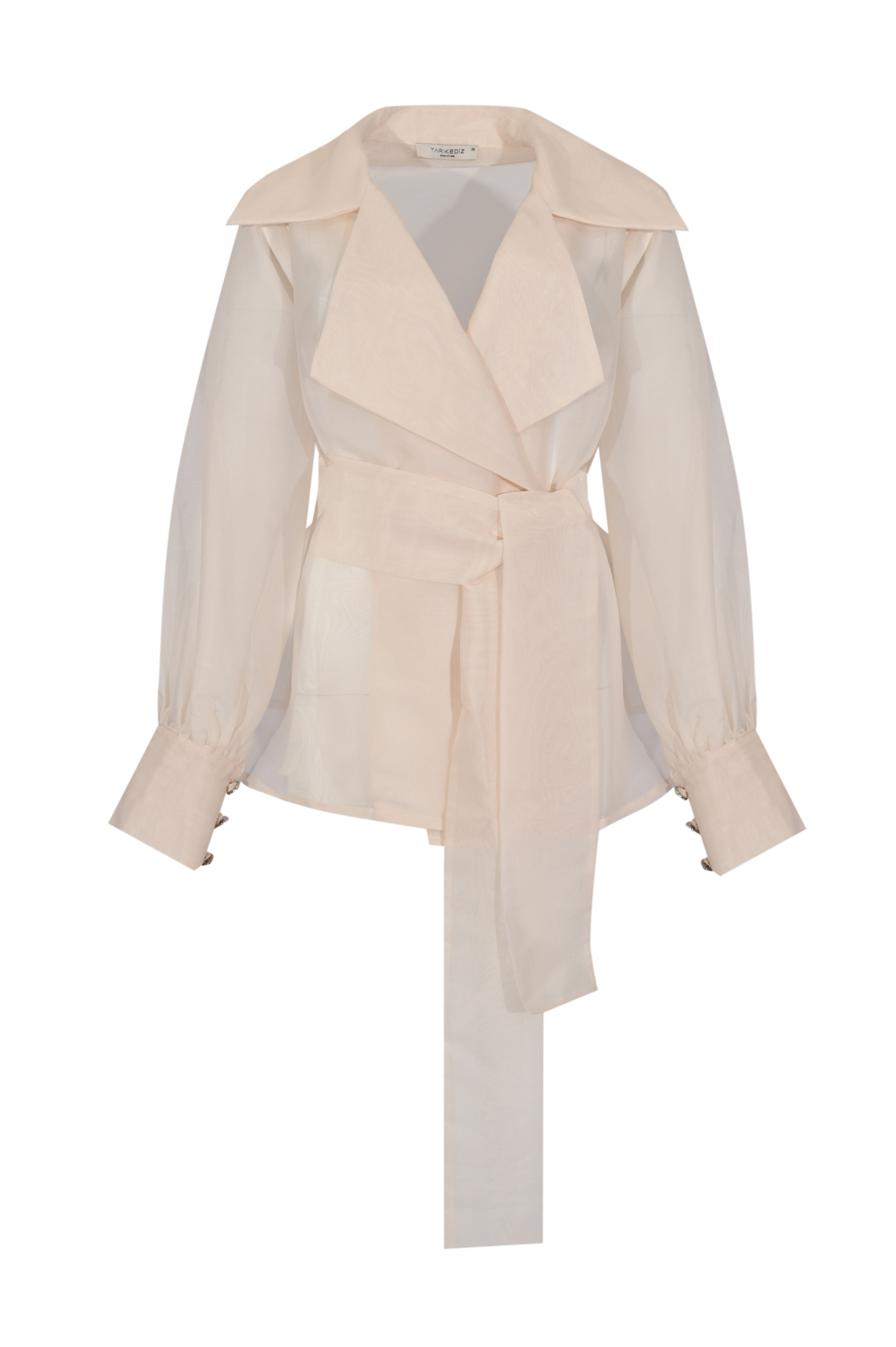 - Dettagli: giacca semi trasparente dal design elegante e leggero, cintura tono su tono con nodo frontale che valorizza la silhouette, maniche leggermente arricciate con polsini strutturati e bottoni decorativi, linea fluida e sofisticata ideale per look formali o cerimonia