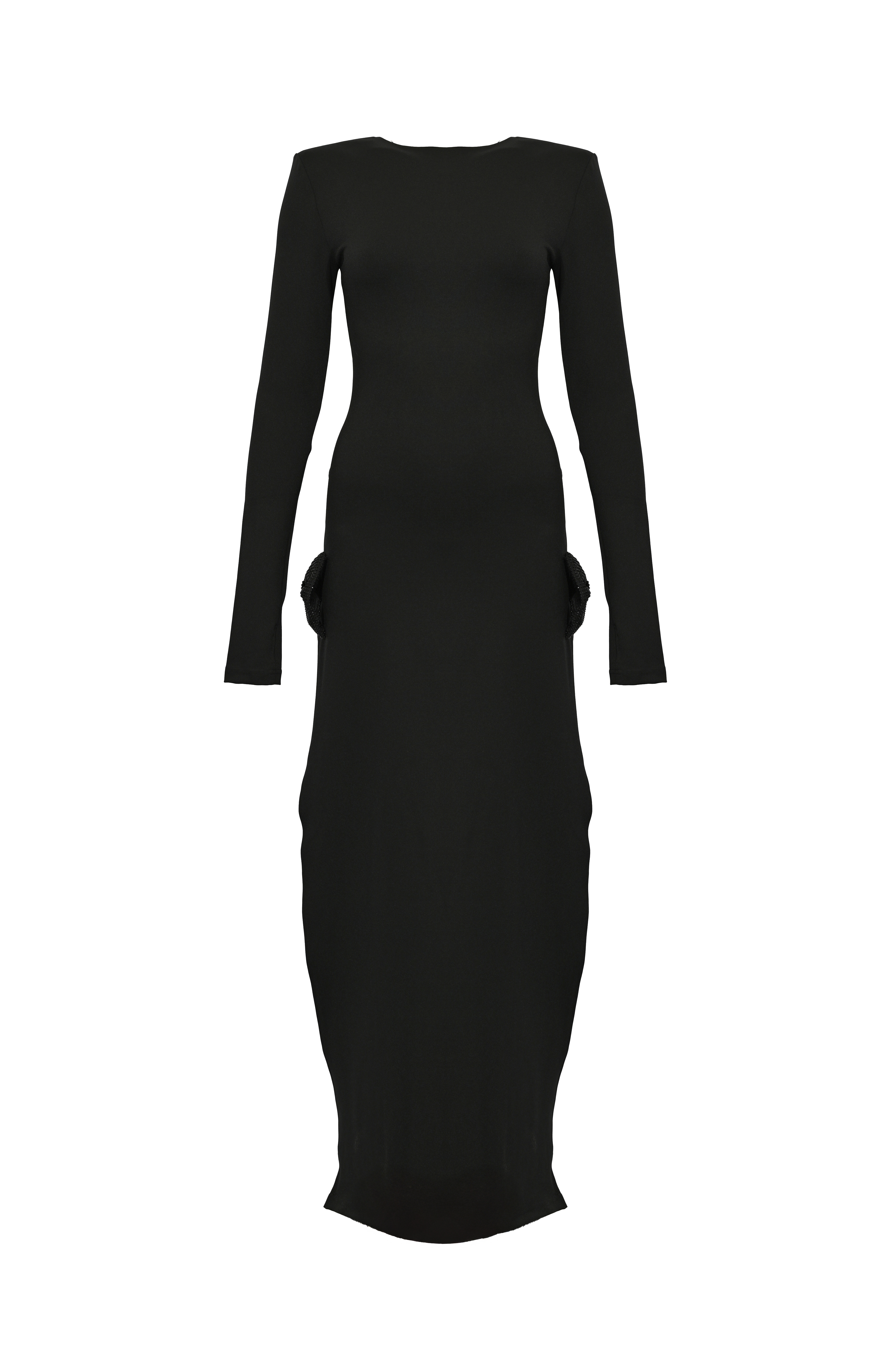 - Dettagli: silhouette lunga e aderente, taglio scivolato, fondo leggermente svasato, fiocchi tridimensionali laterali che valorizzano la linea del punto vita