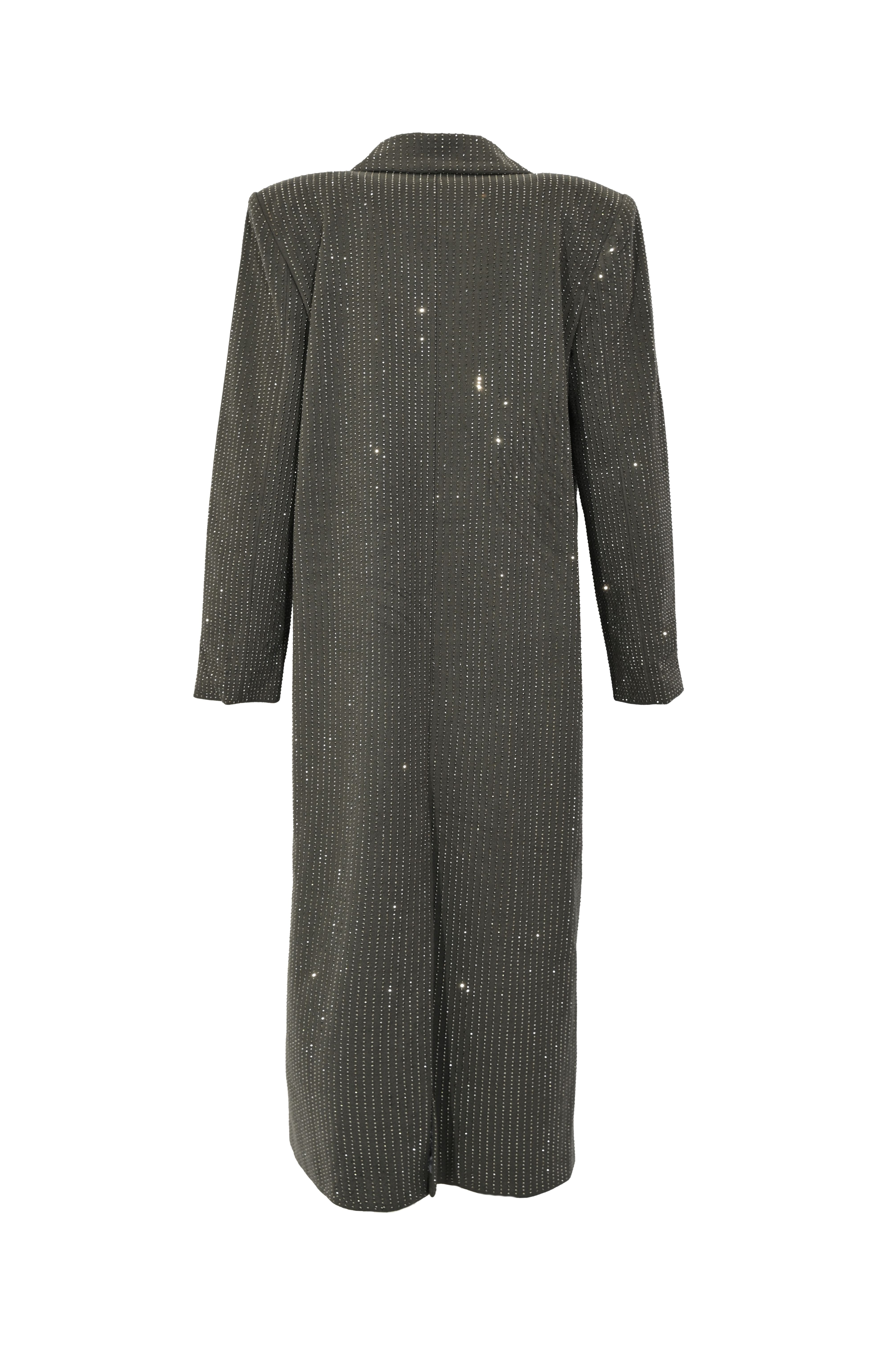 - Dettagli: lavorazione interamente ricamata con strass verticali, spacco posteriore per maggiore comfort, lunghezza midi, struttura dritta con spalle leggermente accentuate
