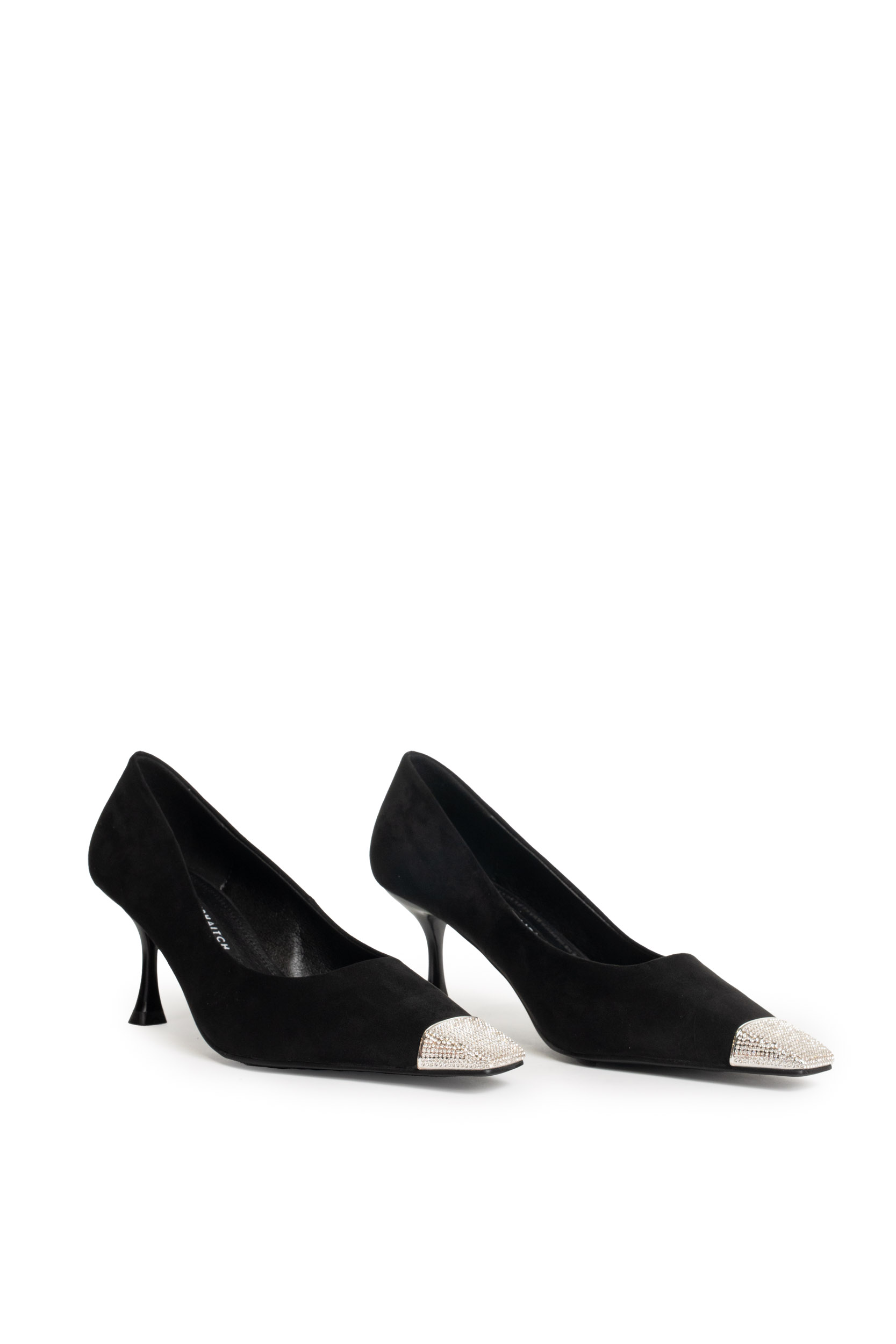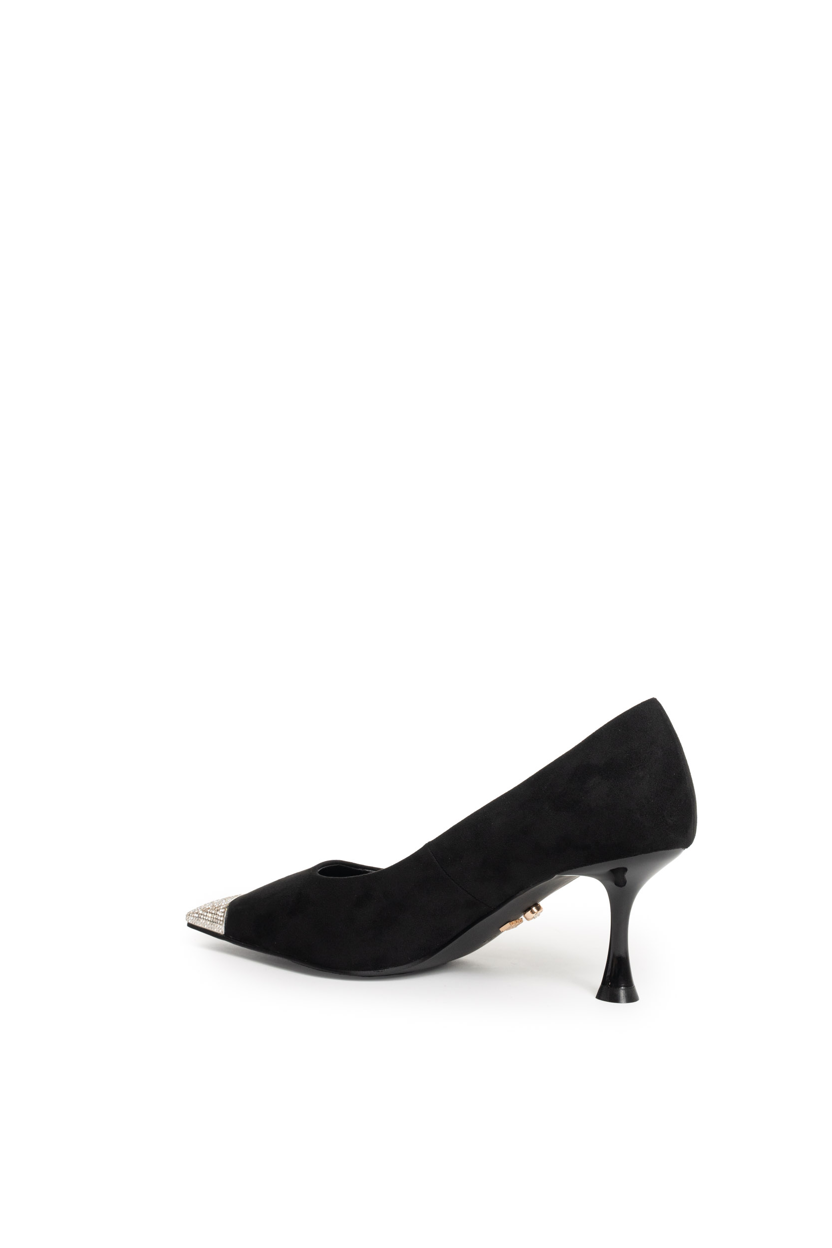 - Tomaia: In morbido camoscio nero con punta affusolata impreziosita da dettaglio gioiello in cristalli chiari.
