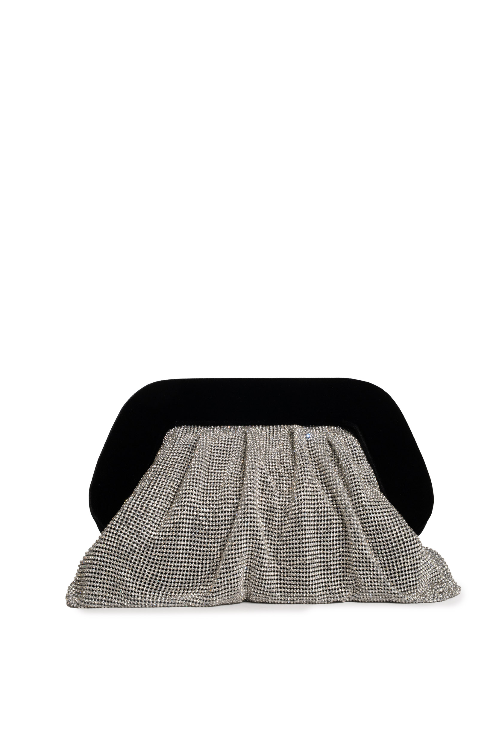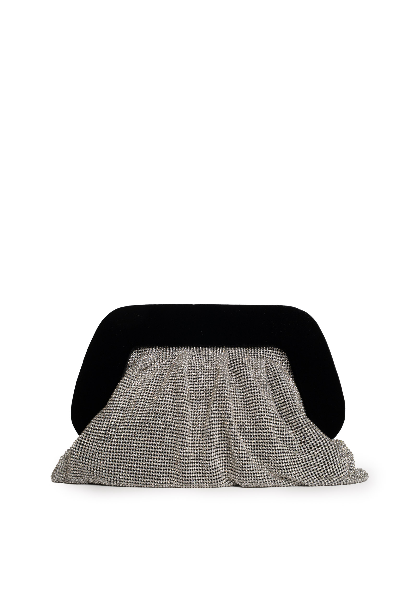 - Dettagli: Cornice superiore in velluto nero, corpo morbido in maglia di strass, finiture metalliche tono argento, silhouette plissettata