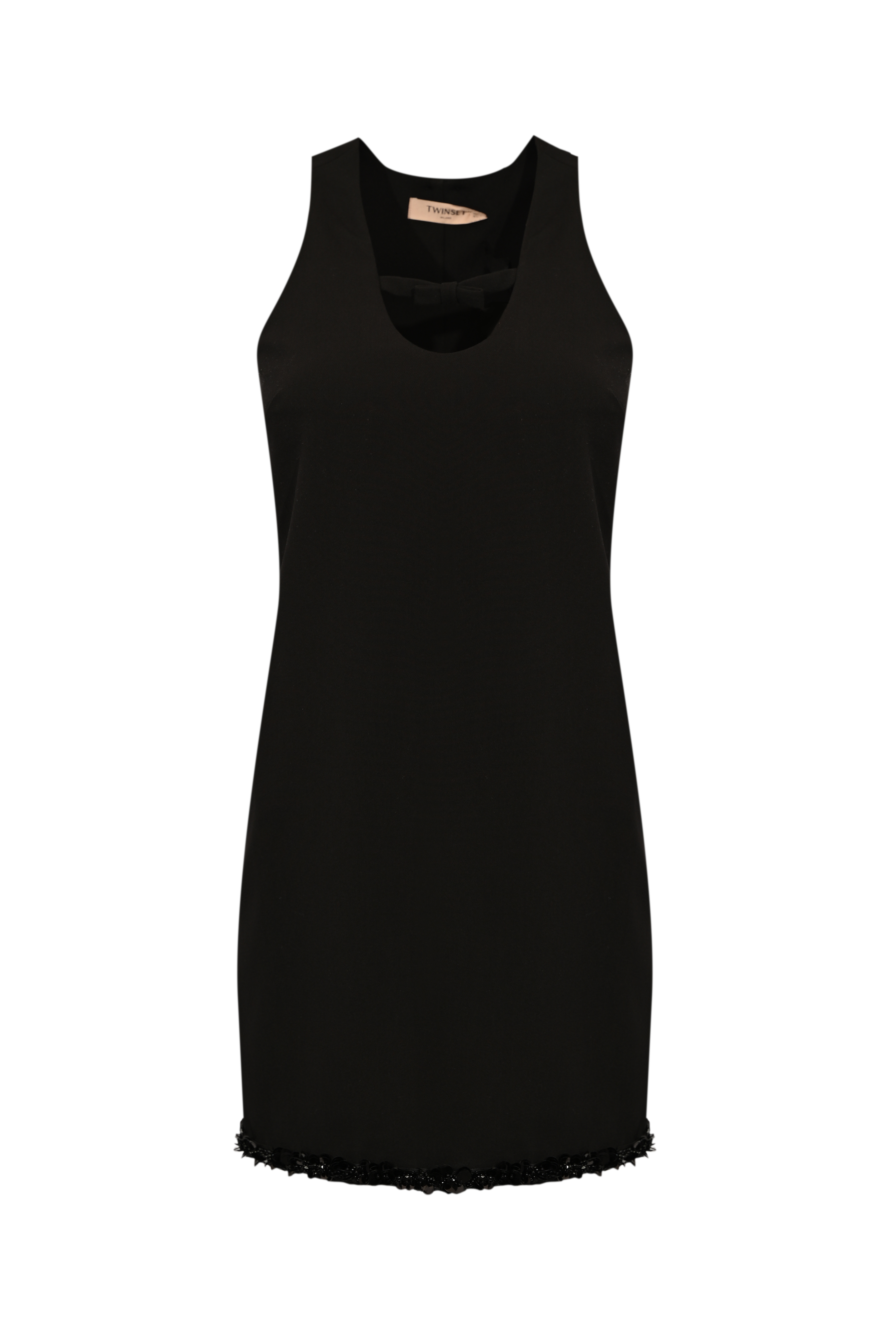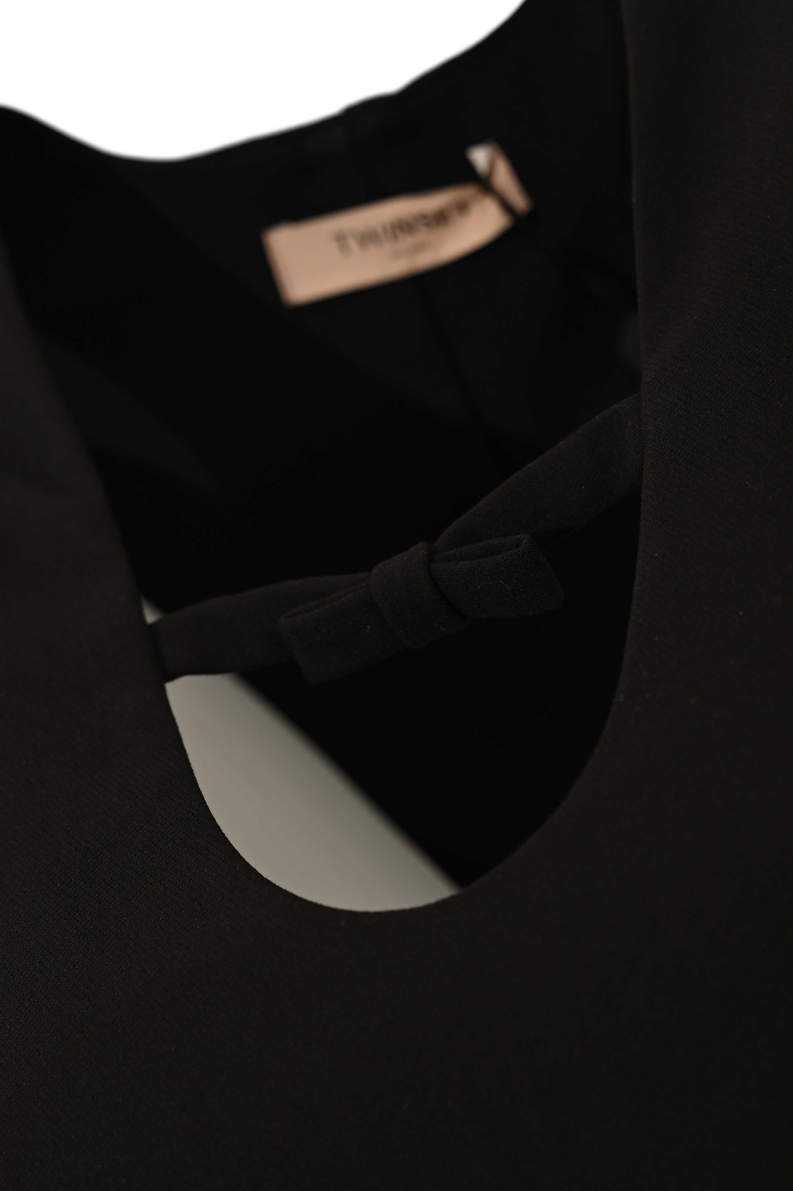- Collo: Girocollo con apertura posteriore a goccia e fiocco applicato
