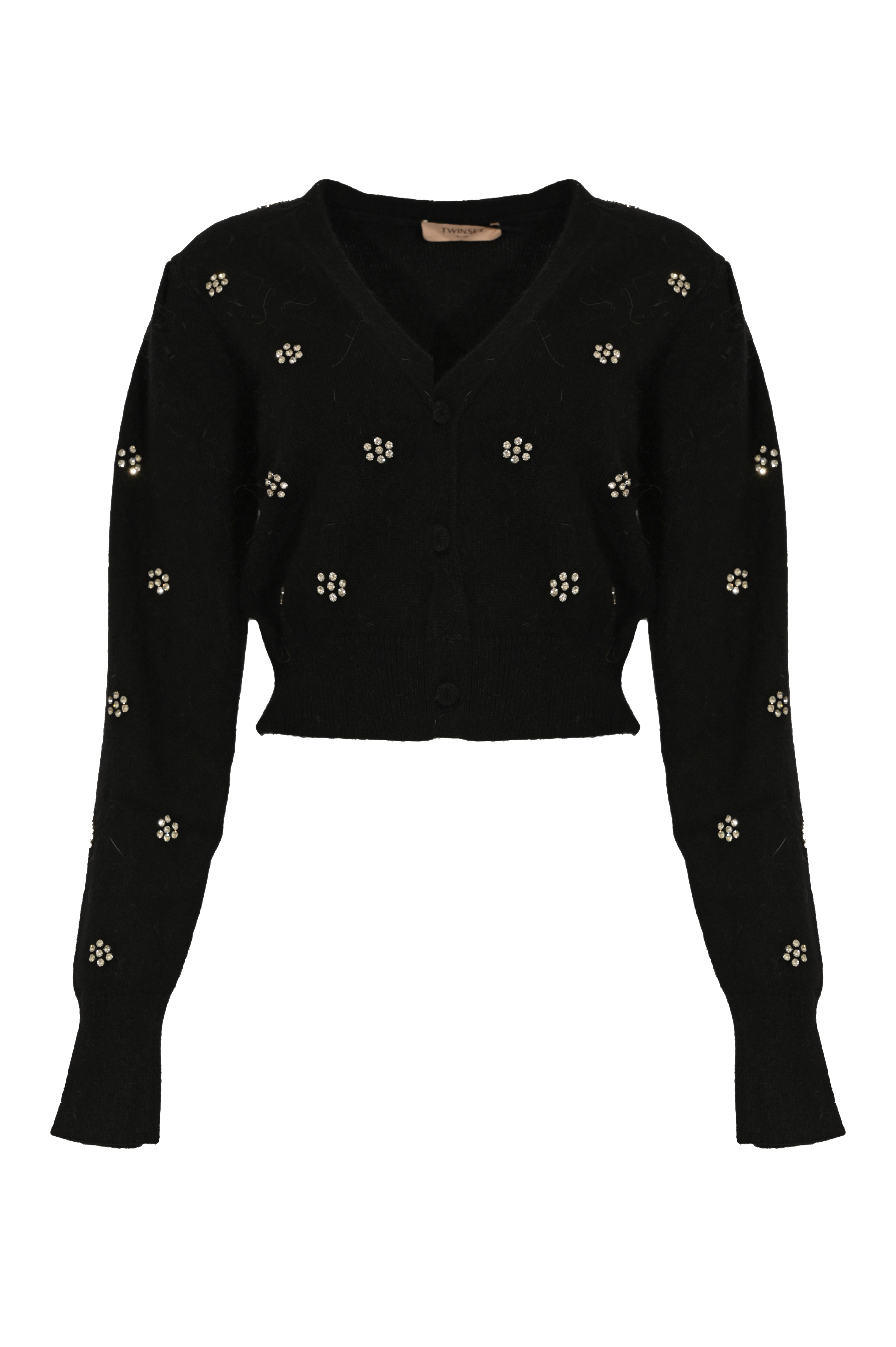 - Dettagli: applicazioni di perle e strass disposte a motivo floreale, bordo a costine su fondo e polsi, piccolo logo metallico dorato sul retro